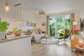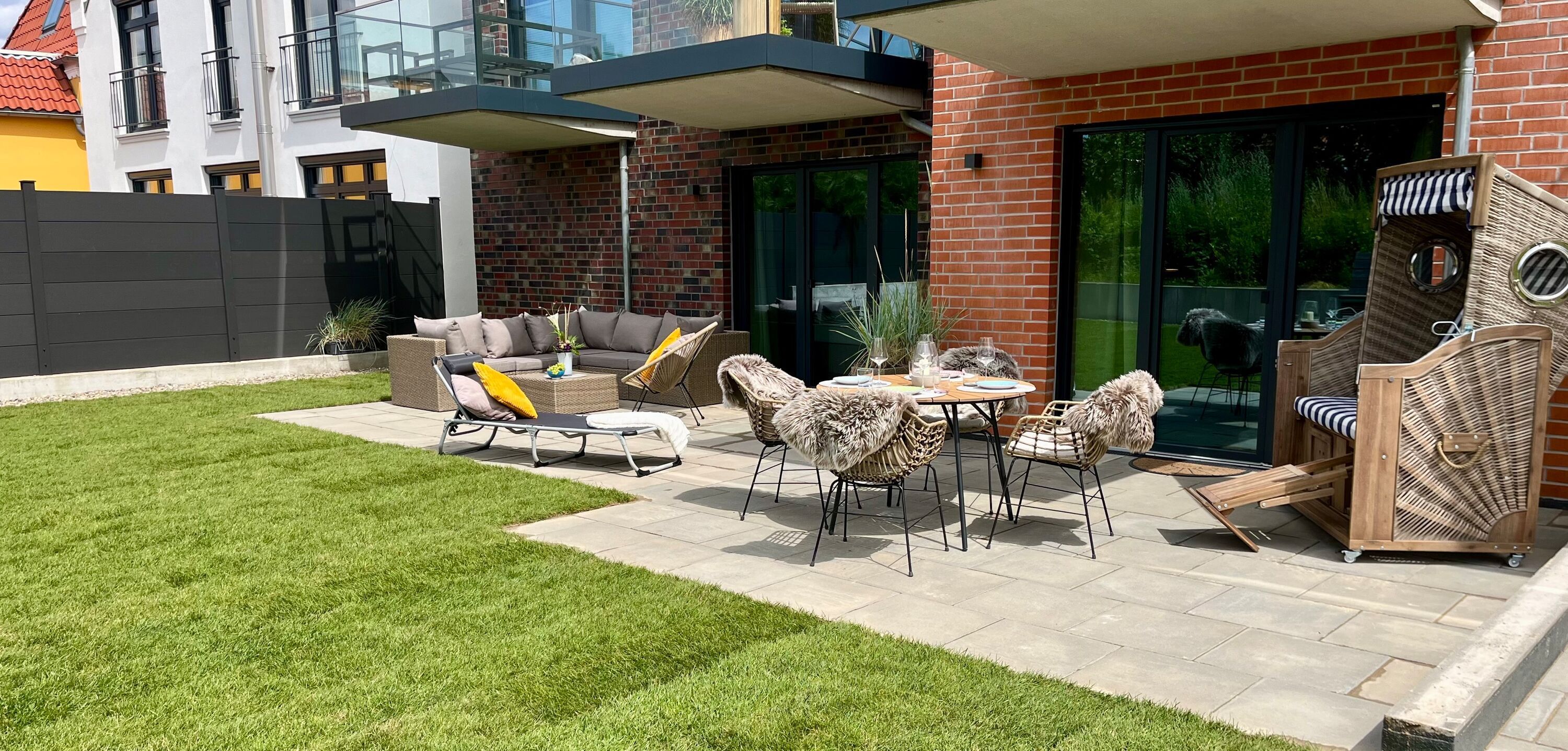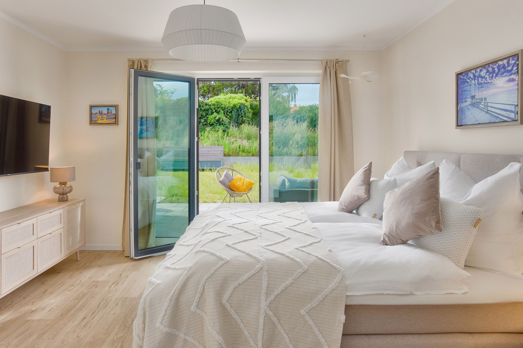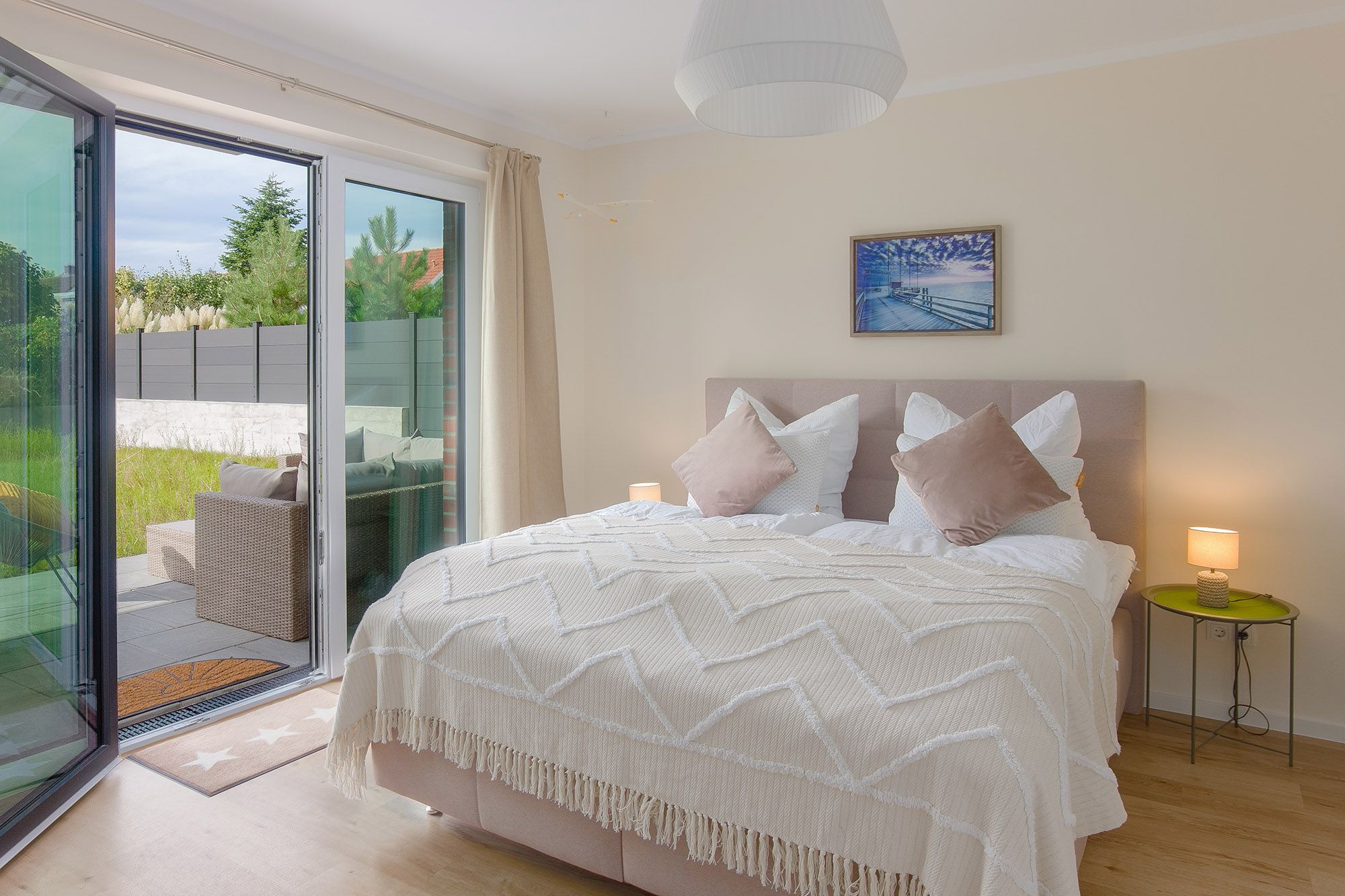 Das Besondere: Zum Erfrischen nach dem Saunagang braucht man nur noch die Terrassentüren des Schlafzimmers zu öffnen und schon kann man sich auf der großen Wohlfühl-Terrasse die Ostseebrise um die Nase wehen lassen.