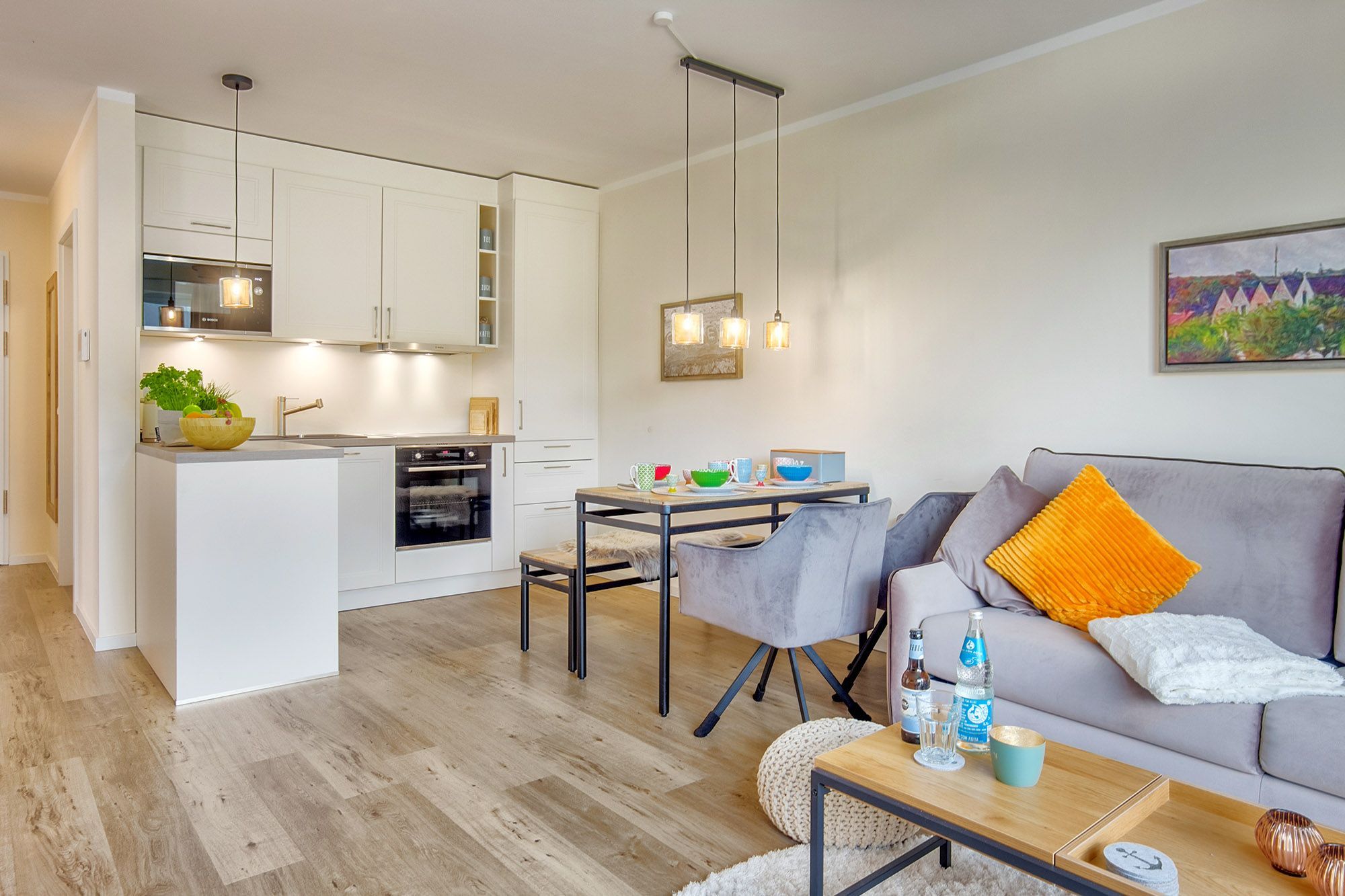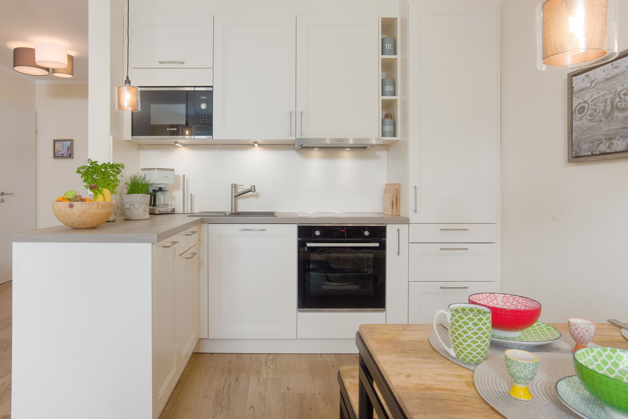 Die angrenzende für den Urlaubsbedarf voll ausgestattete Küchenzeile mit Esstisch für bis zu 4 Personen ist bestens geeignet für gemeinsame Kochsessions. Backofen, Geschirrspüler, Mikrowelle sowie ein Waschtrockner und ein Kinderhochstuhl stehen ebenfalls zur Verfügung.