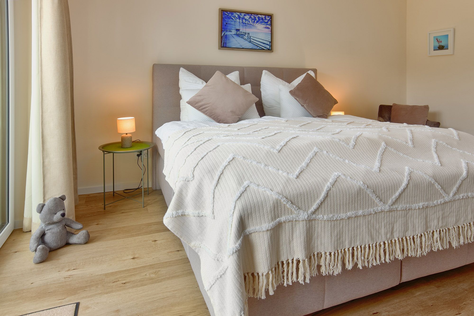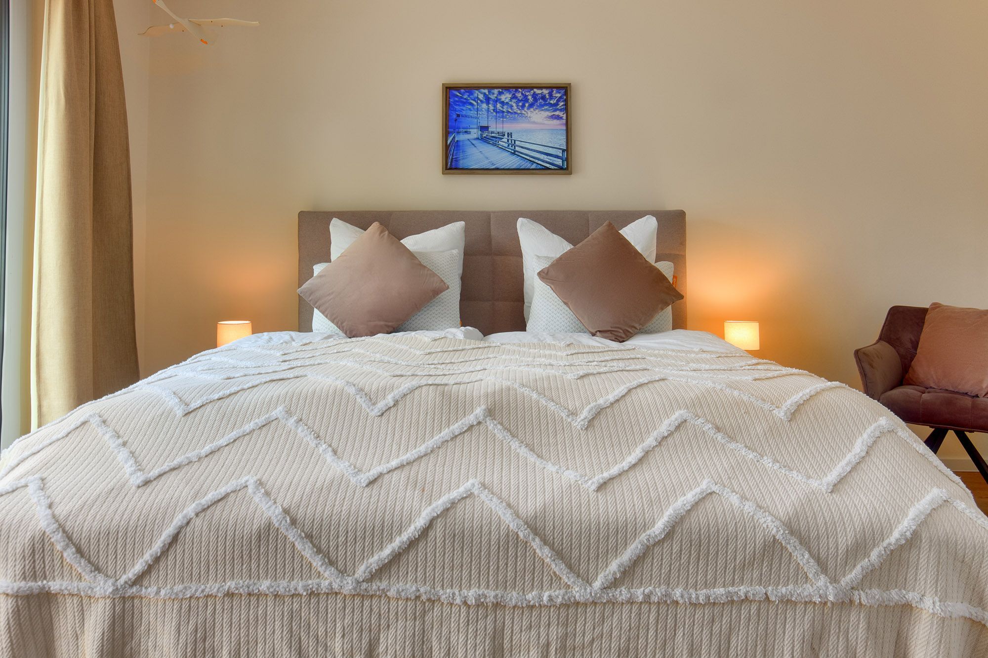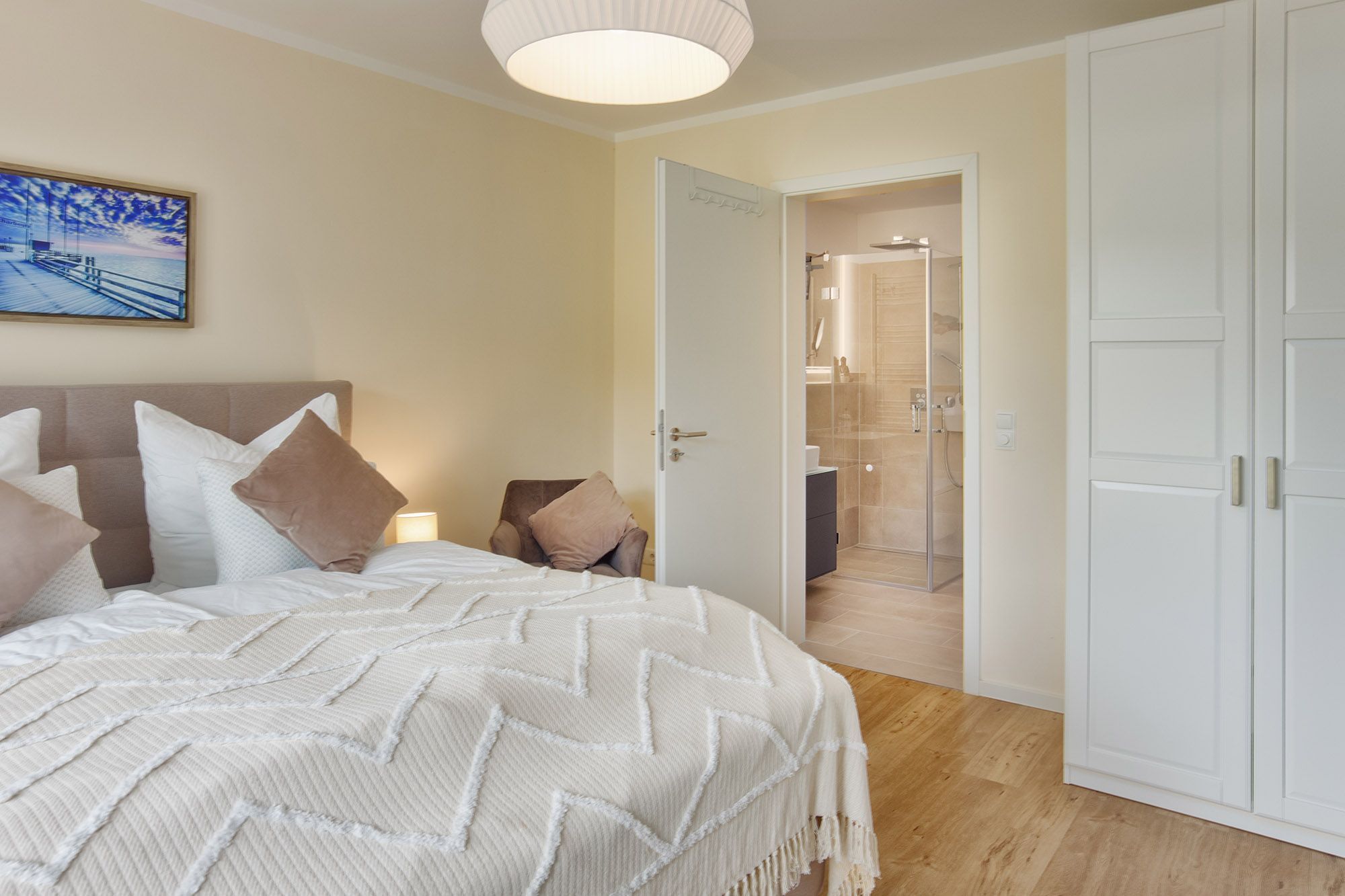 Vom Schlafzimmer mit Boxspringbett, Flat-Smart-TV und Verdunkelungsvorhängen für eine erholsame Nacht, gelangt man direkt ins Badezimmer mit ebenerdiger Dusche und angrenzender Sauna, die Sie in Ihrem Urlaub selbstverständlich nutzen dürfen.