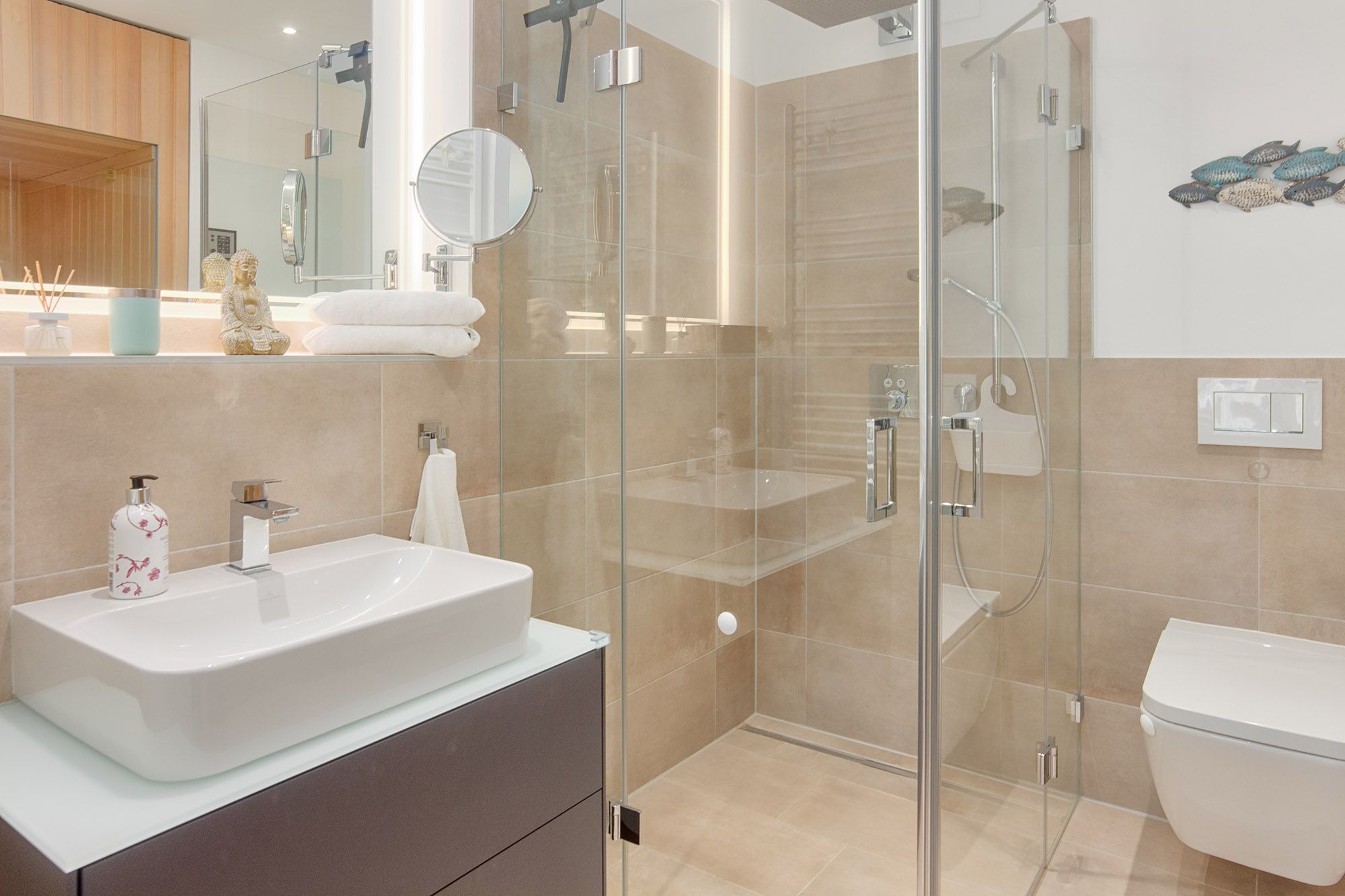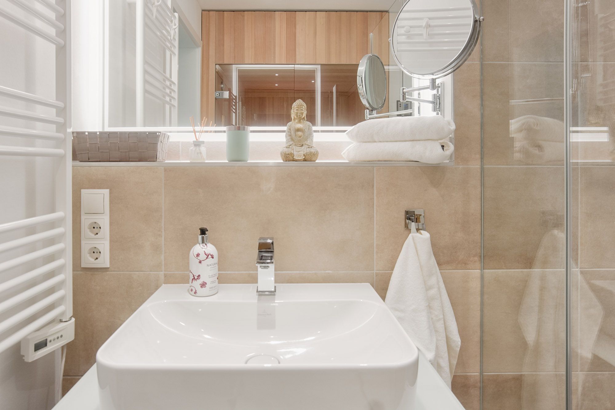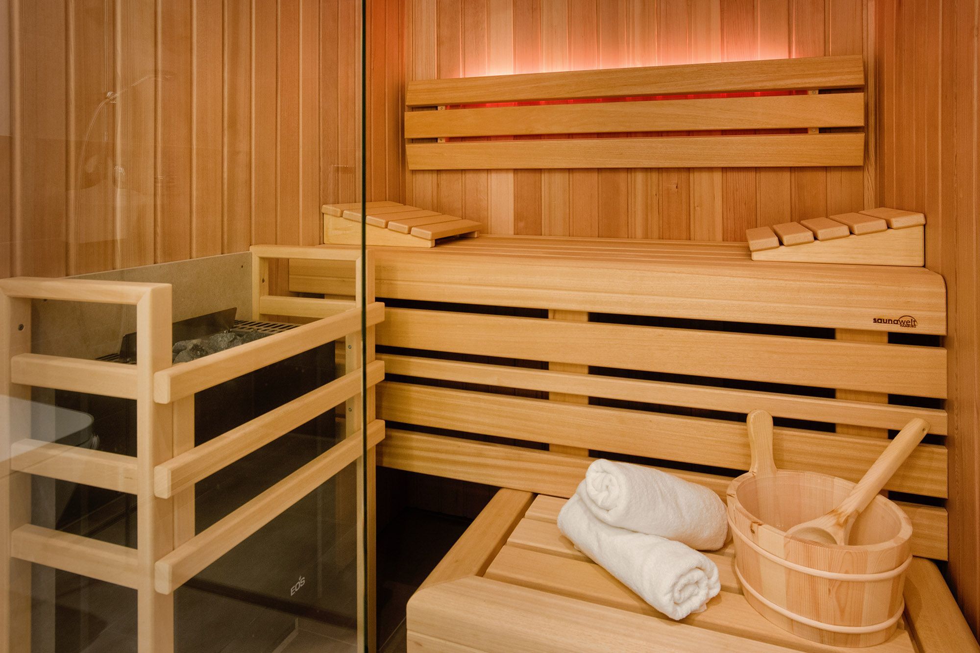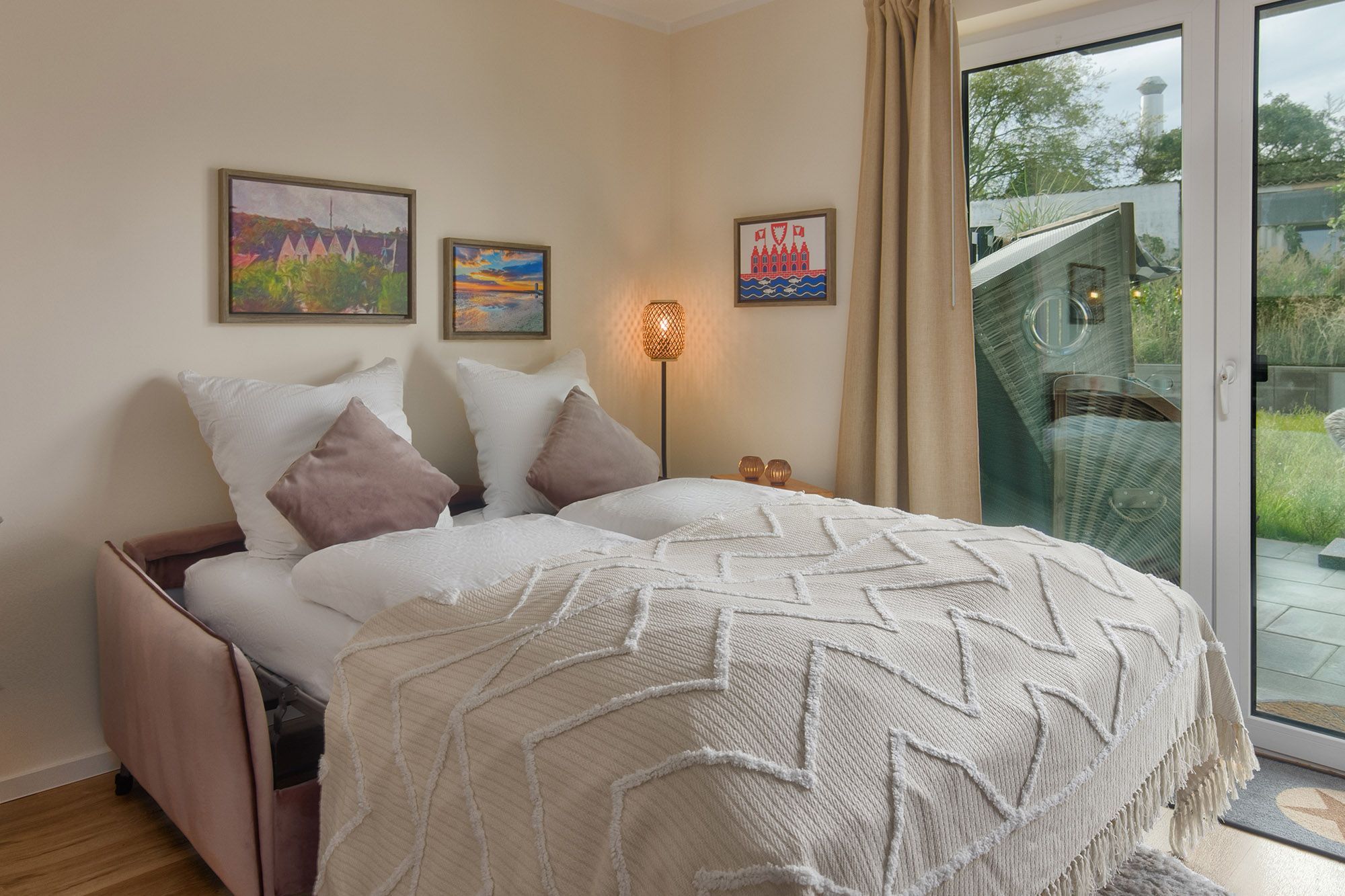Vom Schlafzimmer mit Boxspringbett, Flat-Smart-TV und Verdunkelungsvorhängen für eine erholsame Nacht, gelangt man direkt ins Badezimmer mit ebenerdiger Dusche und angrenzender Sauna, die Sie in Ihrem Urlaub selbstverständlich nutzen dürfen.