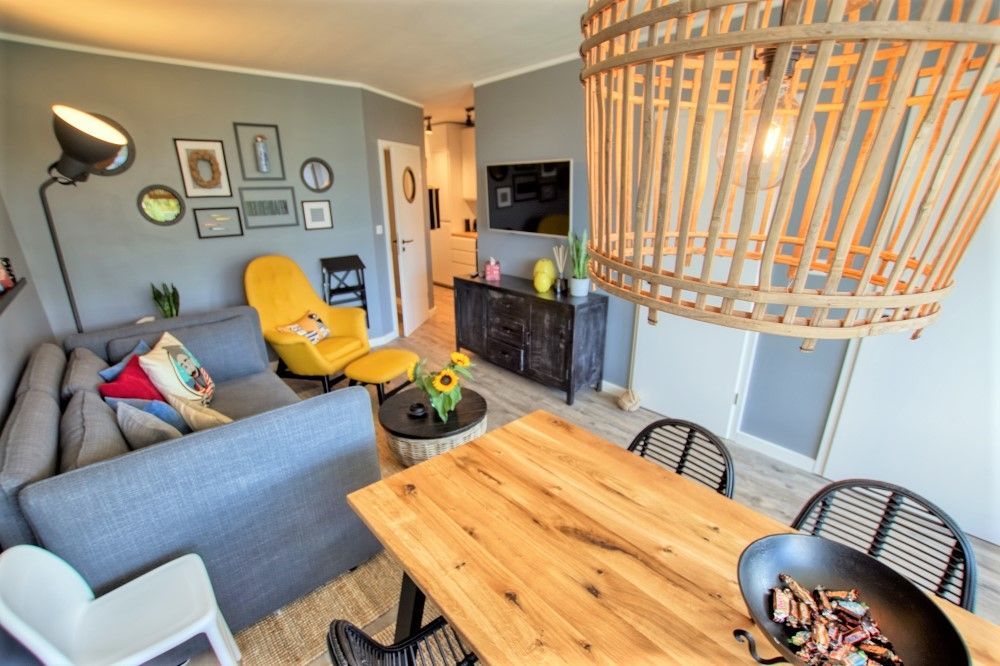 Wohnzimmer mit Schlafsofa (für 2 Personen), Smart-TV und Esstisch vor dem Balkon
