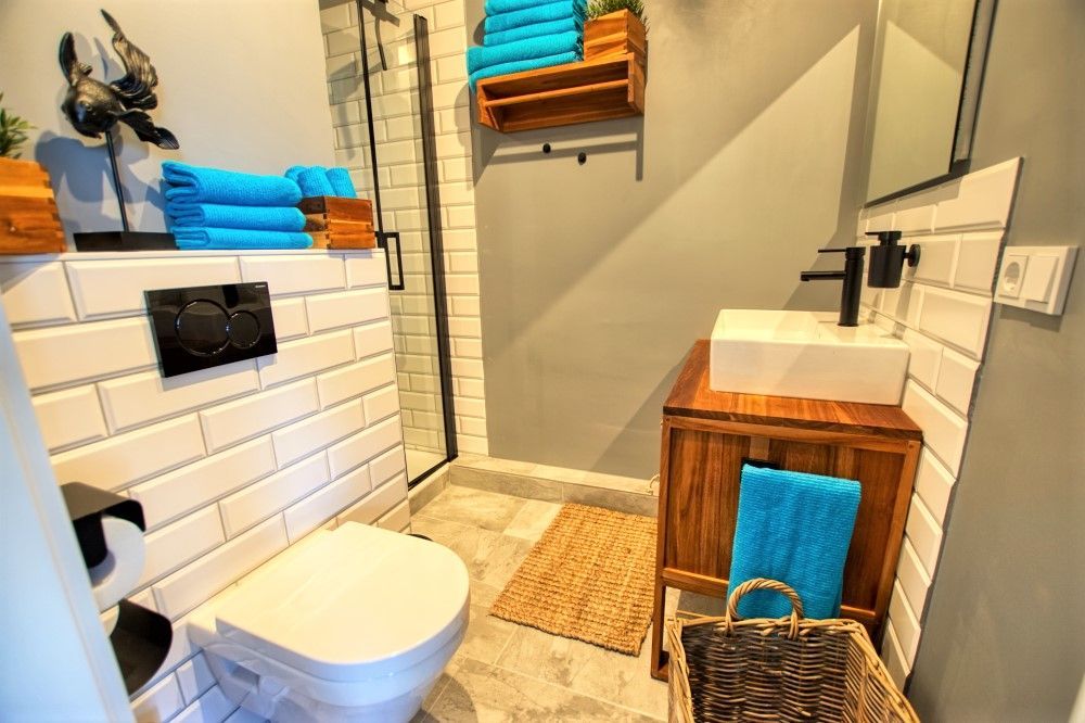 Badezimmer mit Duschkabine mit niedrigem Einstieg, Handtuchtrockner und WC