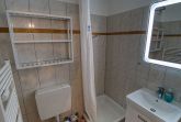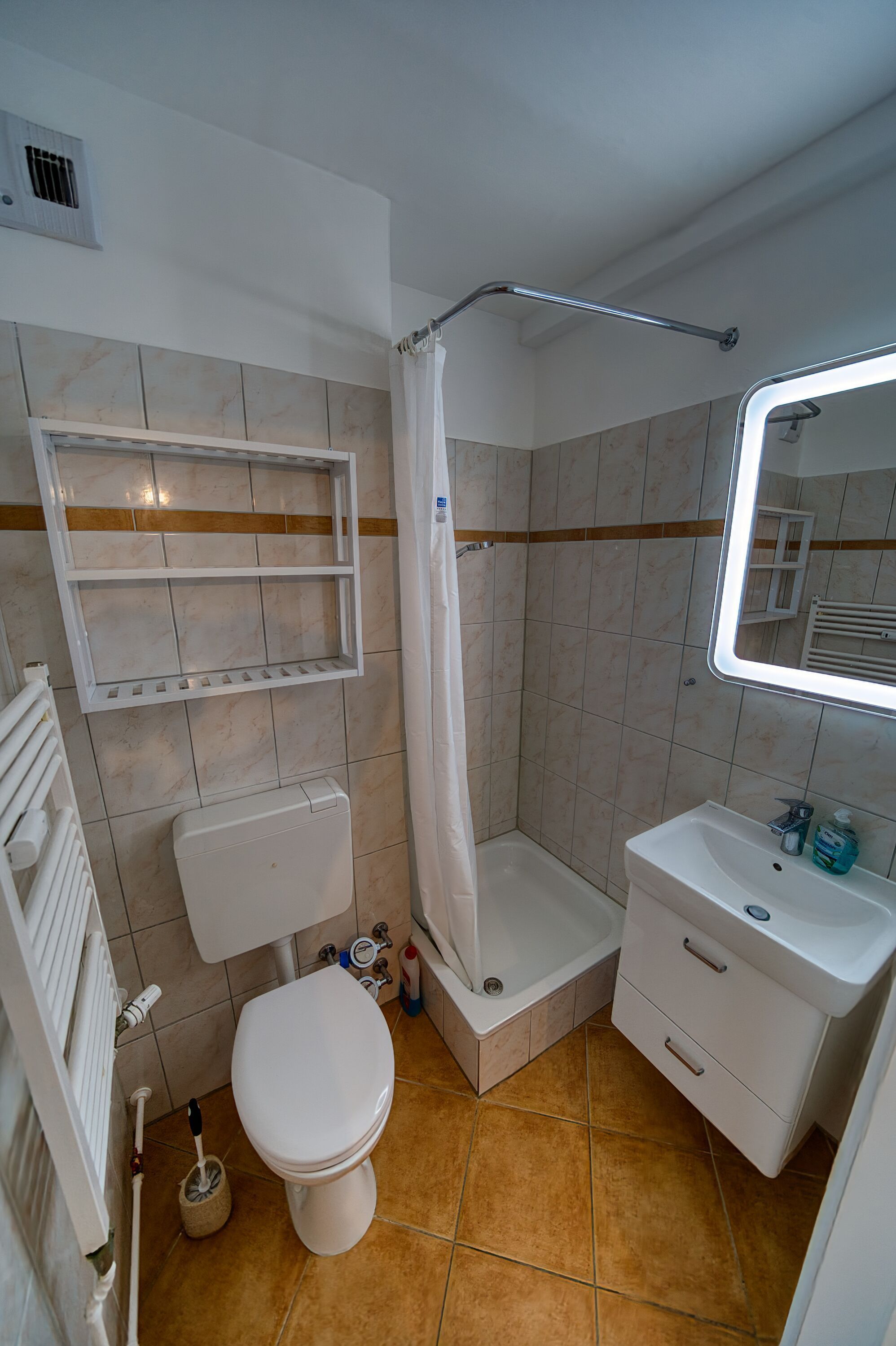 Badezimmer mit Dusche, WC und Handtuchtrockner