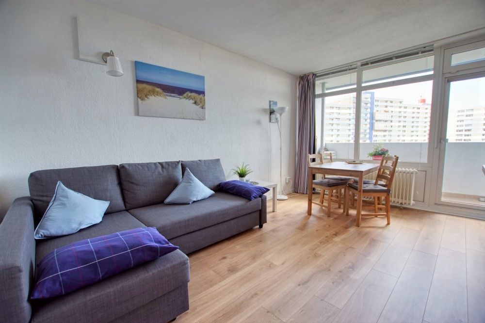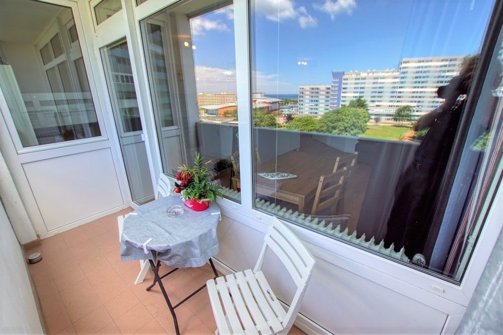 Die Wohnung liegt im Haus N Ferienpark, in der 6. Etage, mit Balkon zum Innenhof, der einen schönen Blick auf die Grünanlagen und die Ostsee bietet.