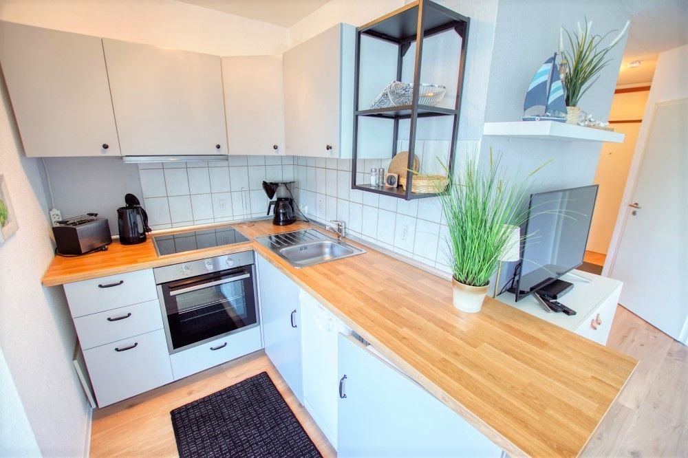 Küche: Komplett eingerichtet mit Kühlschrank, Spülmaschine, Kaffeemaschine, 4-Plattenherd und Backofen