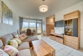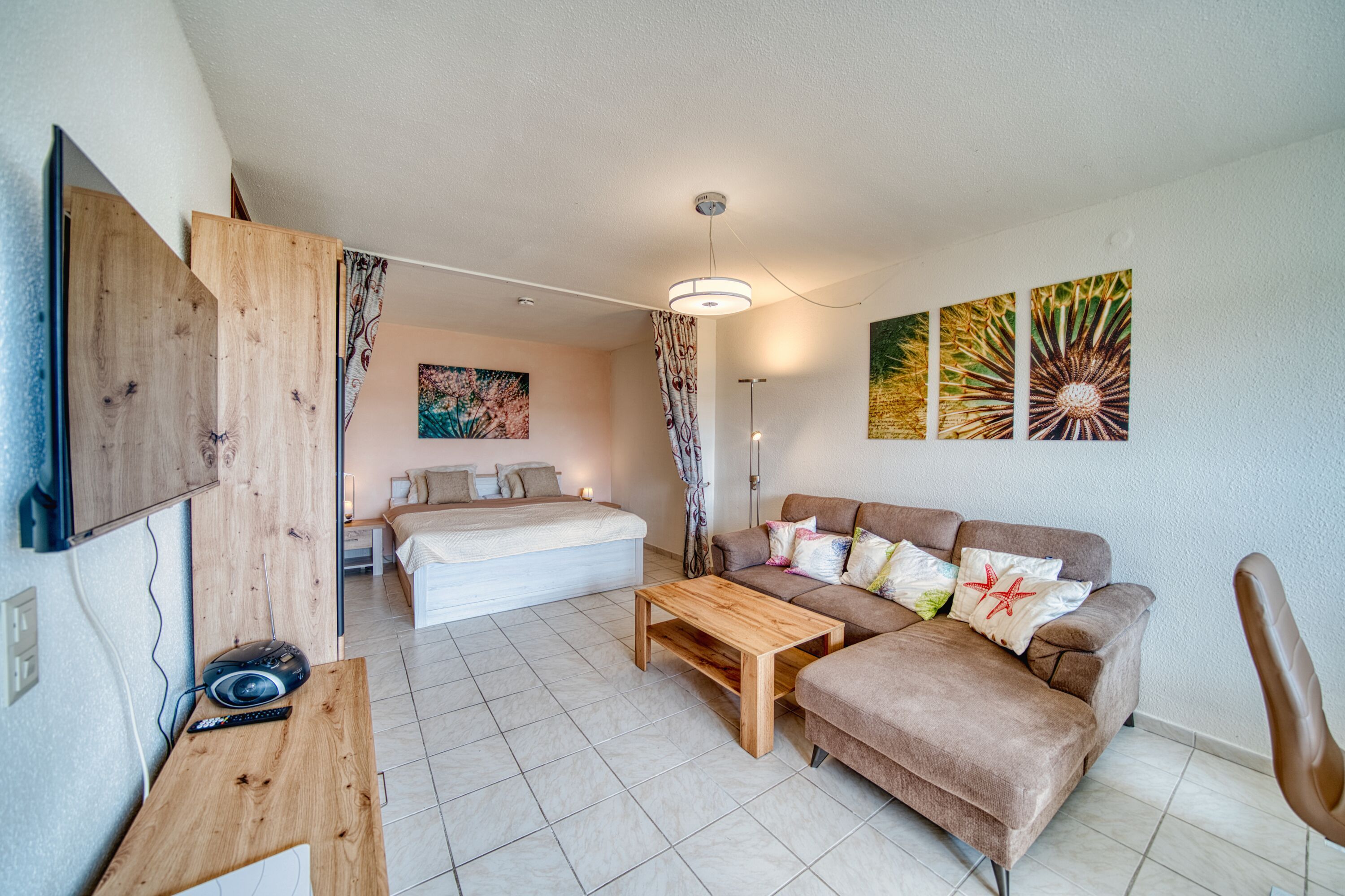 Wohn-Schlafraum mit Doppelbett, Ecksofa, Esstisch vor dem Balkon und Smart-TV