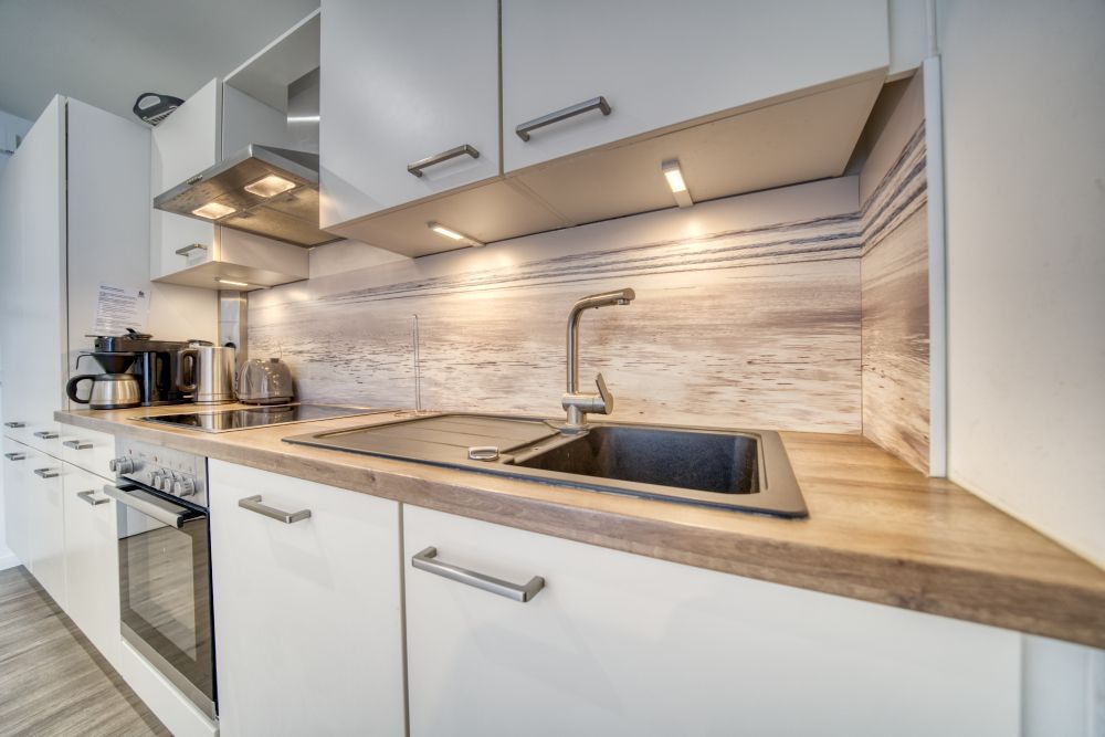 Küche im Eingangsbereich mit Ceranherd, Backofen, Kühlschrank mit Gefrierfach, Geschirrspüler, Filterkaffeemaschine, Toaster und Wasserkocher