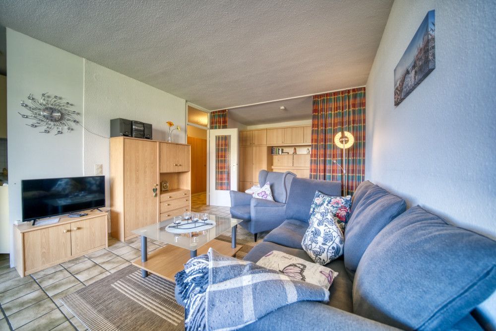 Wohn-Esszimmer mit Schlafcouch und Fernseher