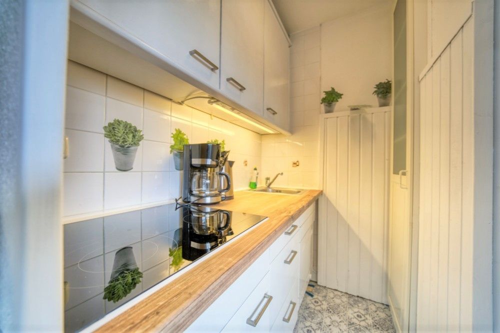 Küche mit Ceranherd, Kühlschrank mit Gefrierfach, Geschirrspüler, Mikrowelle, Toaster, Filterkaffeemaschine und Wasserkocher