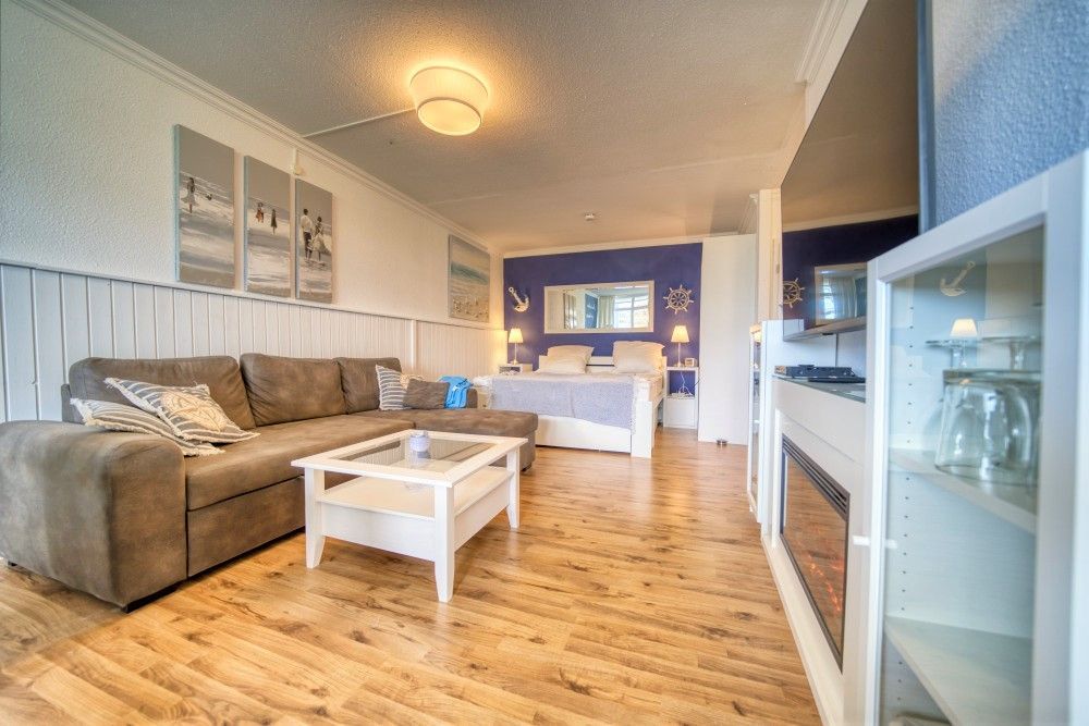 Wohn-Schlafraum mit Doppelbett, Ecksofa, großem Smart-TV und Esstisch vor dem Balkon