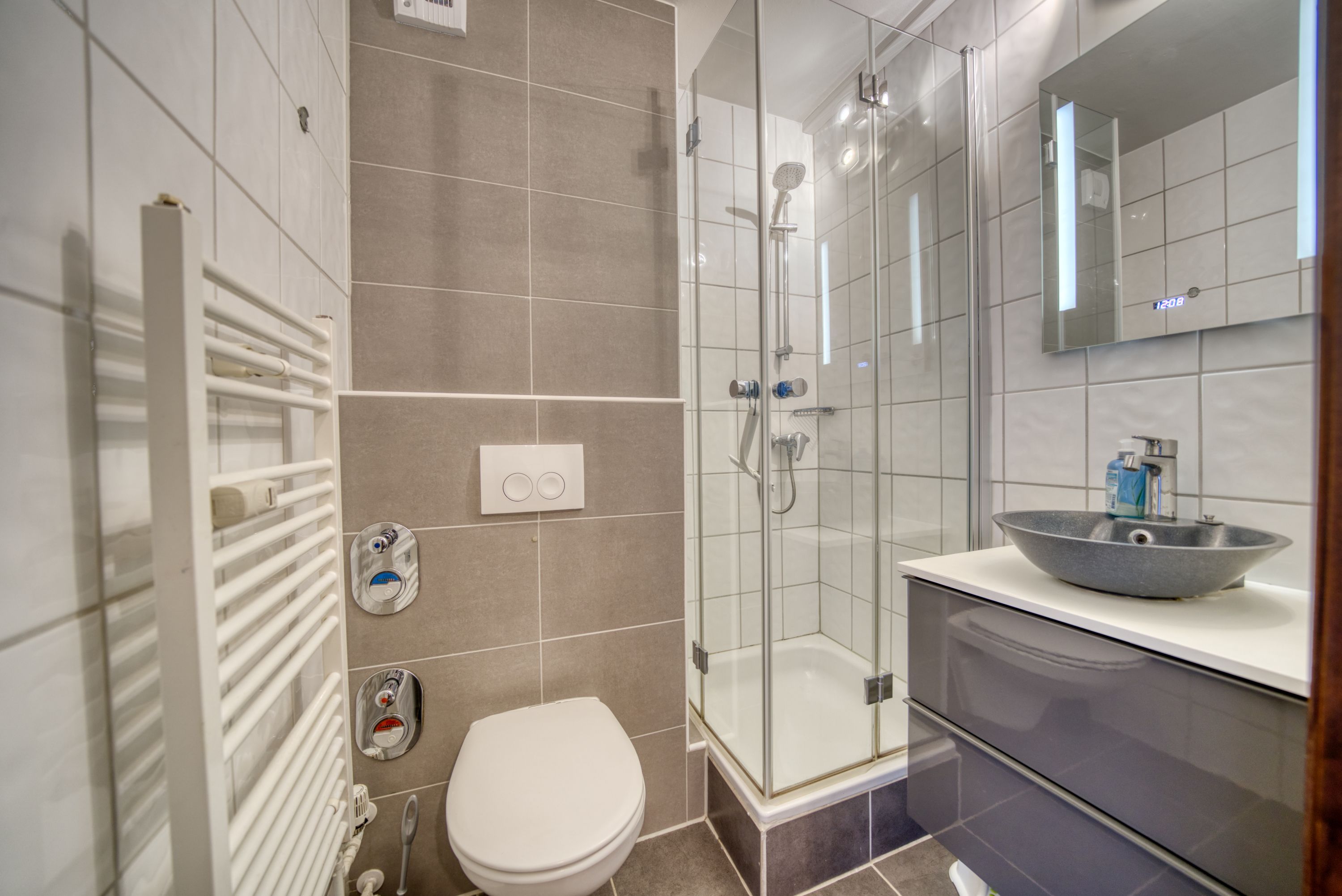 Badezimmer mit WC, Duschkabine und Handtuchtrockner
