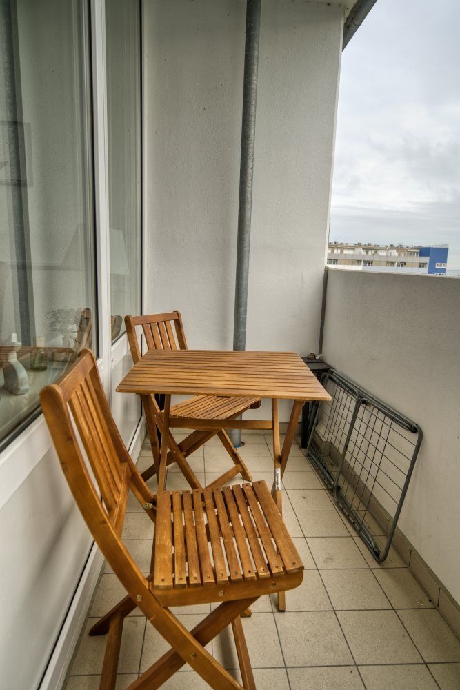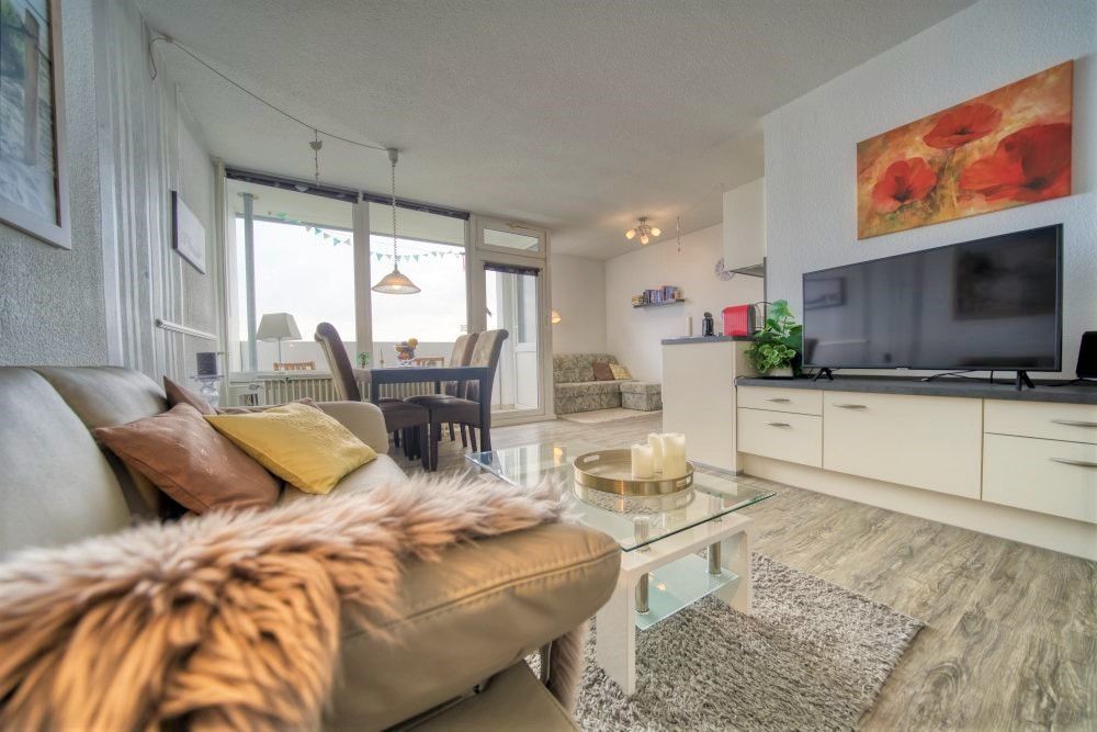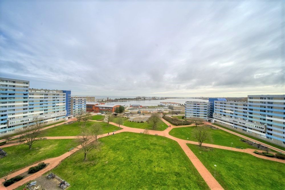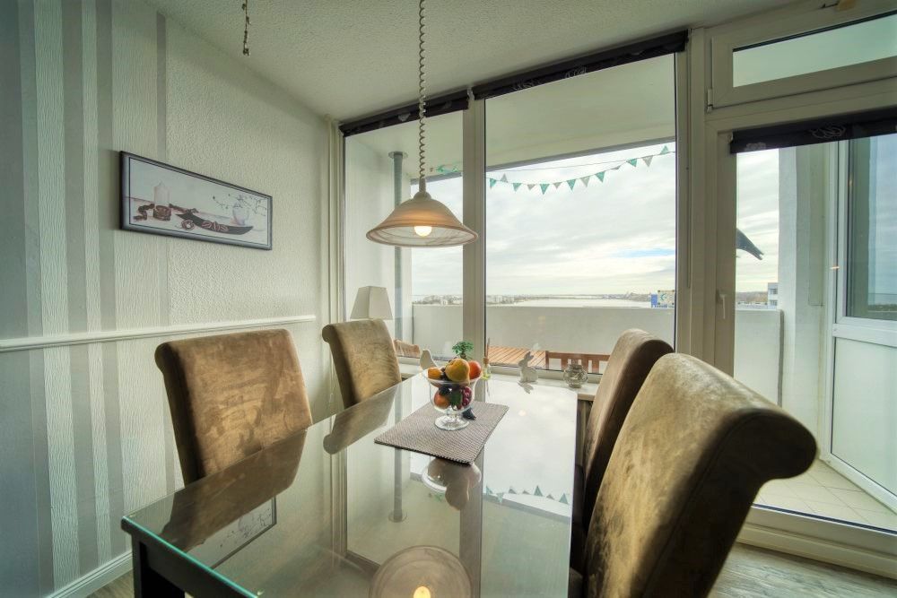 Die Wohnung liegt im Haus H Ferienpark, in der 9. Etage, mit Balkon zur Ostseite, der einen herrlichen Blick auf die Ostsee mit Fehmarnsundbrücke und den Binnensee mit Stadt und Yachthafen bietet.