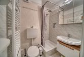 Badezimmer mit Dusche, WC und Handtuchtrockner