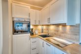 Küche mit Ceranherd, Backofen, Kühlschrank mit Gefrierfach und Geschirrspüler