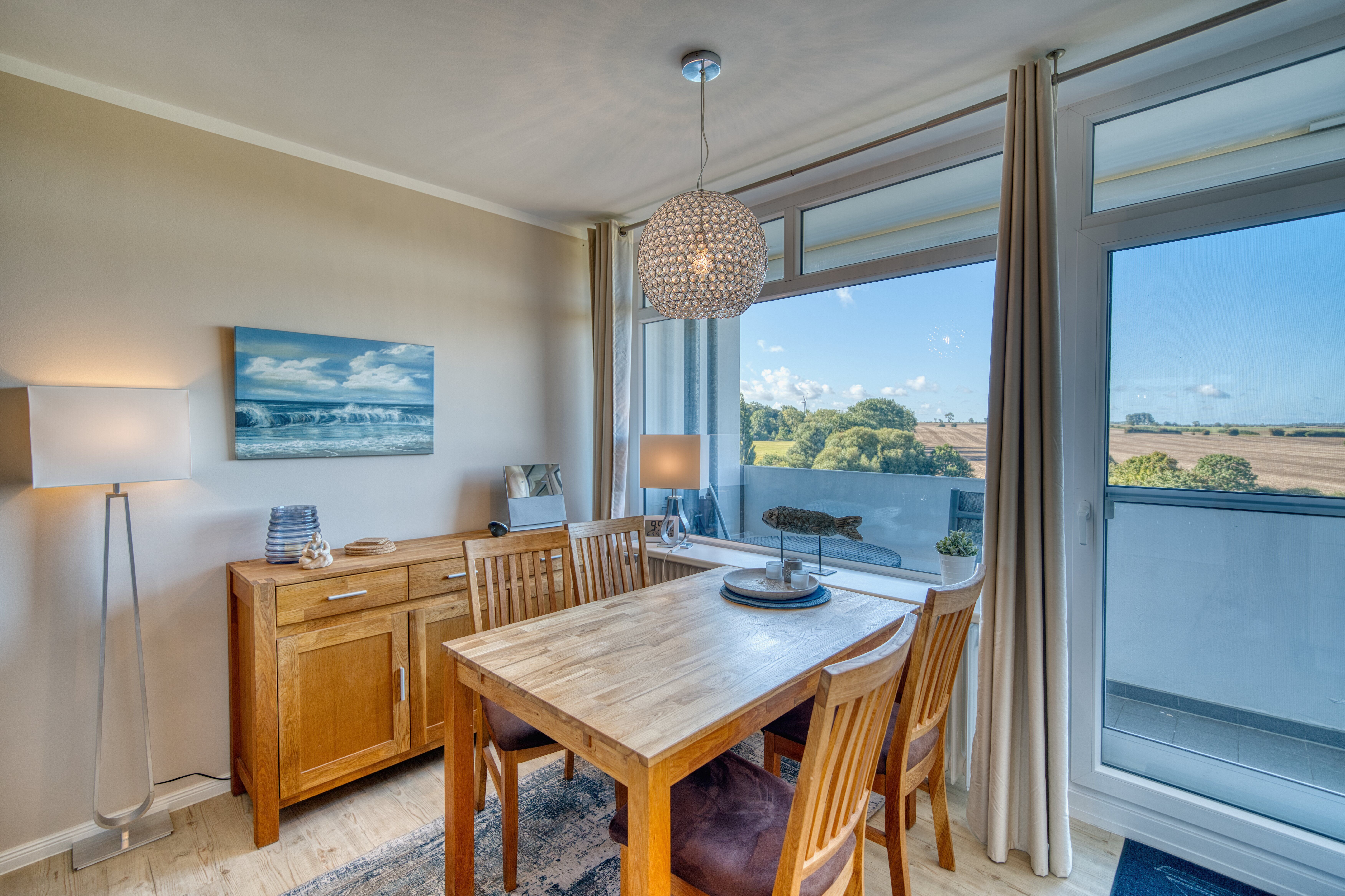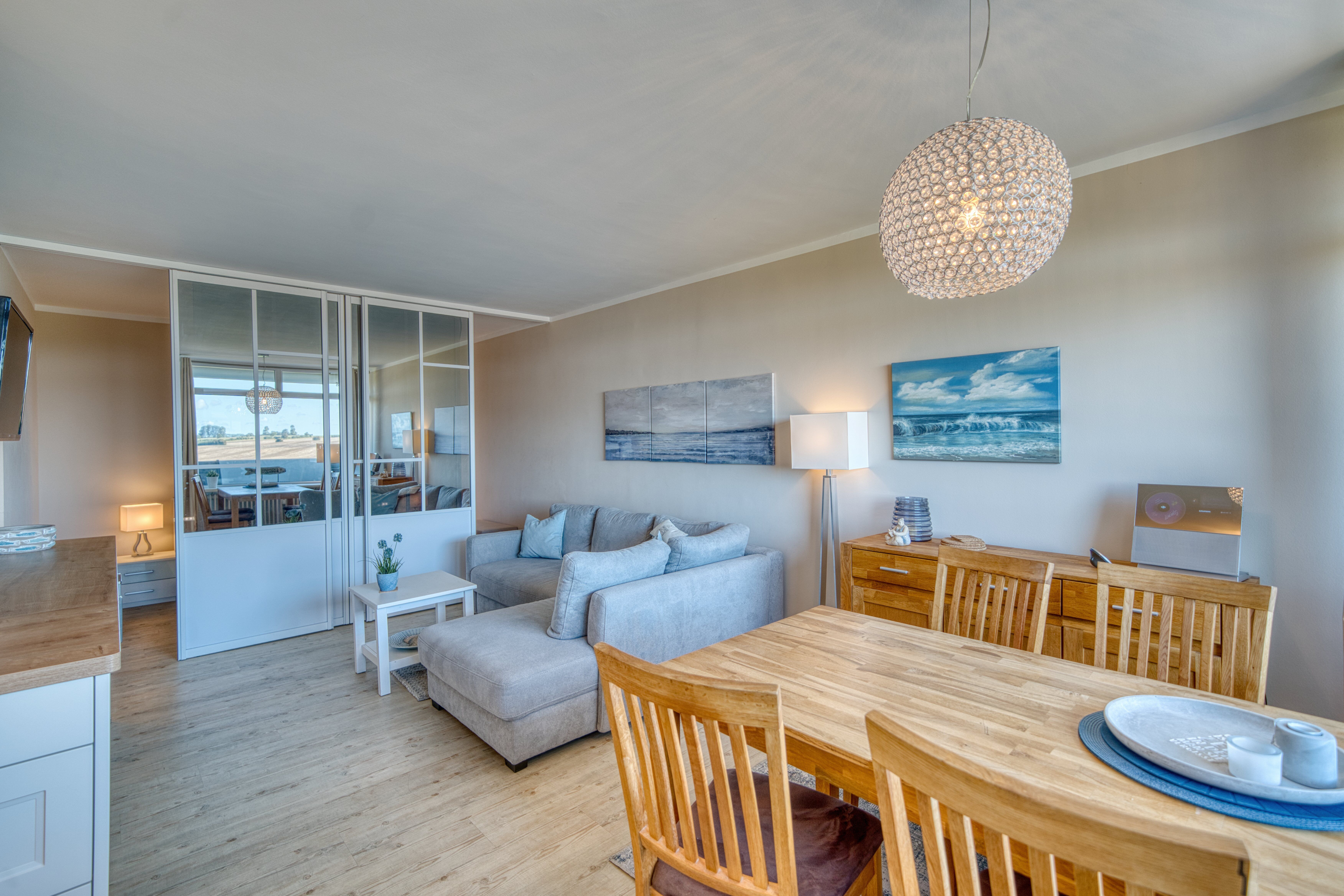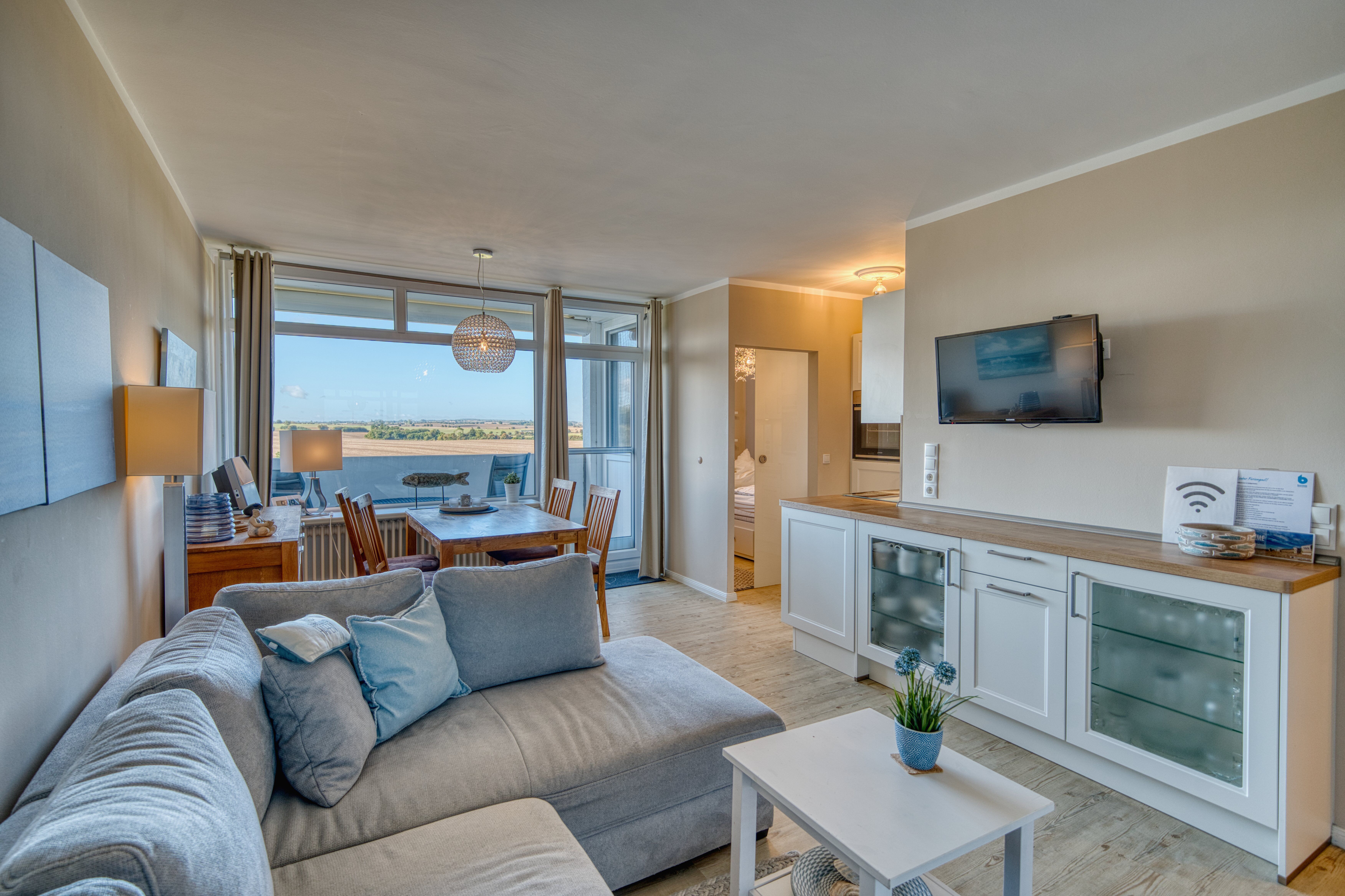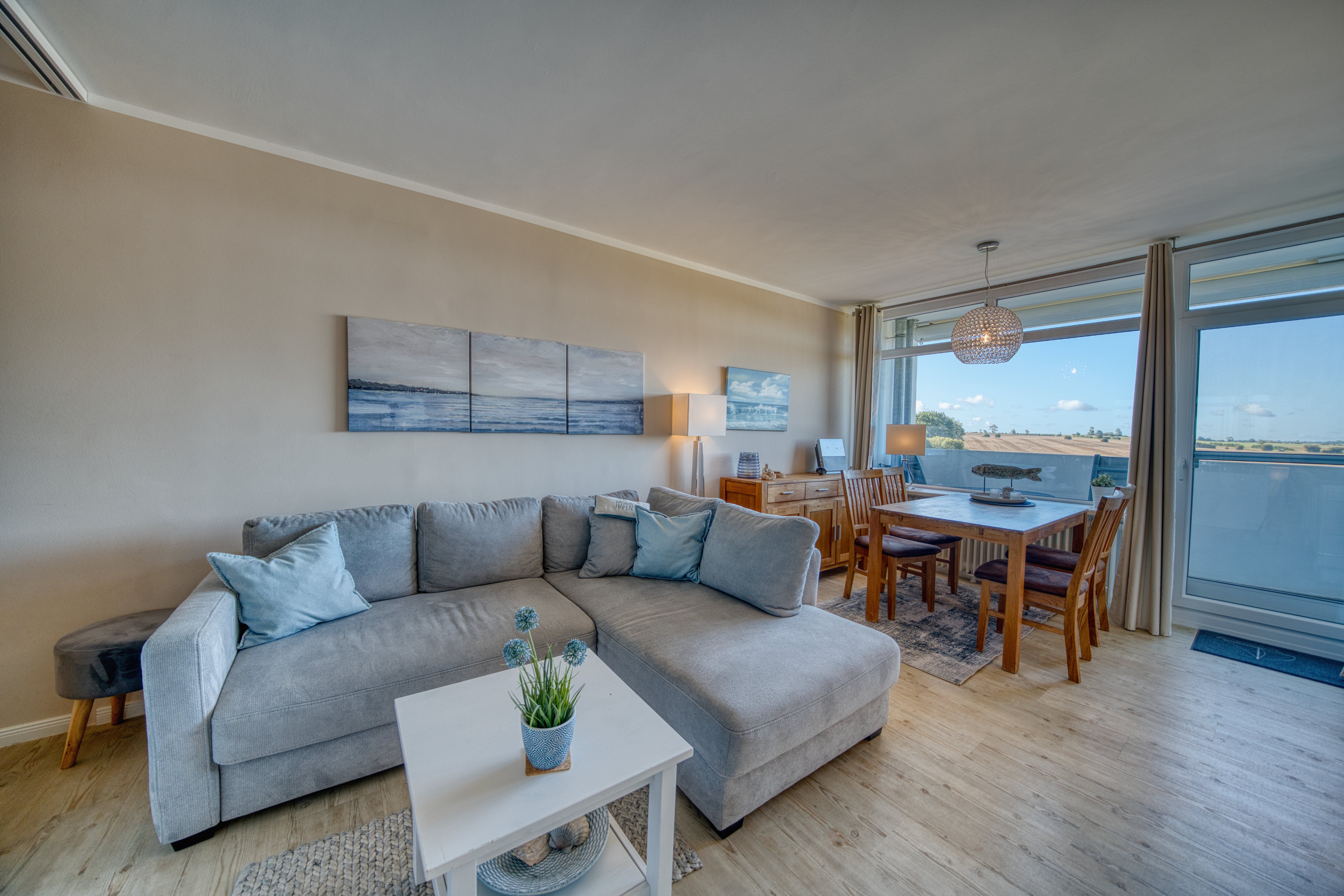 Wohn-Esszimmer mit Eckcouch, Esstisch vor dem Balkon, Flachbild-TV, Radio und Vinylboden