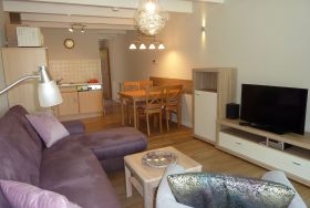 Die Ferienwohnung verfügt über einen großzügigen Wohnraum mit integrierter Küchenzeile, 2 Schlafräumen, Badezimmer mit Dusche und WC oben und ein WC unten. Weiterhin gibt es ein Kinderbett. Unsere Wohnung hat Balkon und Terrasse.