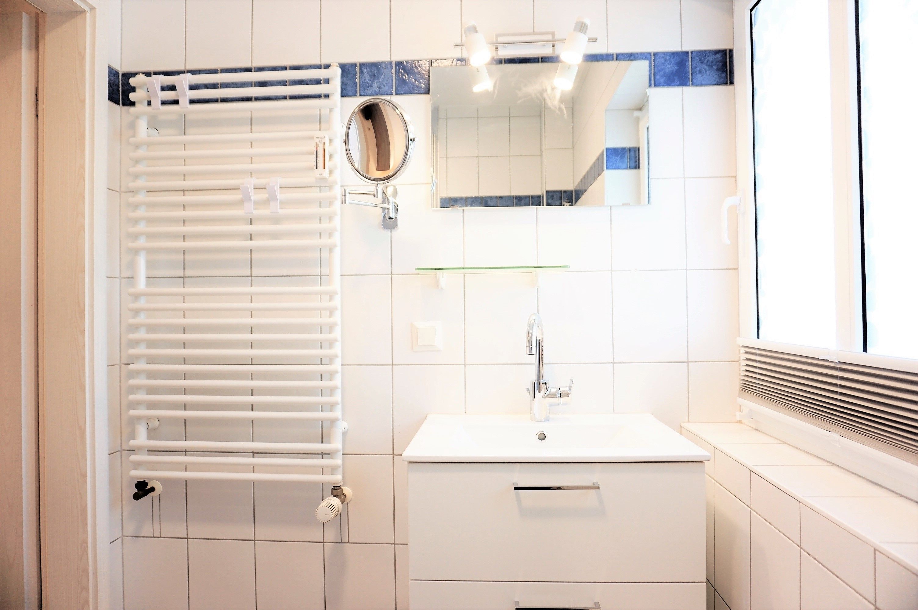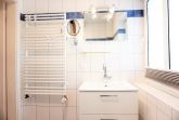 Das helle Tageslicht-Badezimmer (ebenfalls renoviert) mit Dusche und WC begrüßt sie am Morgen mit angewärmten Handtüchern. Anschließend am (ausziehbaren) Garten-Tisch auf dem Balkon gemütlich in der Sonne frühstücken > ein gelungener Start in den Tag.