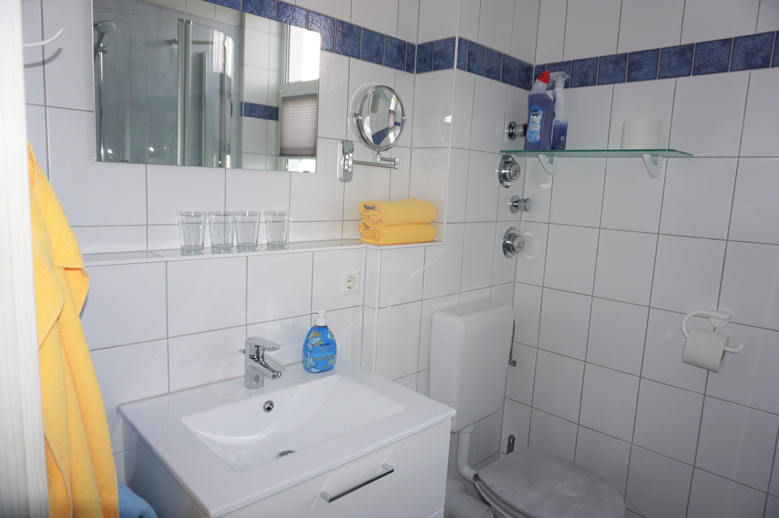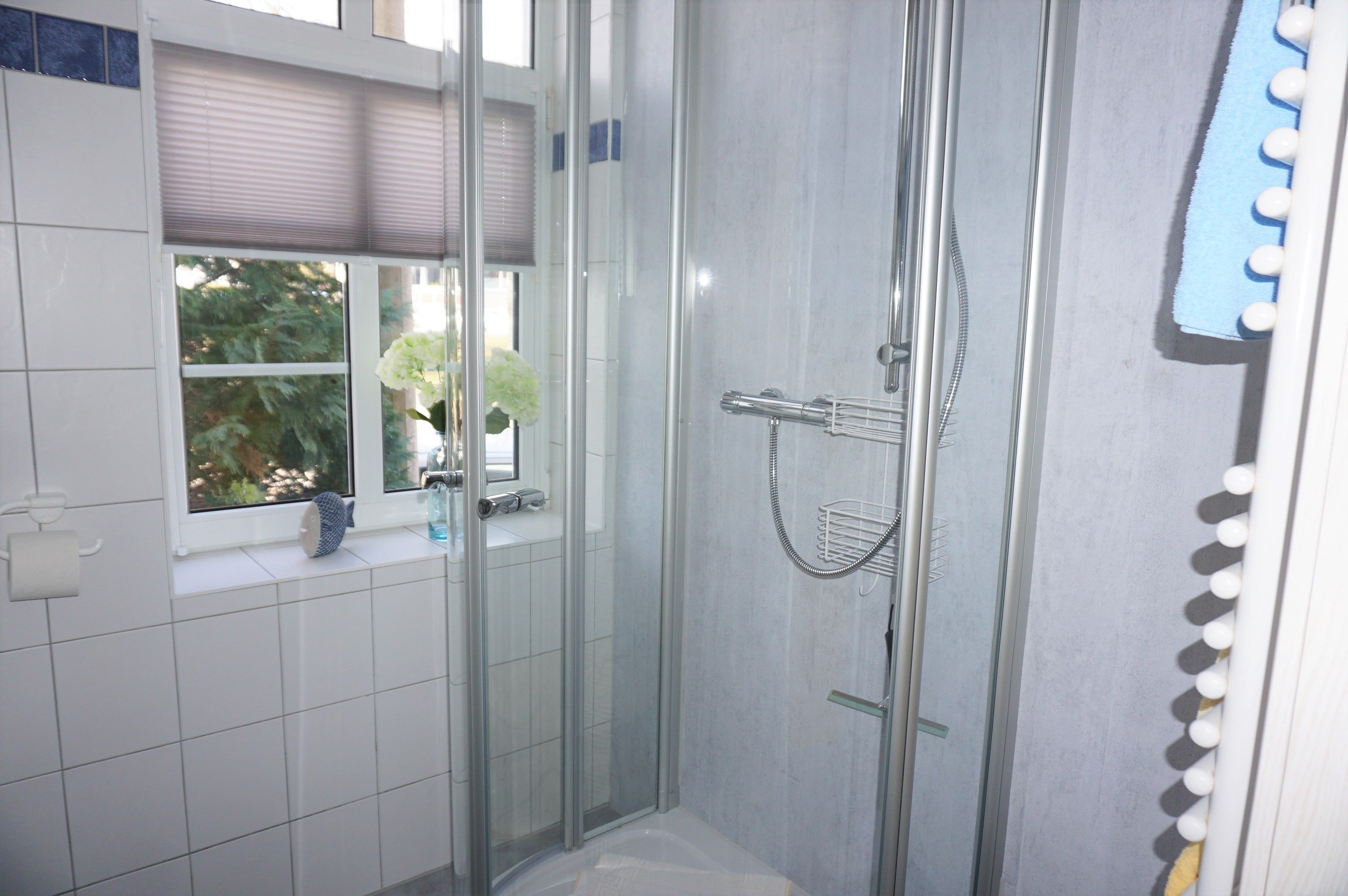 Das helle Tageslicht-Badezimmer (ebenfalls renoviert) mit Dusche und WC begrüßt sie am Morgen mit angewärmten Handtüchern.
