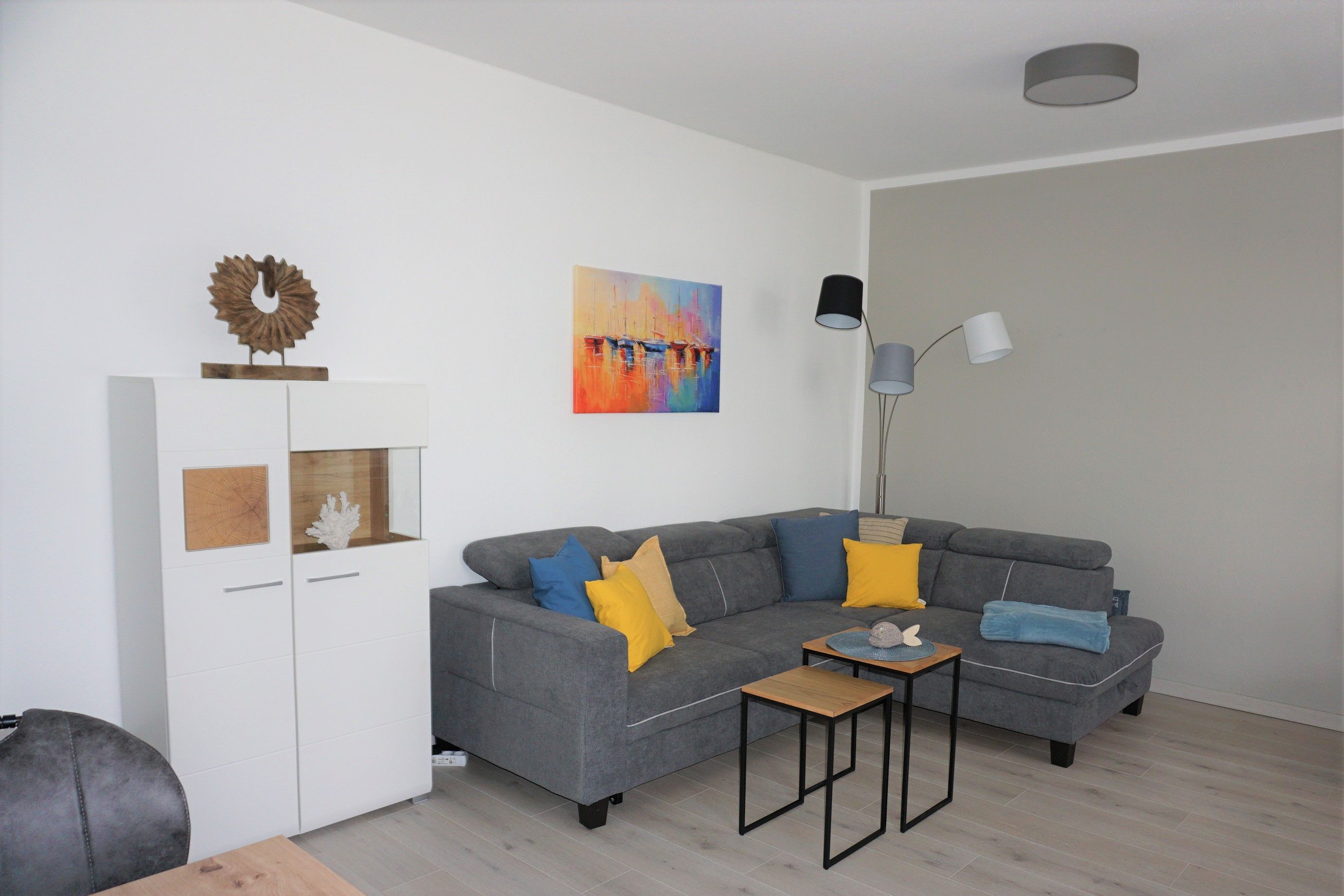 Die 2022 neu - renovierte und eingerichtete Ferienwohnung verfügt über einen großzügigen Wohn-Essbereich - mit Sicht auf den schön angelegten Garten und das Meer.