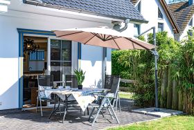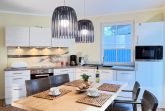 Die offene Küche mit hochwertigen Geräten macht das Kochen zum Vergnügen. An der stilvollen Essgruppe finden alle Platz ideal für gemeinsame Mahlzeiten oder lange Gespräche nach einem Tag am Meer. Die beiden Schlafzimmer sind komfortabel eingerichtet und bieten durch Verdunkelungsrollos und TV beste Voraussetzungen für erholsame Nächte.