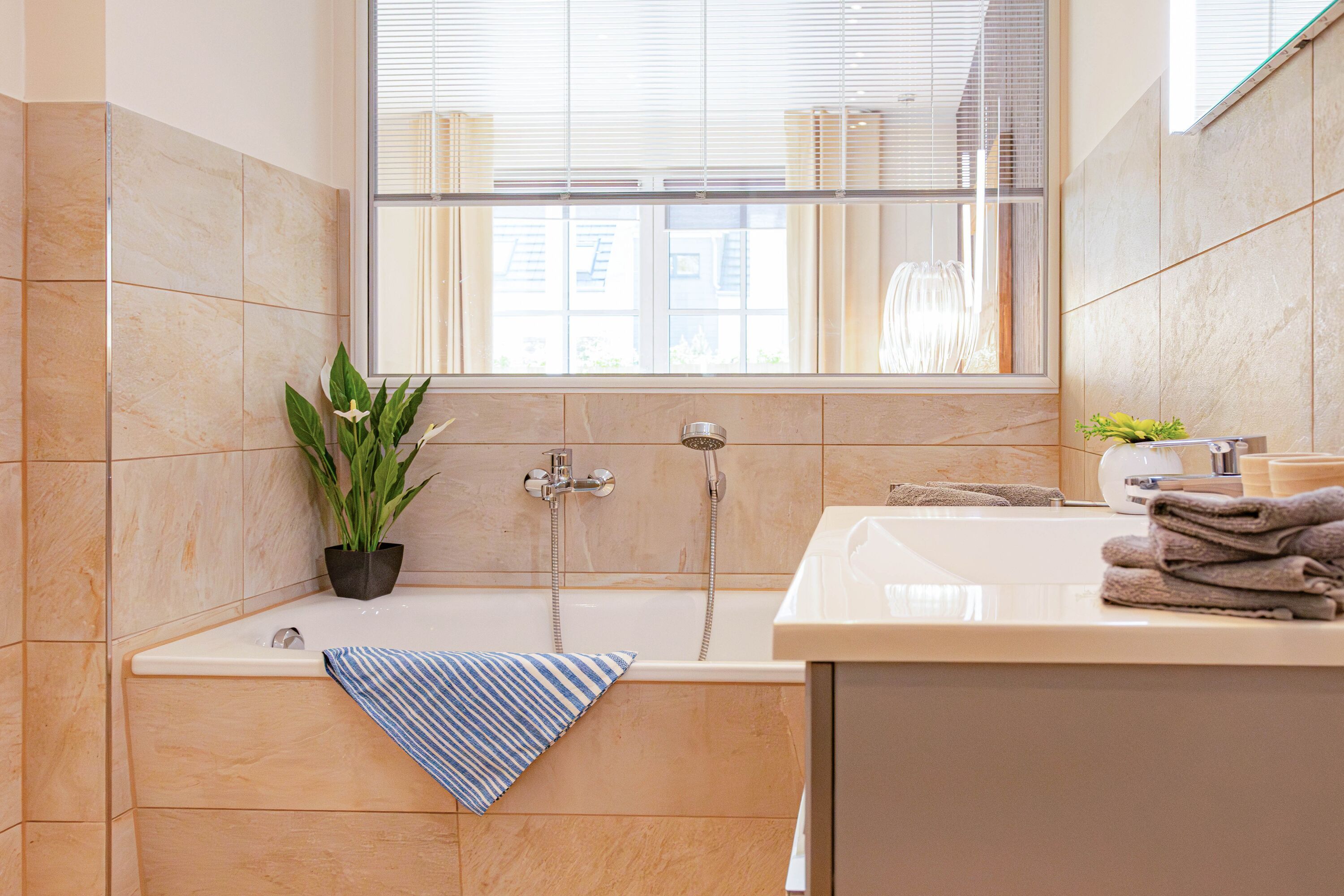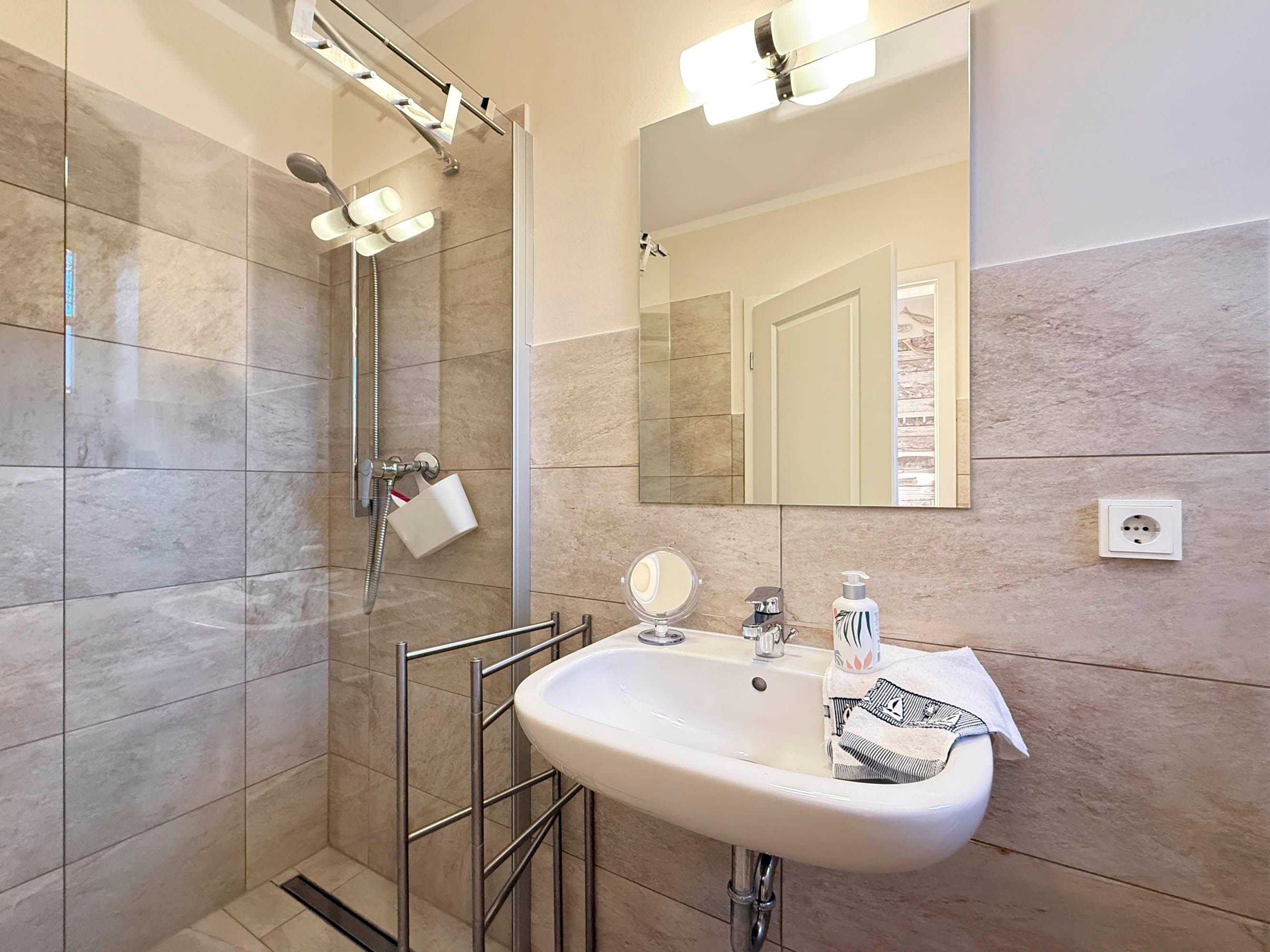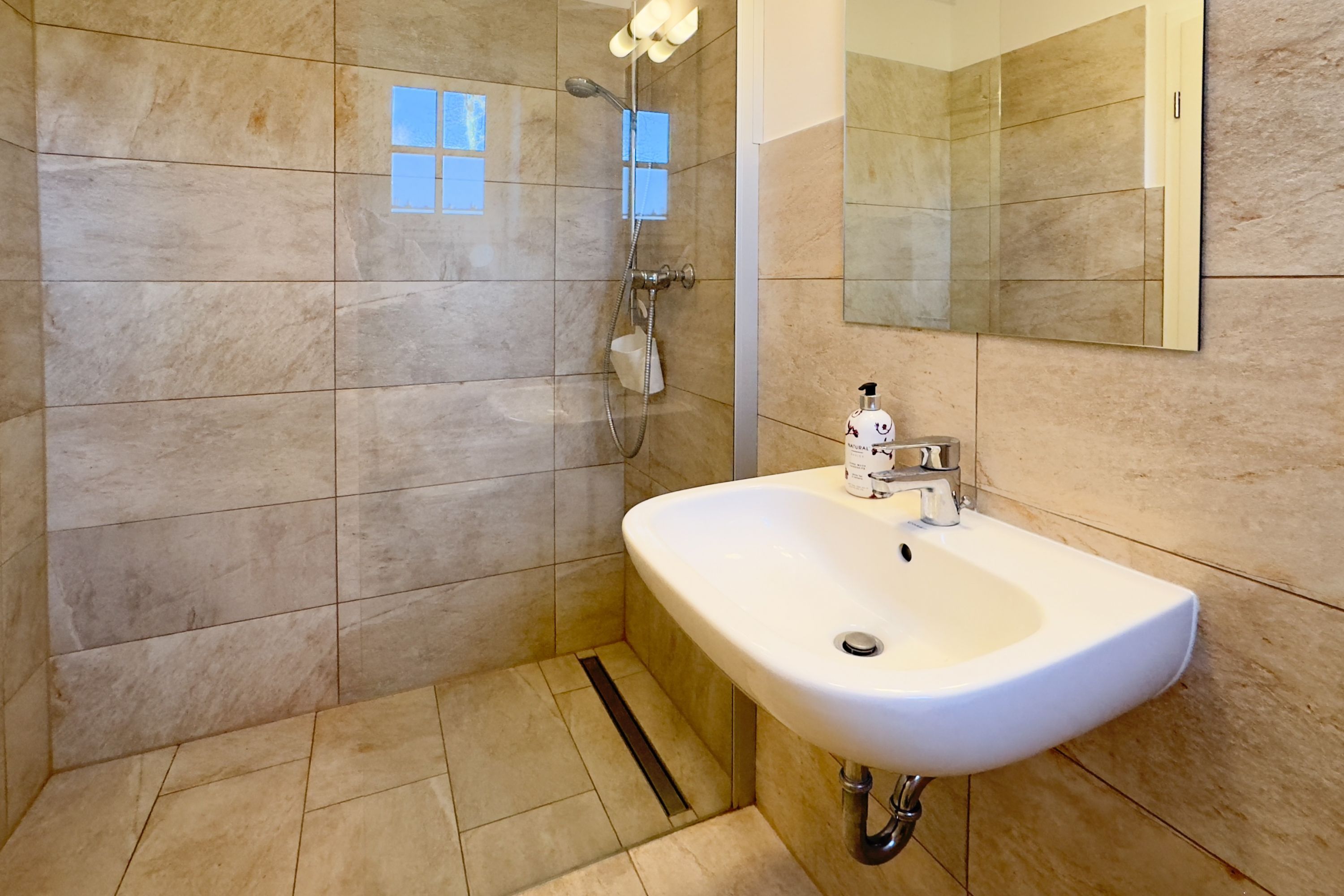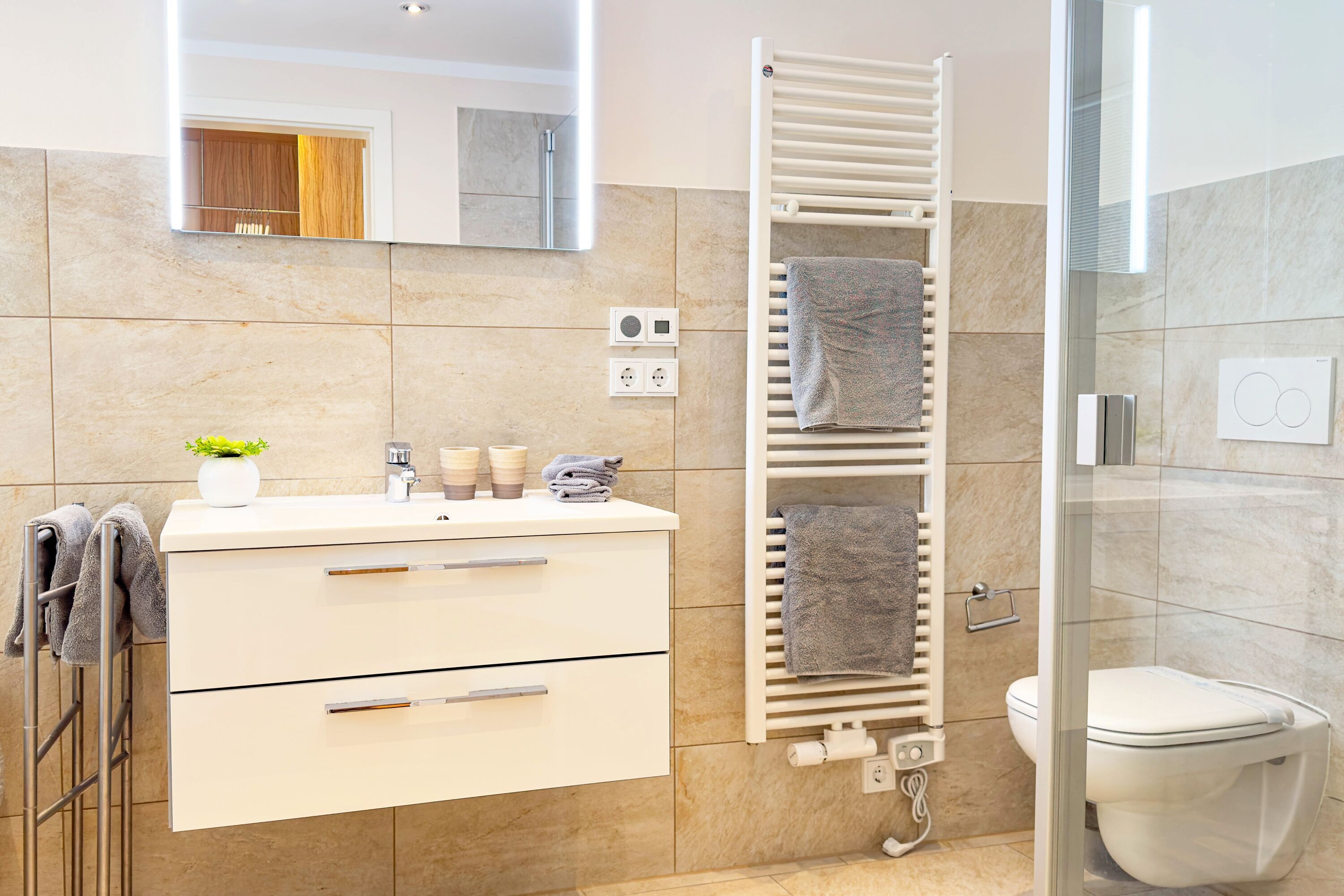 • Badezimmer: Zwei moderne Bäder eines mit Badewanne und Dusche, eines mit Dusche und WC, beide mit Fußbodenheizung