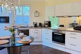 Die moderne Küche ist komplett ausgestattet und lässt keine Wünsche offen. Hier wird gemeinsames Kochen zum Erlebnis und am Esstisch für bis zu sechs Personen genießen Sie Ihre Mahlzeiten mit Blick in den Garten.