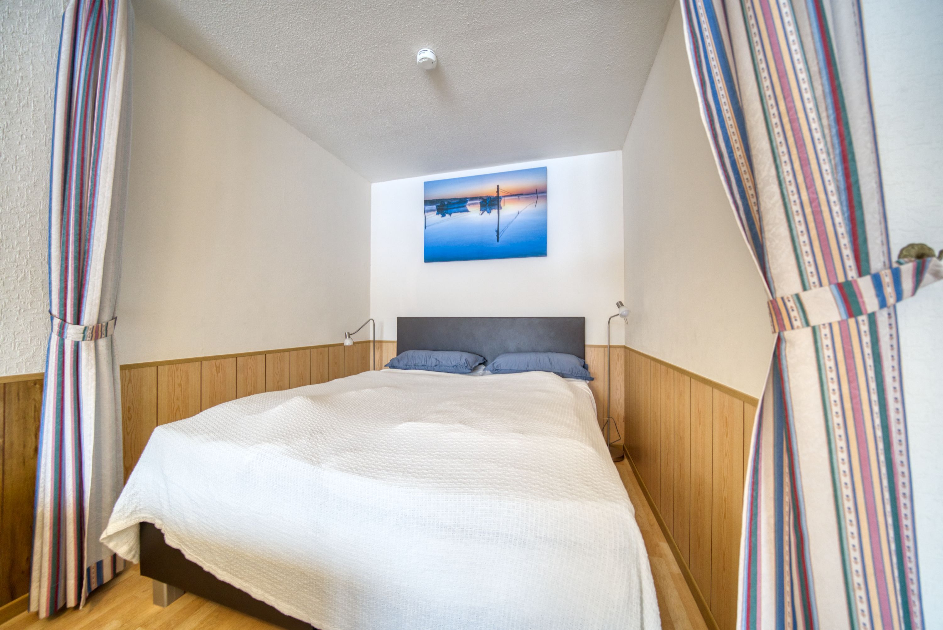 Wohn-Schlafbereich mit Doppelbett, Sofa und Esstisch am Fenster