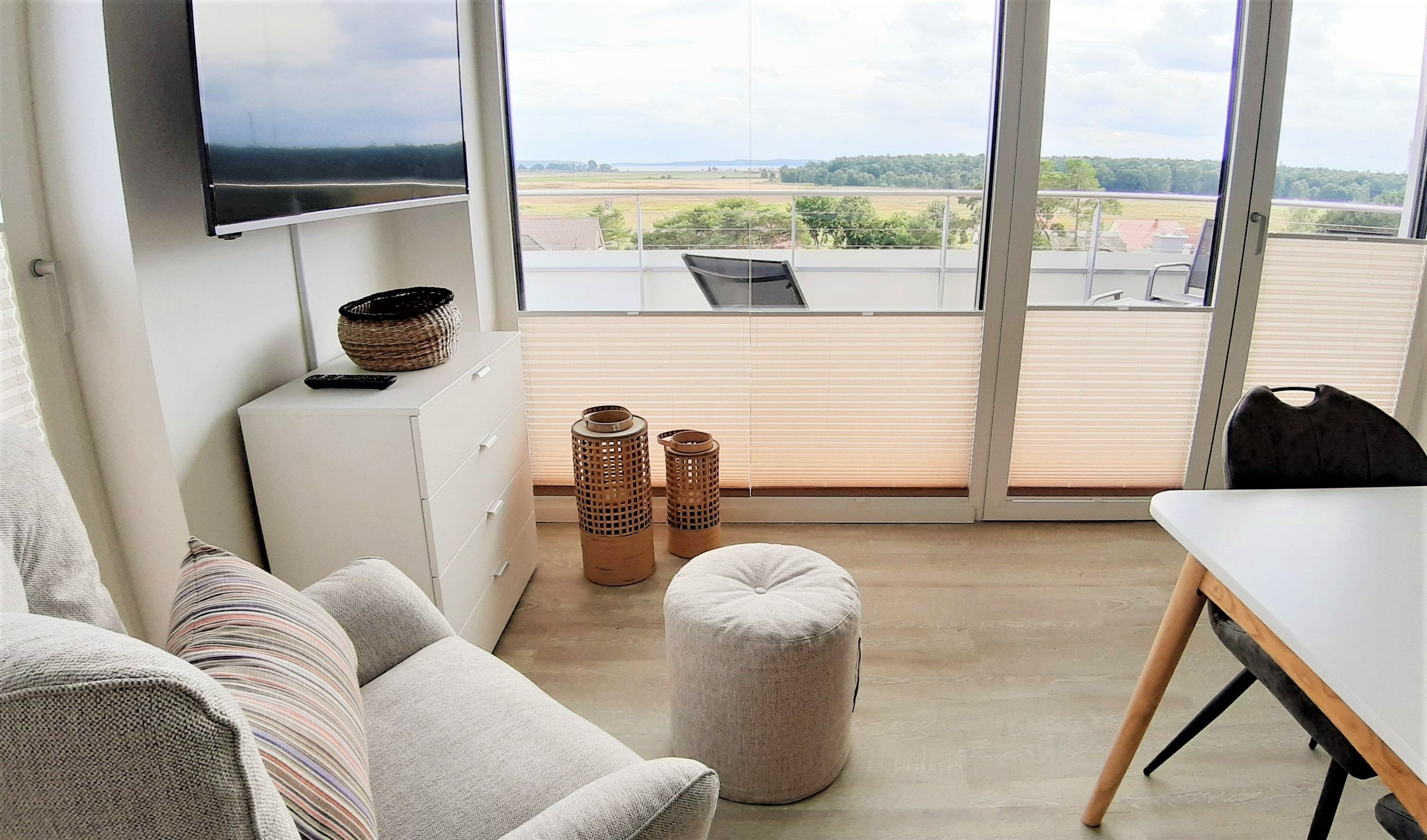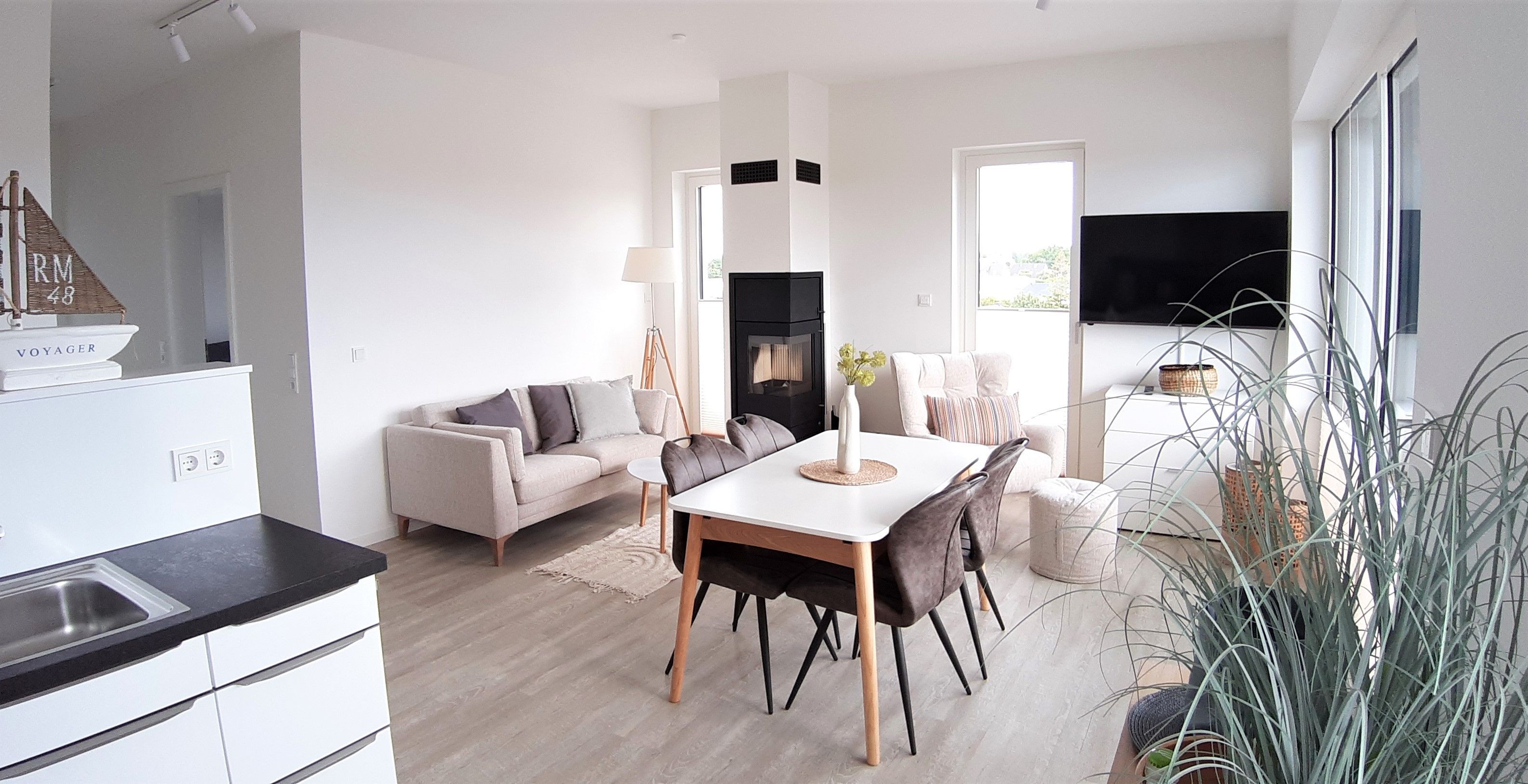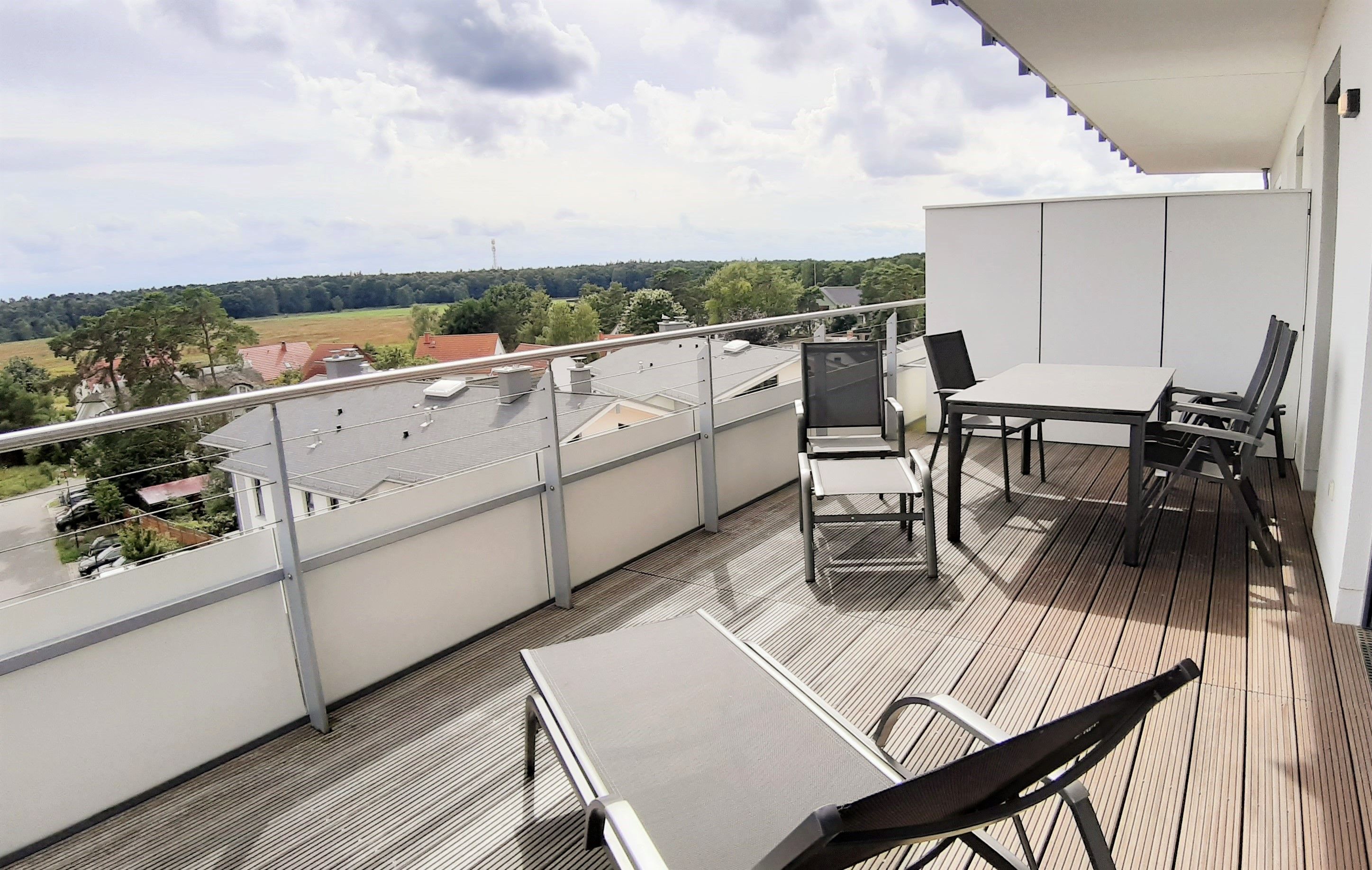 Unser Penthouse Seaside über den Dächern des Erholungsortes Glowe mit seiner umlaufenden Terrasse bietet herrliche Ausblick über die Ostsee und die Boddenlandschaft. Der großzügige Wohnbereich mit moderner Küche, Essbereich, Couchecke mit Lesesessel, TV und Kamin bieten viel Platz für individuelle Freizeitgestaltung. Ein Schlafzimmer ist mit einem großen Doppelbett und ein Schlafzimmer mit einer Schlafcouch (Liegefläche 140x200cm) ausgestattet. Das Bad verfügt über eine bodengleiche Echtglasdusche. Zur Wohnung gehört ein Tiefgaragenstellplatz.