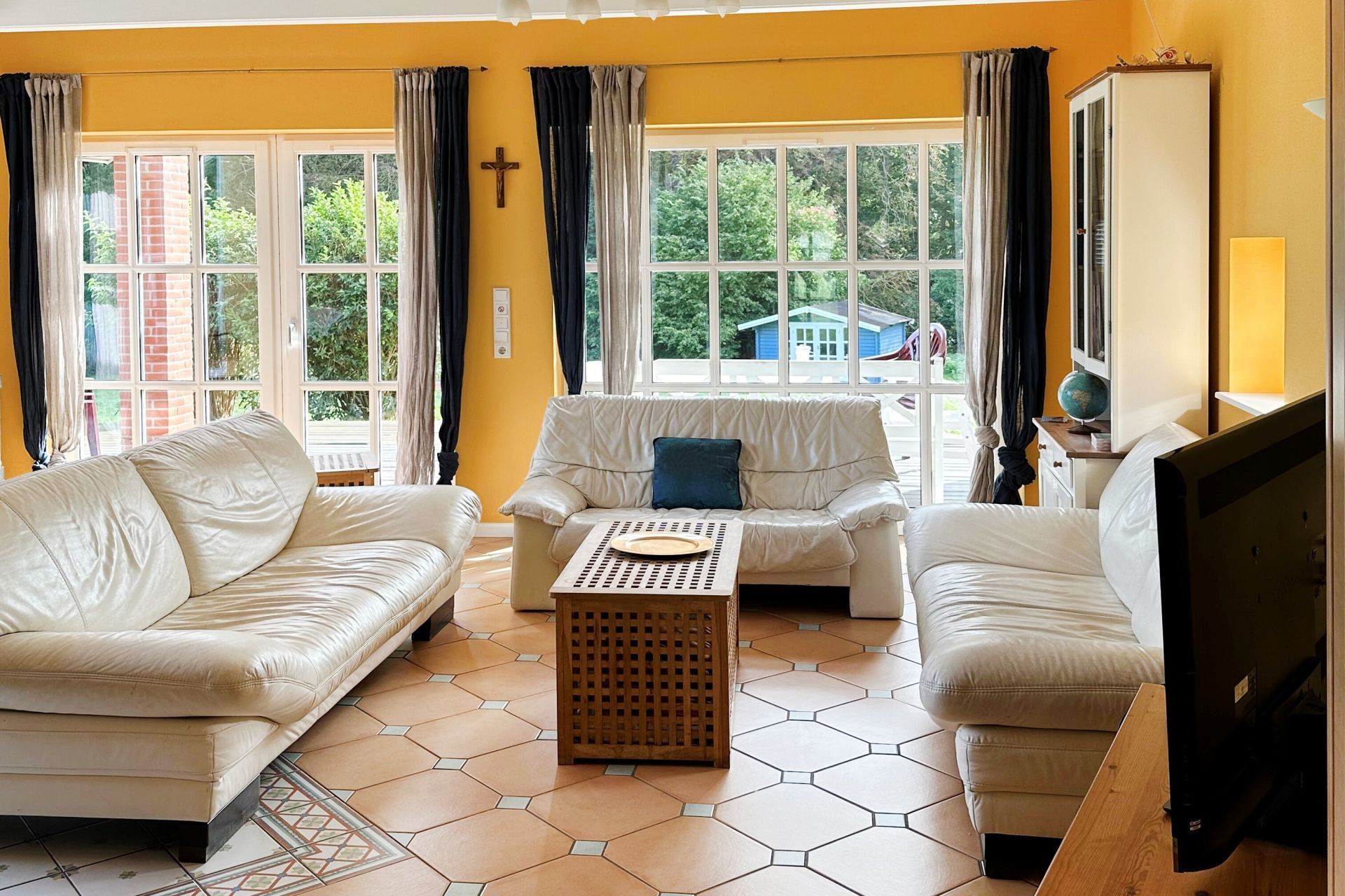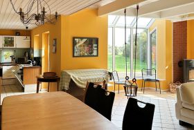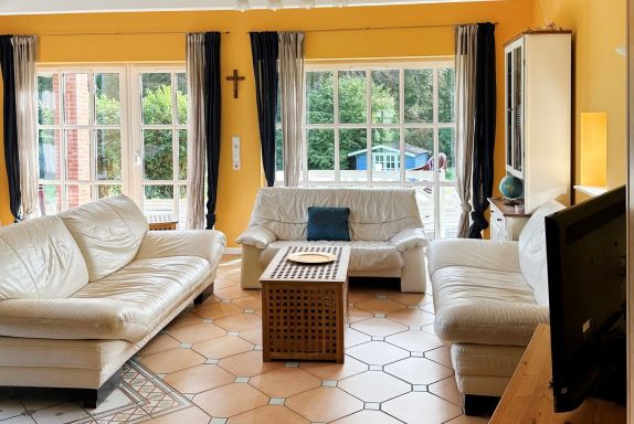 Das schöne Haus empfängt Sie mit einem 50qm großen Wohnzimmer mit Wintergarten ähnlicher Fensterfront. Auch ein Kaminofen ist vorhanden und schenkt Wohlfühlatmosphäre. Drei Sofas wie auch weitere Sitzgelegenheiten, zudem ein Esstisch bieten bequemen Komfort. Technische Unterhaltung bieten Fernseher und Musikanlage.