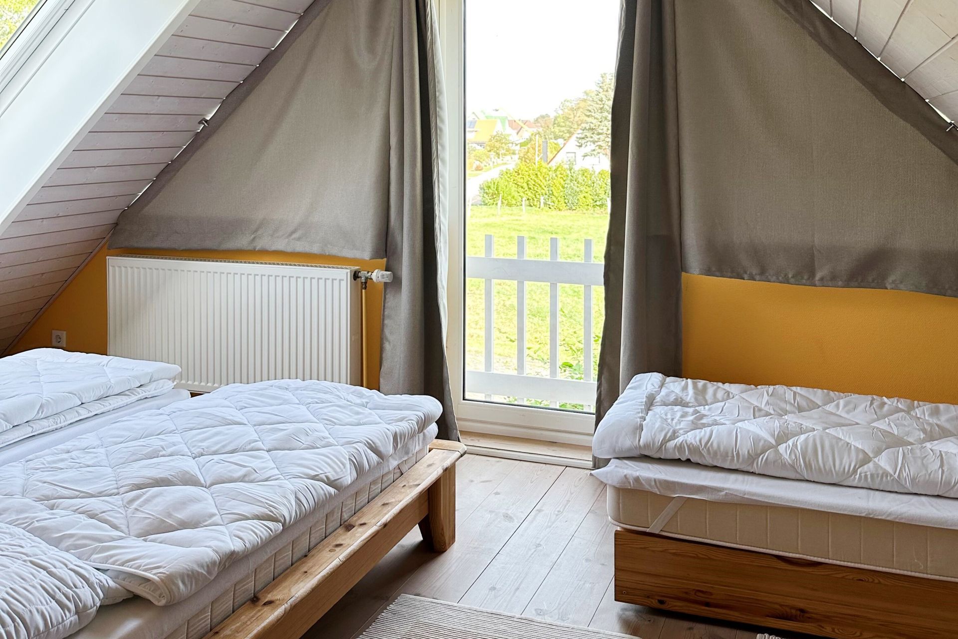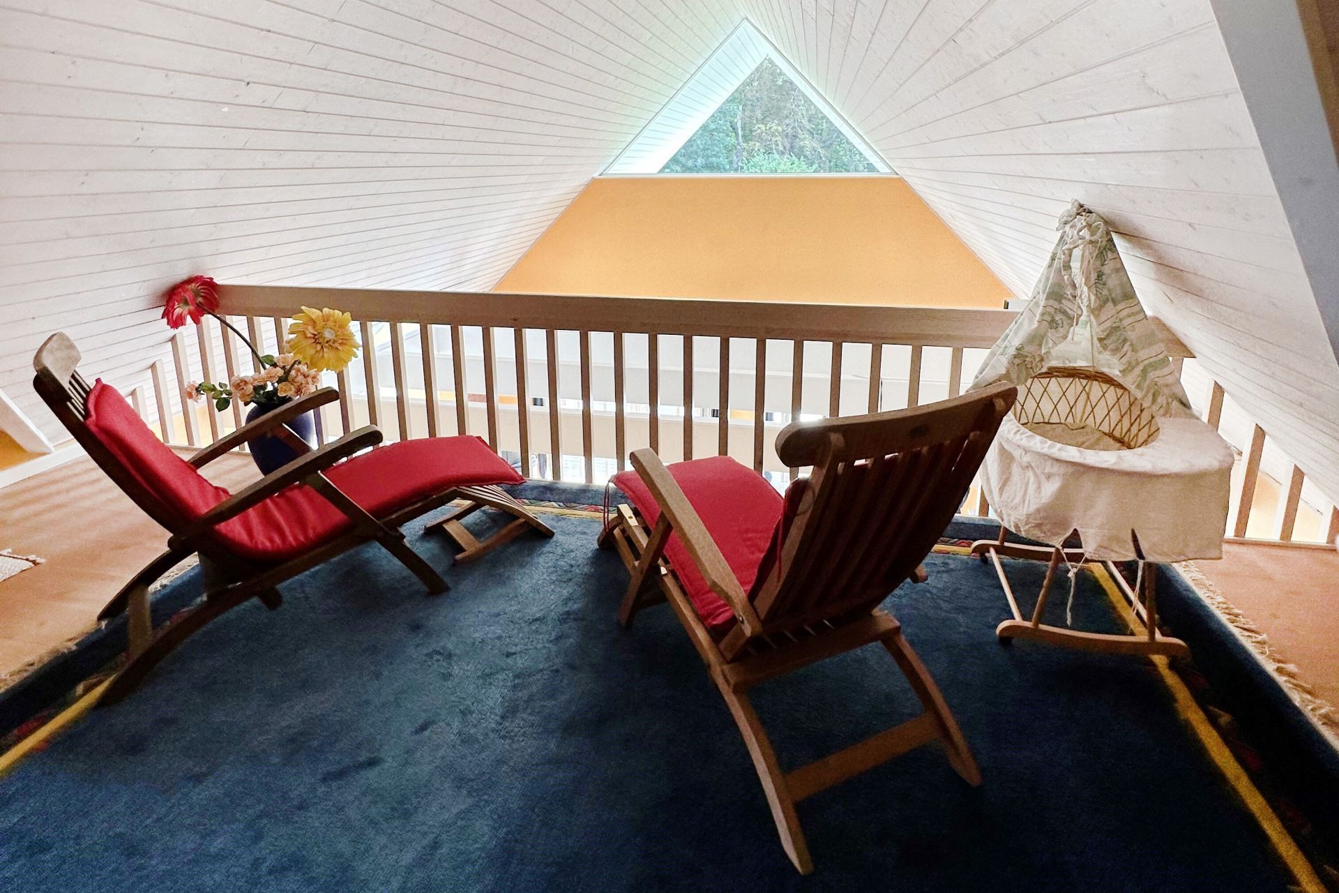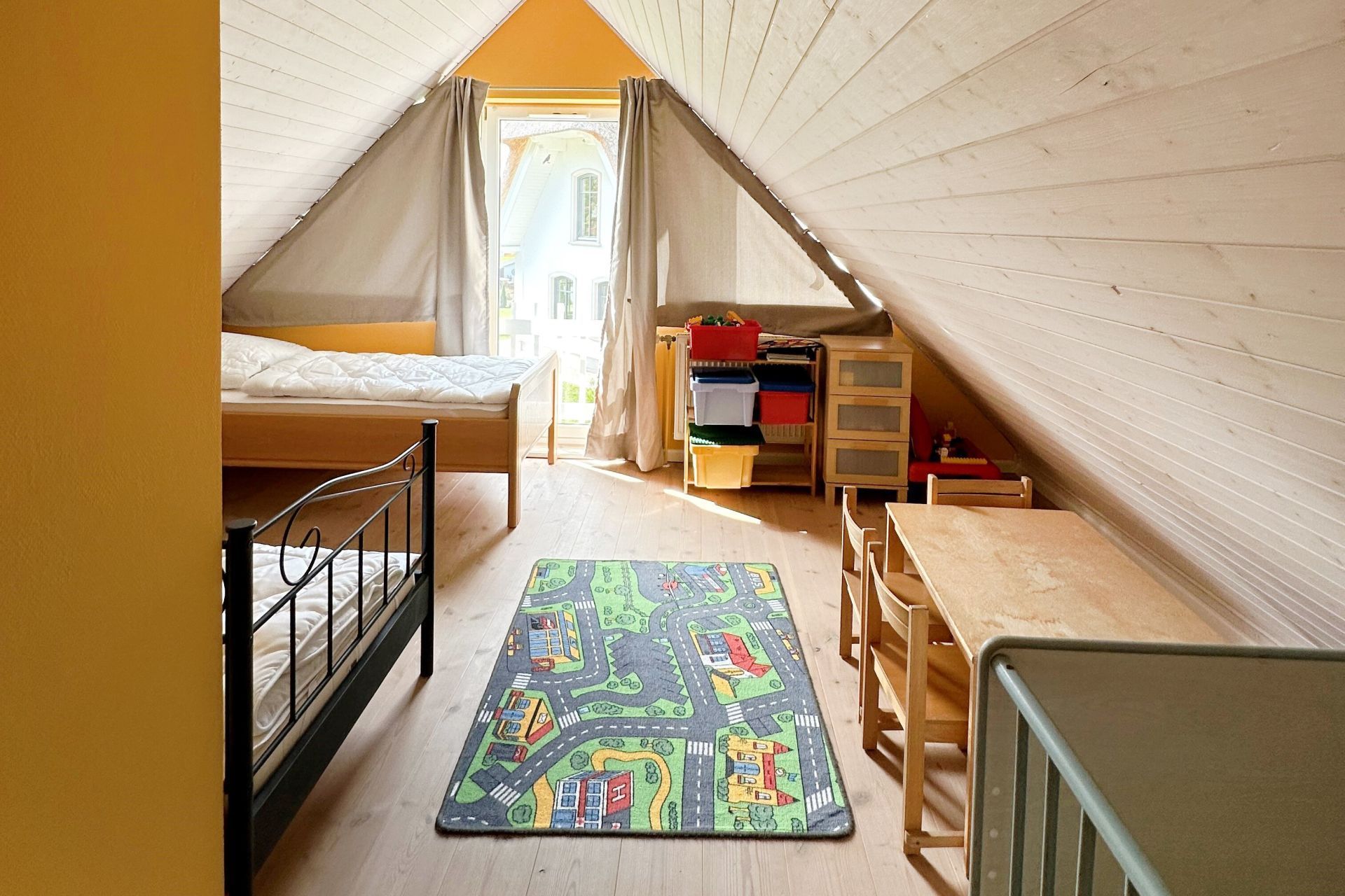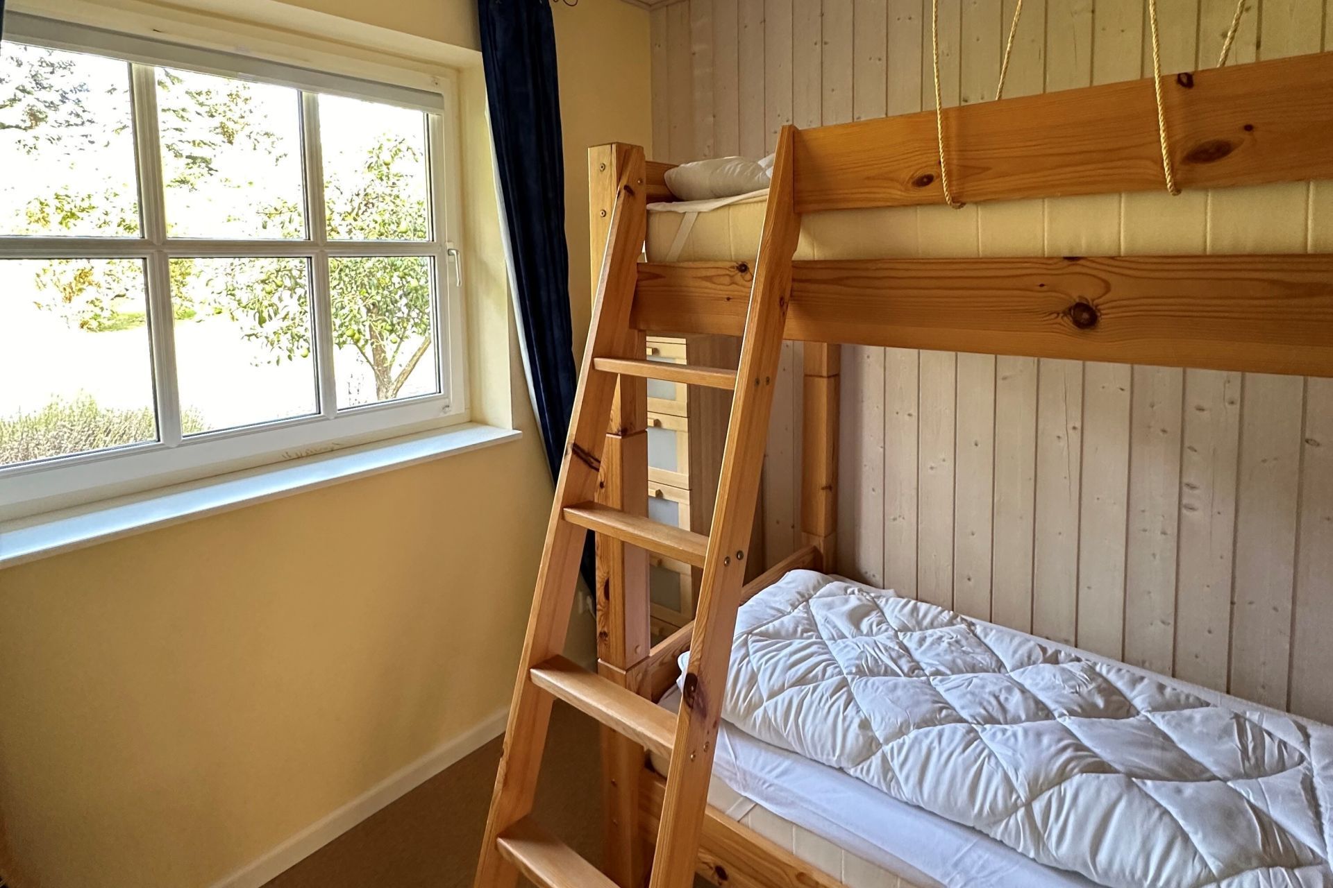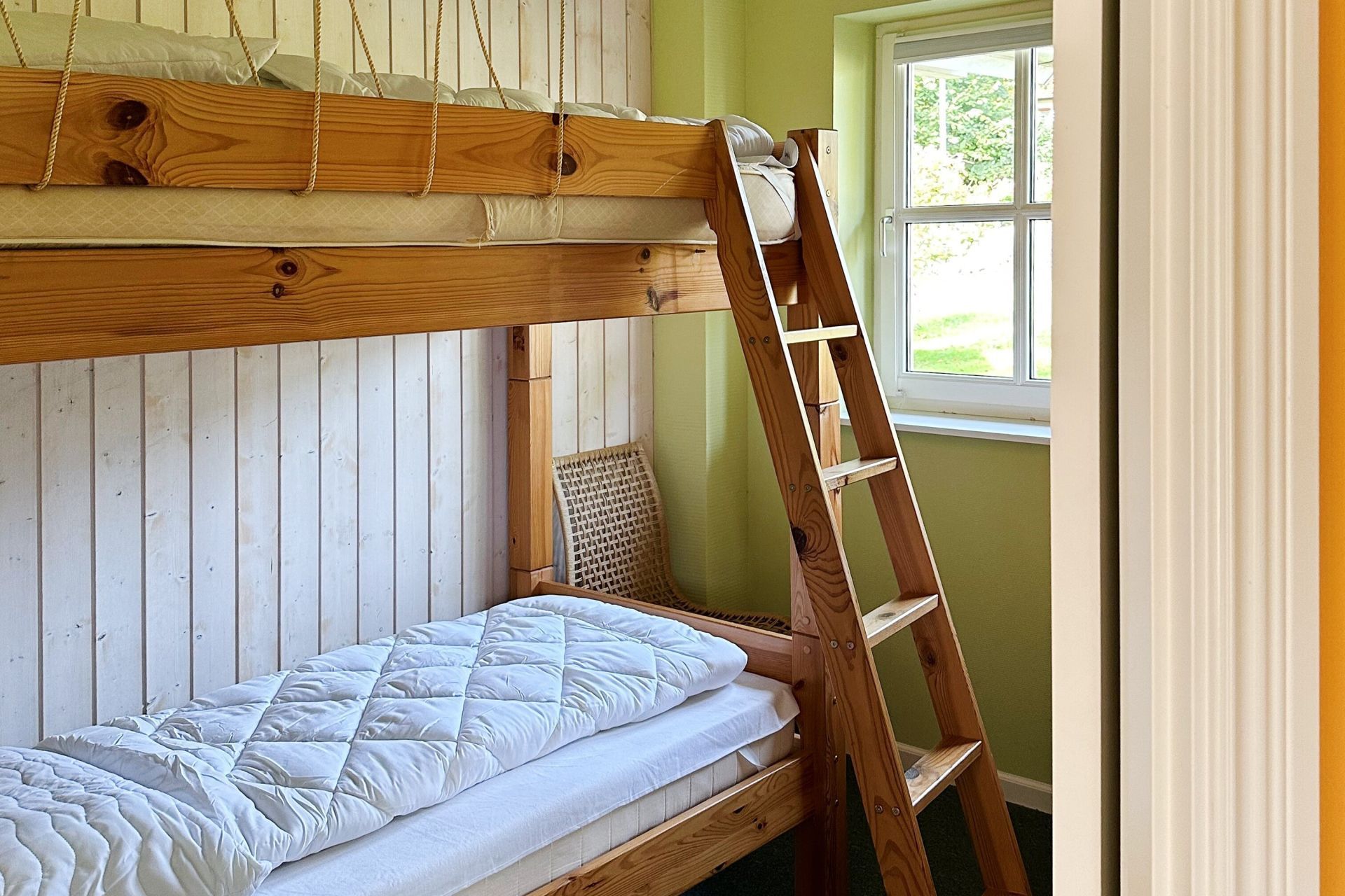 Über eine Treppe gelangen Sie in das Obergeschoss, wo sich zwei weitere Schlafzimmer einmal mit Doppelbett und eines mit zwei Einzelbetten befinden. Ebenso befindet sich ein Duschbad im Obergeschoss. Für kleine Kinder stehen ein Kindergitterbett und ein Hochstuhl bereit und auch Spielzeug befindet sich im Haus. Kostenfrei können Sie die Waschmaschine und Wäschetrockner nutzen.
