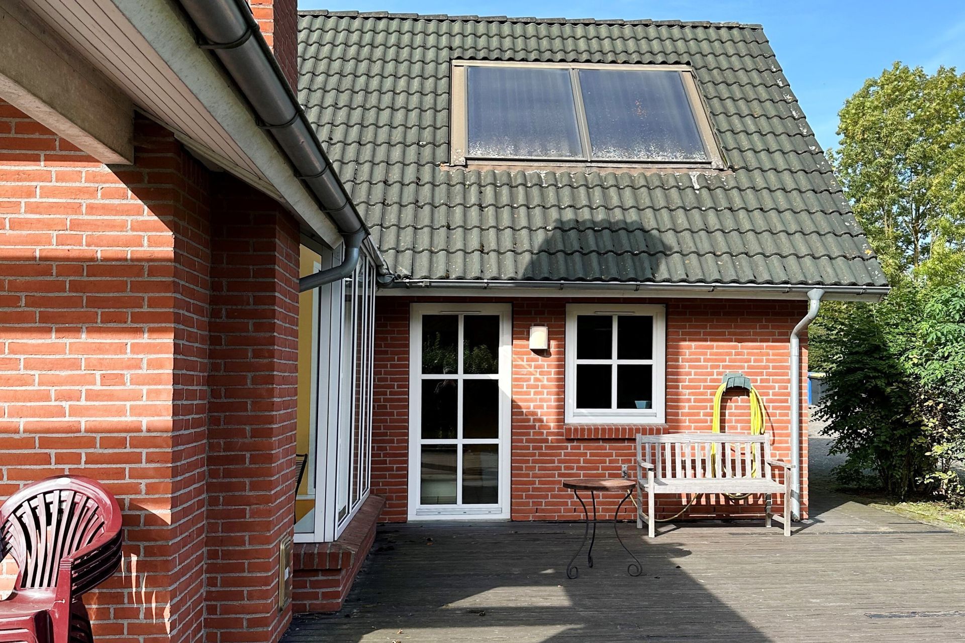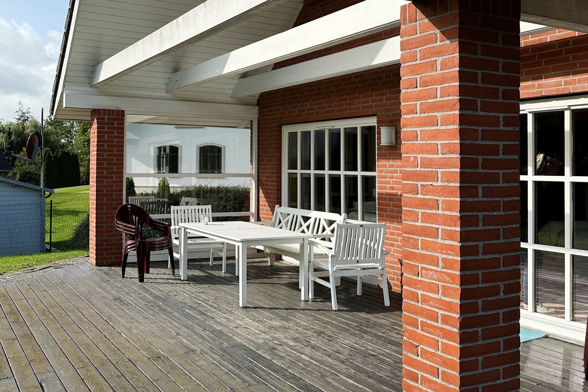 Ihre Urlaubsmahlzeiten nehmen Sie am gemütlichen Esstisch oder auf der 100qm großen Terrasse zu sich, die saisonal möbliert und teilweise überdacht ist. Sie nächtigen in insgesamt 5 separaten Schlafzimmern.