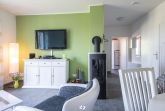 • In dem gemütlich eingerichteten Wohnraum befinden sich ein LED Flachbildschirm, eine gemütliche ausziehbare Schlafcouch 140 x 200 für weitere 2 Personen, eine Anrichte mit DVD Player und ein Kamin. Dieser sorgt in der kalten Jahreszeit für wohlige Wärme und romantisches Flair.