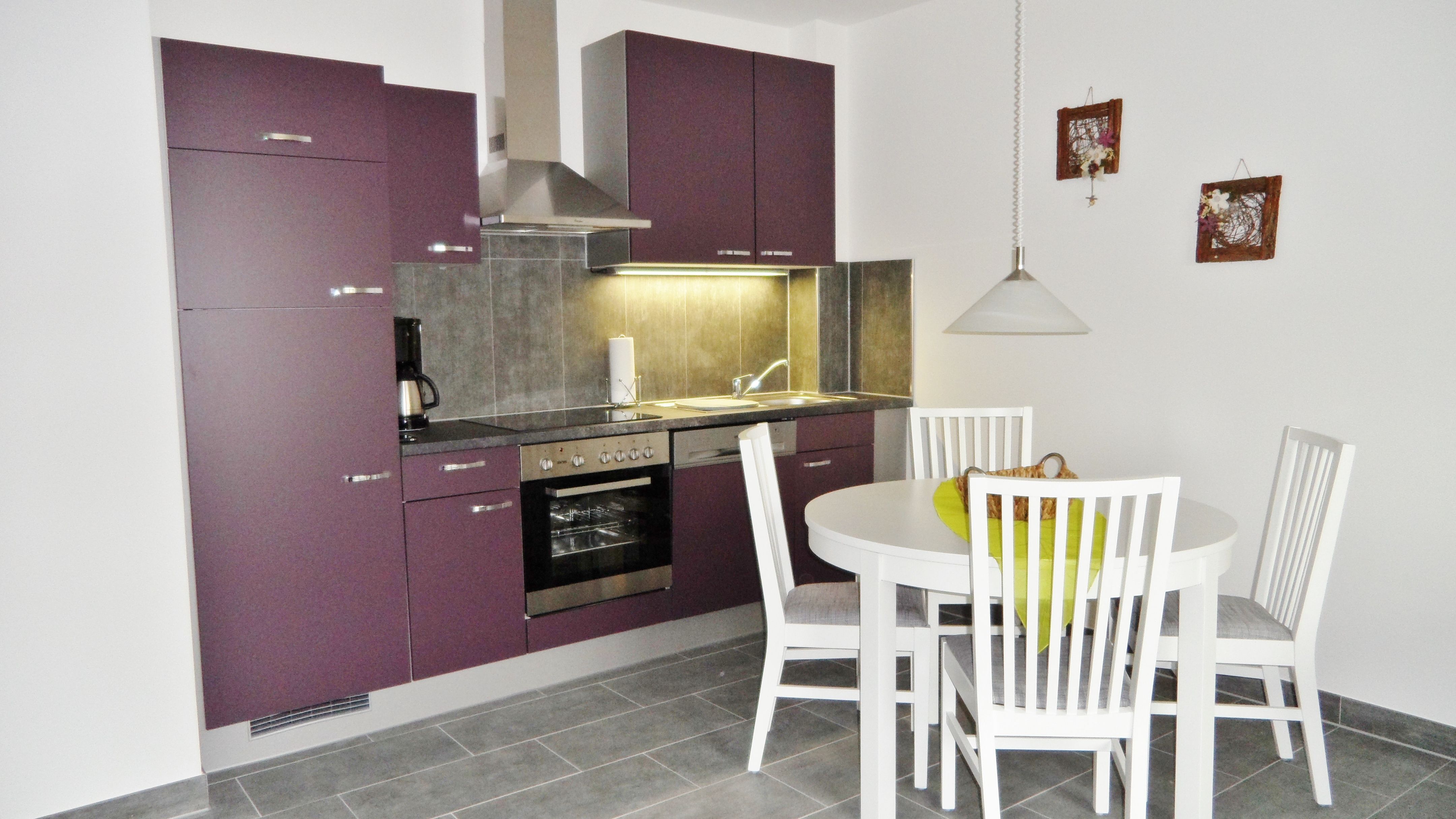 • Die moderne und gut ausgestattete Küchenzeile mit Kühl- und Gefrierschrank, Ceranherd mit Backofen, Geschirrspüler, Wasserkocher und Kaffeemaschine ist in dem Wohnraum integriert. Davor befindet sich der großzügige Essplatz.