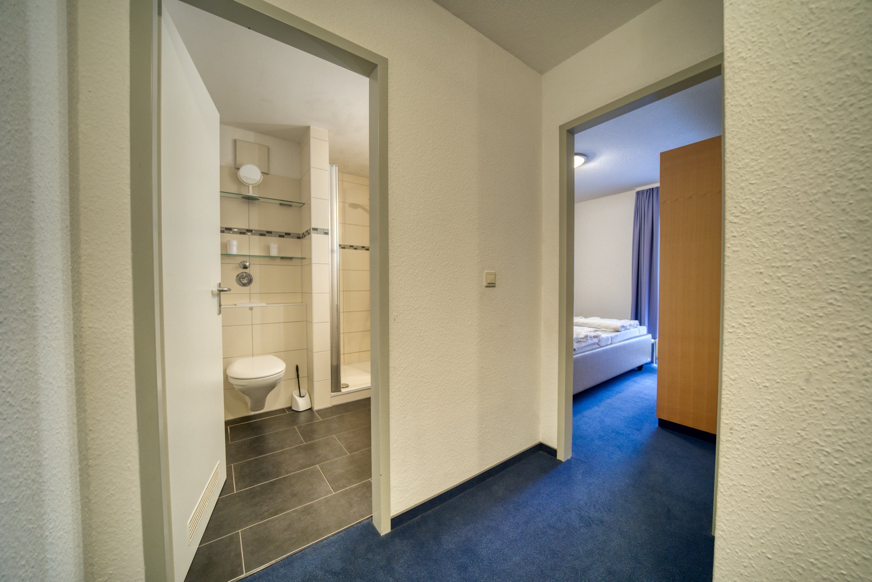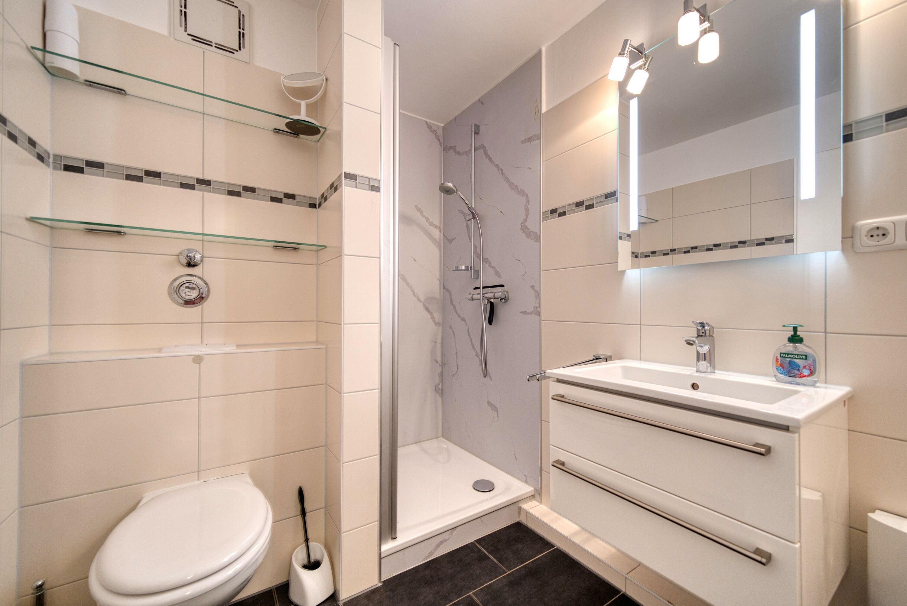 Bad: Mit Dusche (Kabine), WC, Handtuchheizkörper und großzügigem Eingangsbereich mit Stauraum