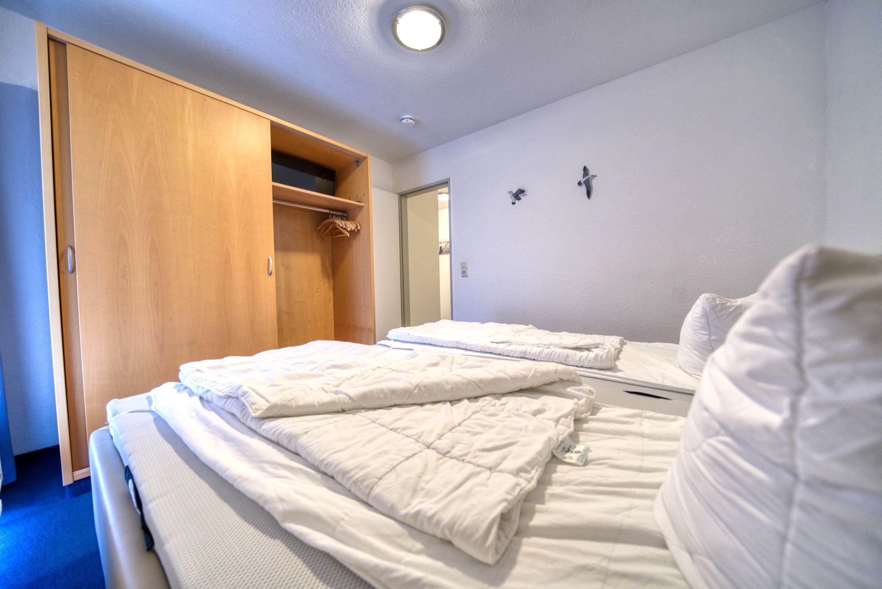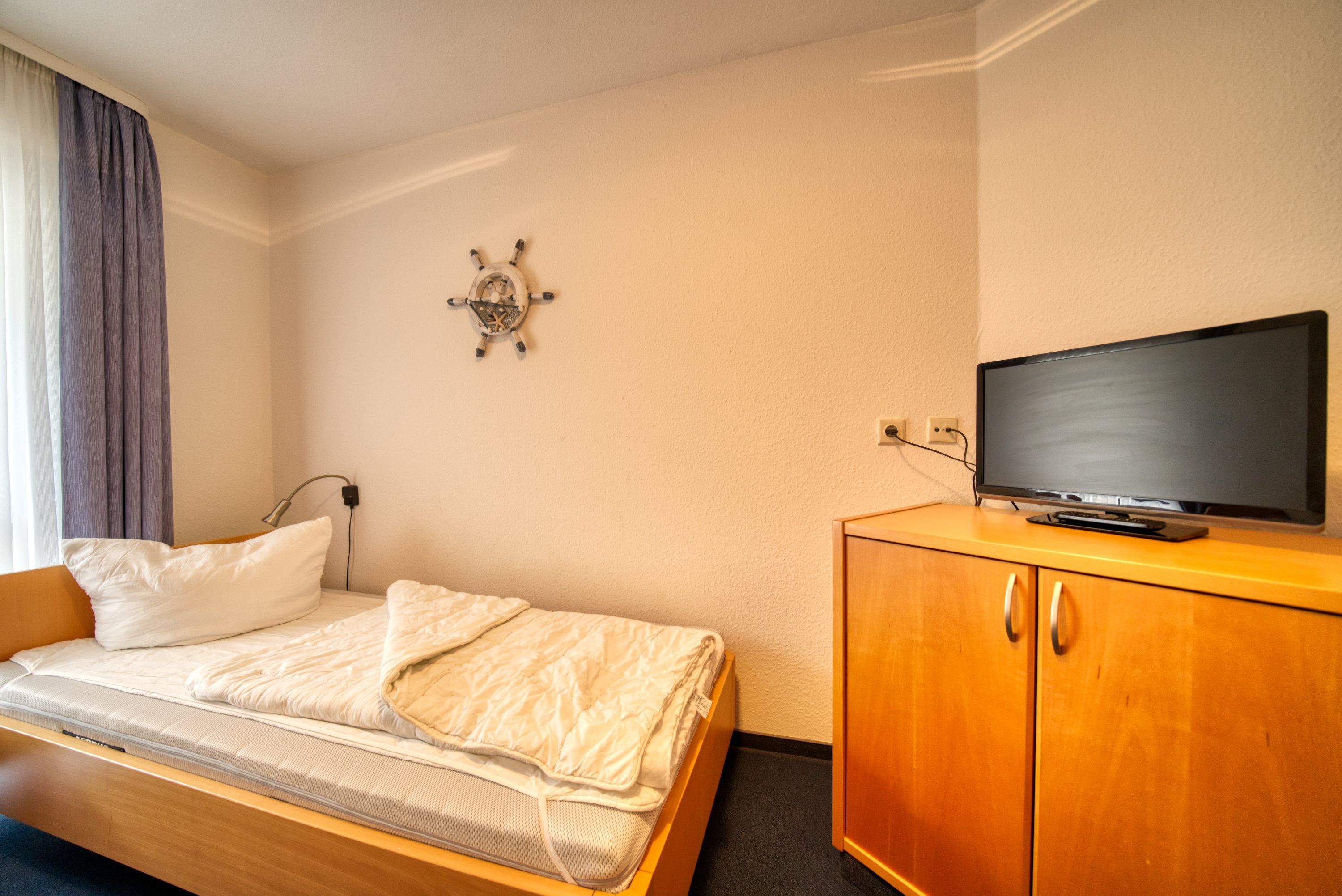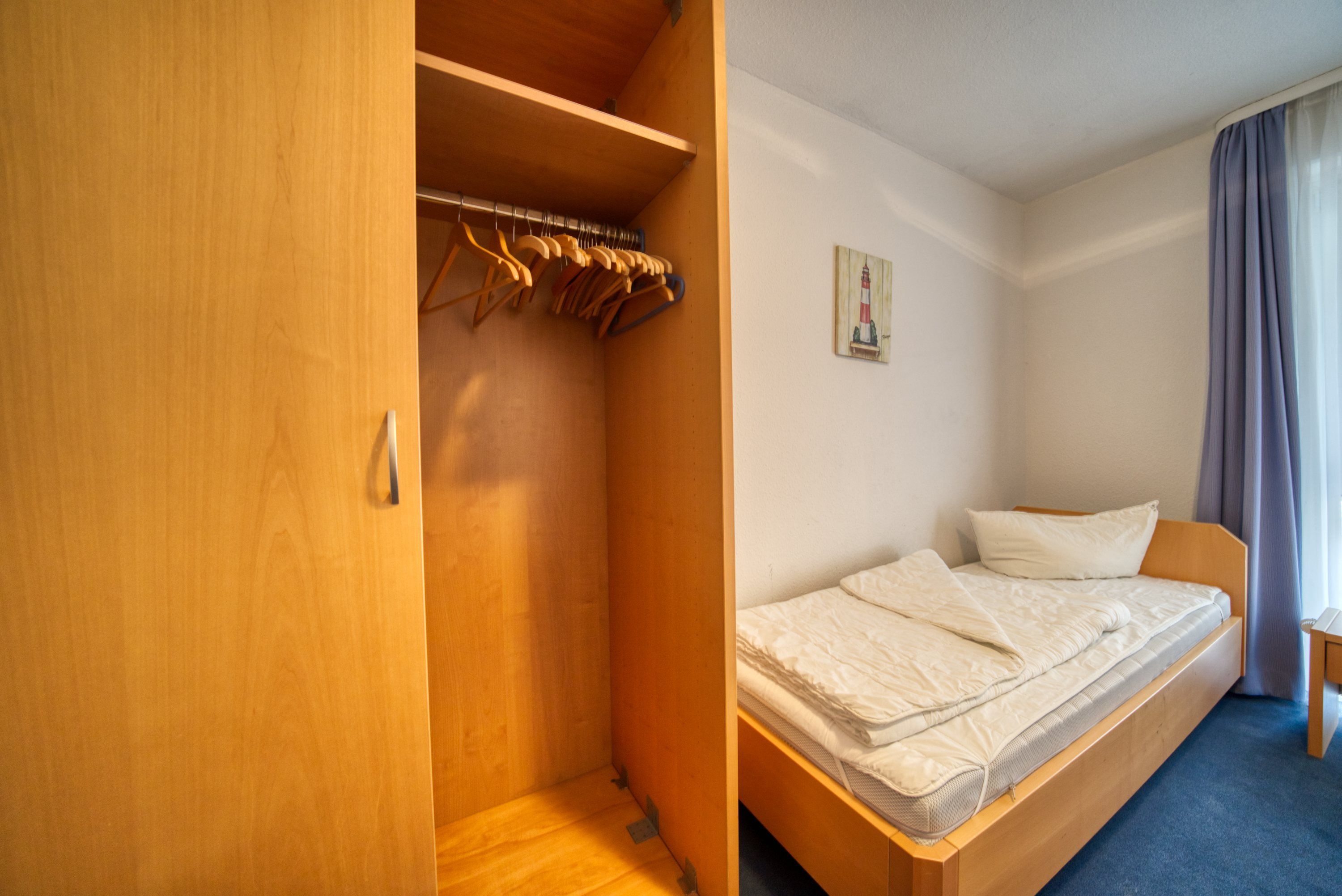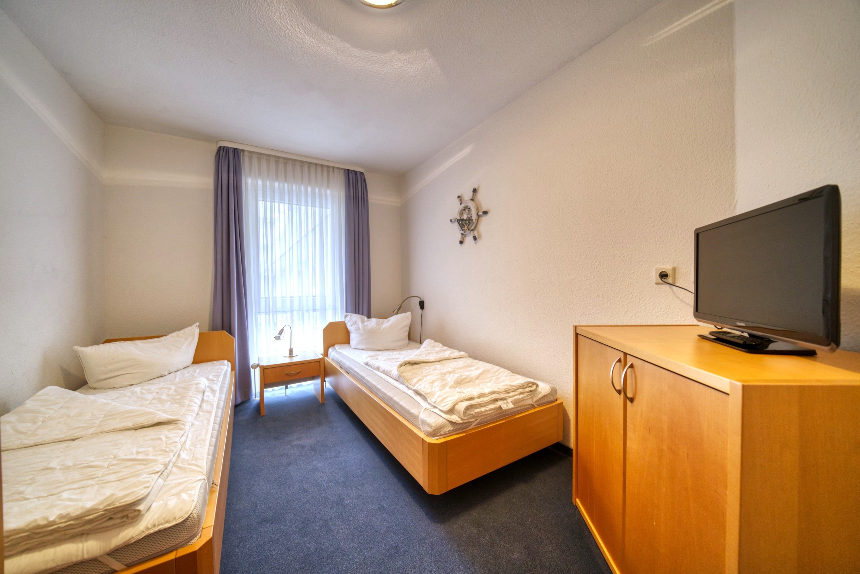 Kinderzimmer: Zwei Einzelbetten (90x200 cm), TV, Kleiderschrank, verdunkelbar durch Vorhänge