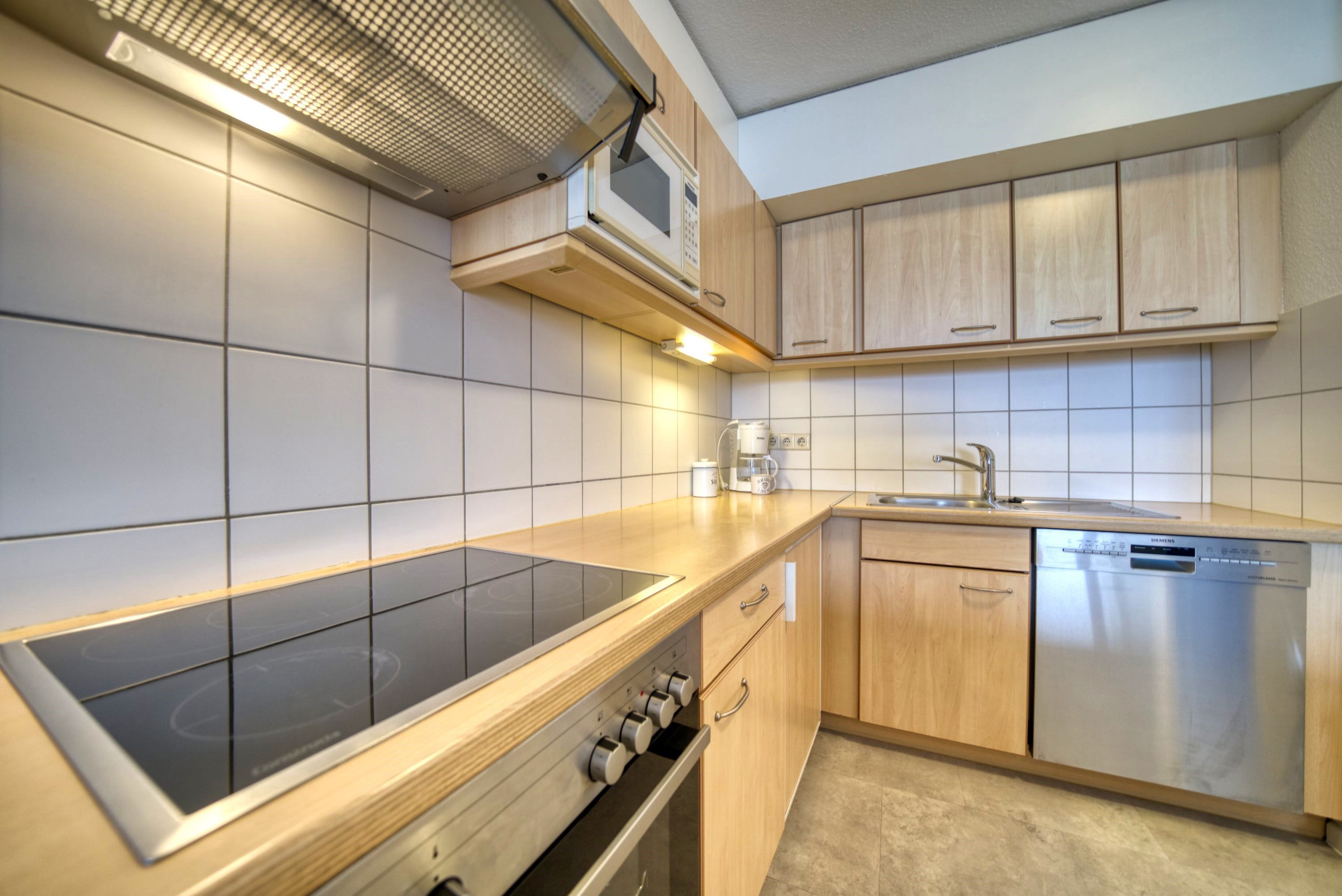 Küche: Offen und modern mit Geschirrspüler, Ceranfeld, Backofen, Mikrowelle, Filterkaffeemaschine und Wasserkocher