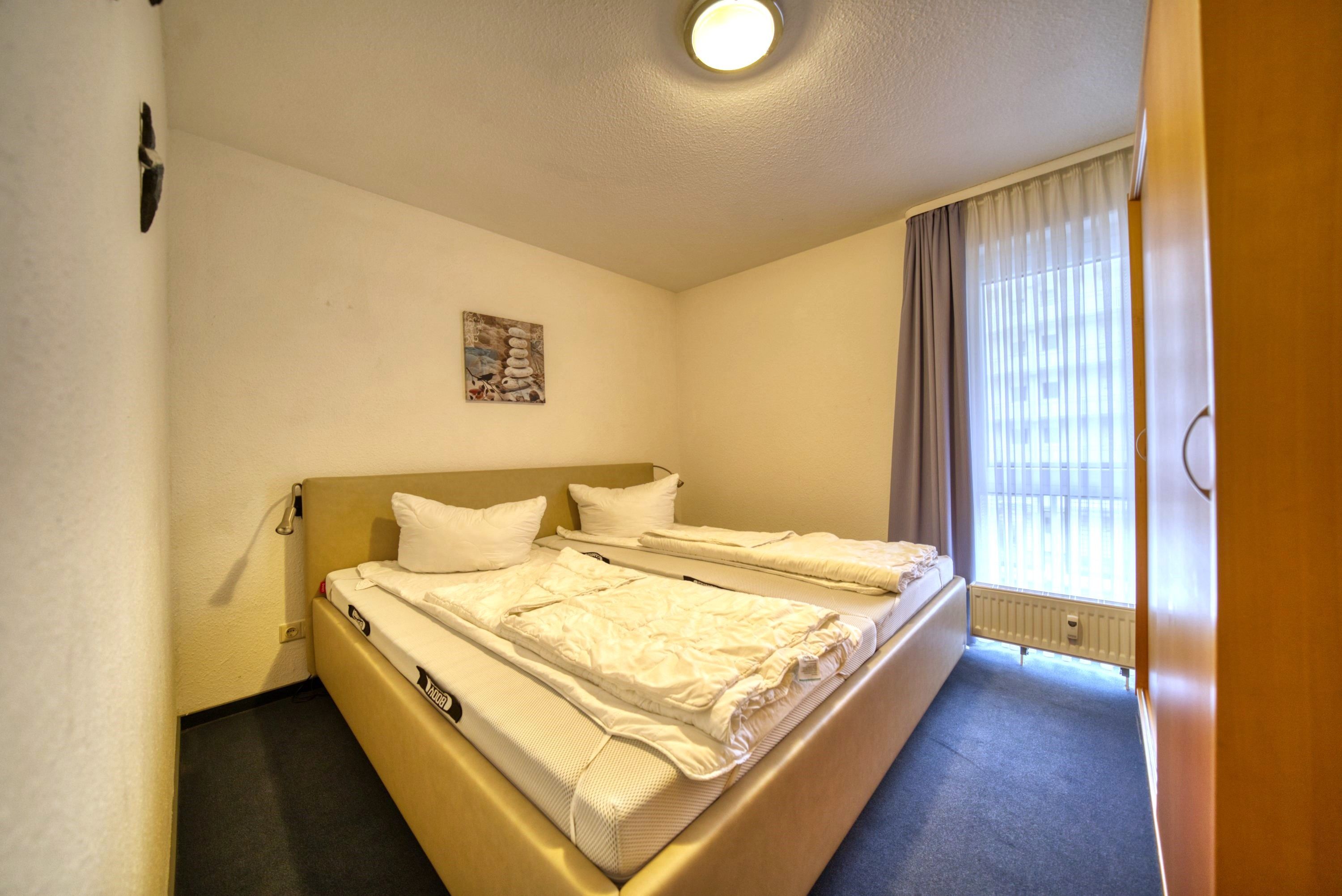 Schlafzimmer: Doppelbett (200x200 cm), TV, Kleiderschrank, Fenster zum Öffnen