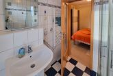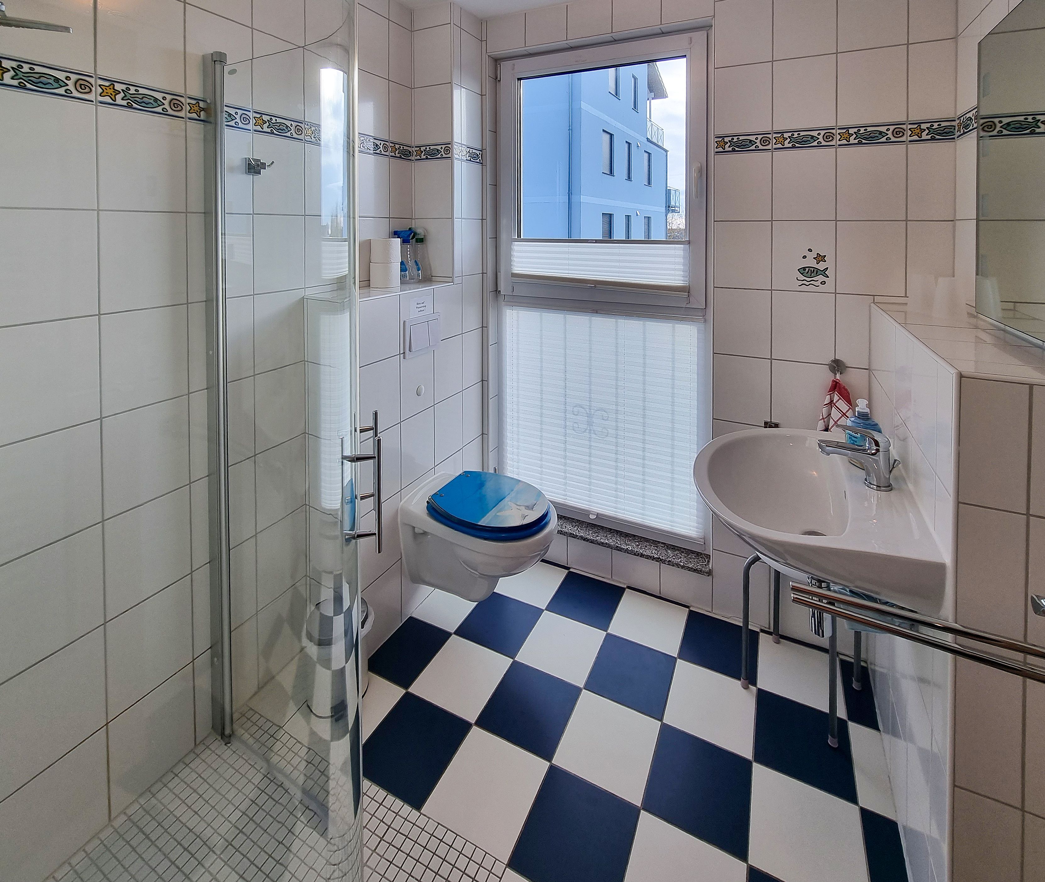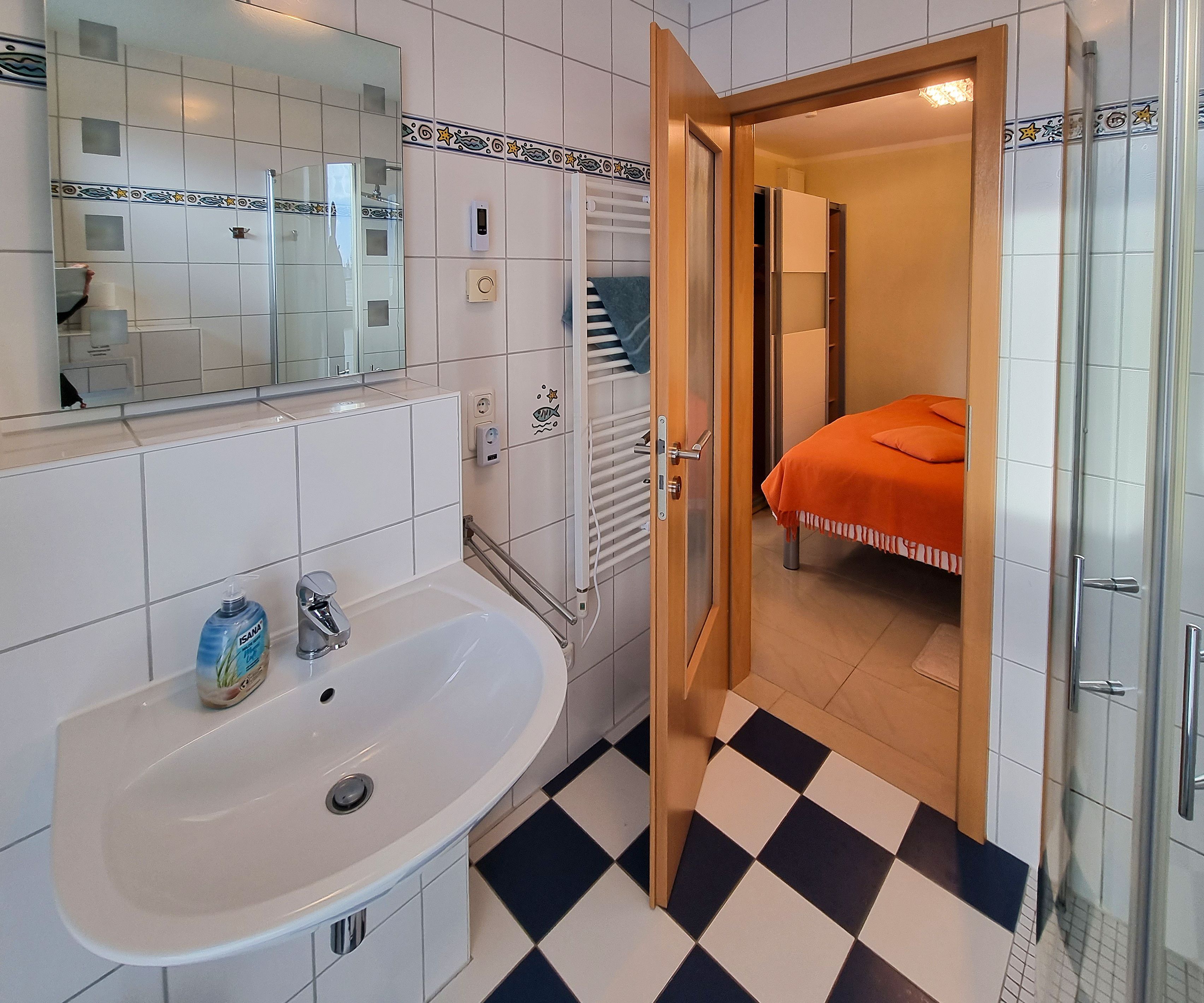 Das Bad verfügt über eine ebenerdige Dusche, Waschtisch und WC.