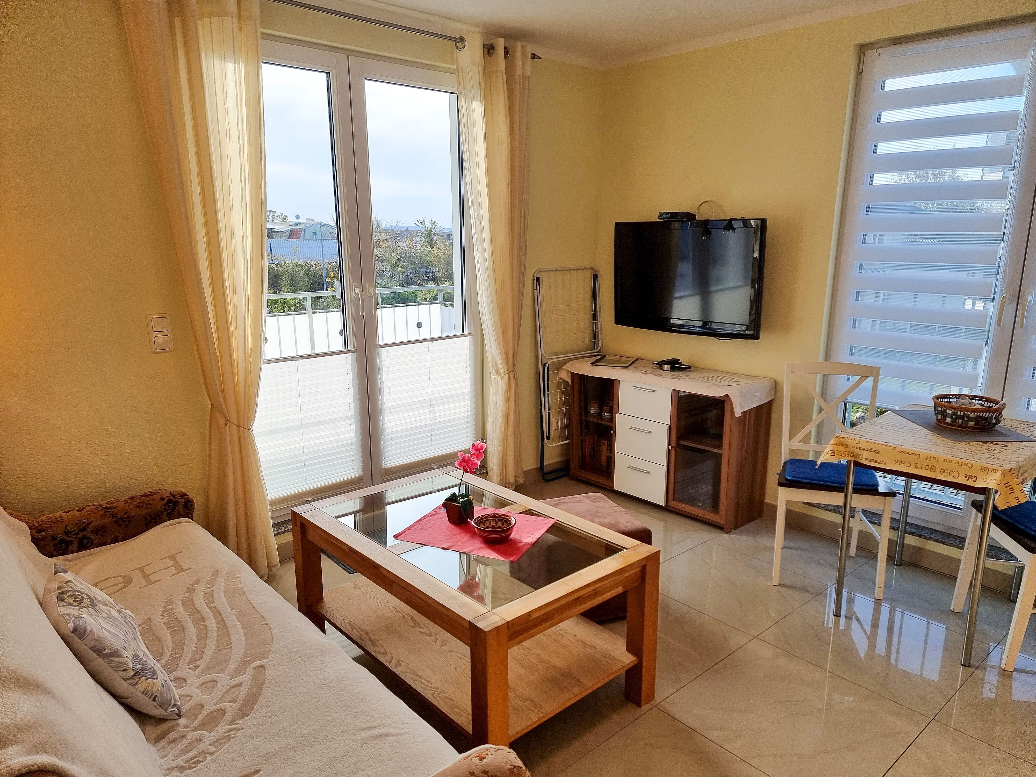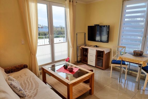 Wohnbereich mit gemütlicher Couchgarnitur, Flachbidfernseher und kostenfreies WLAN.