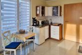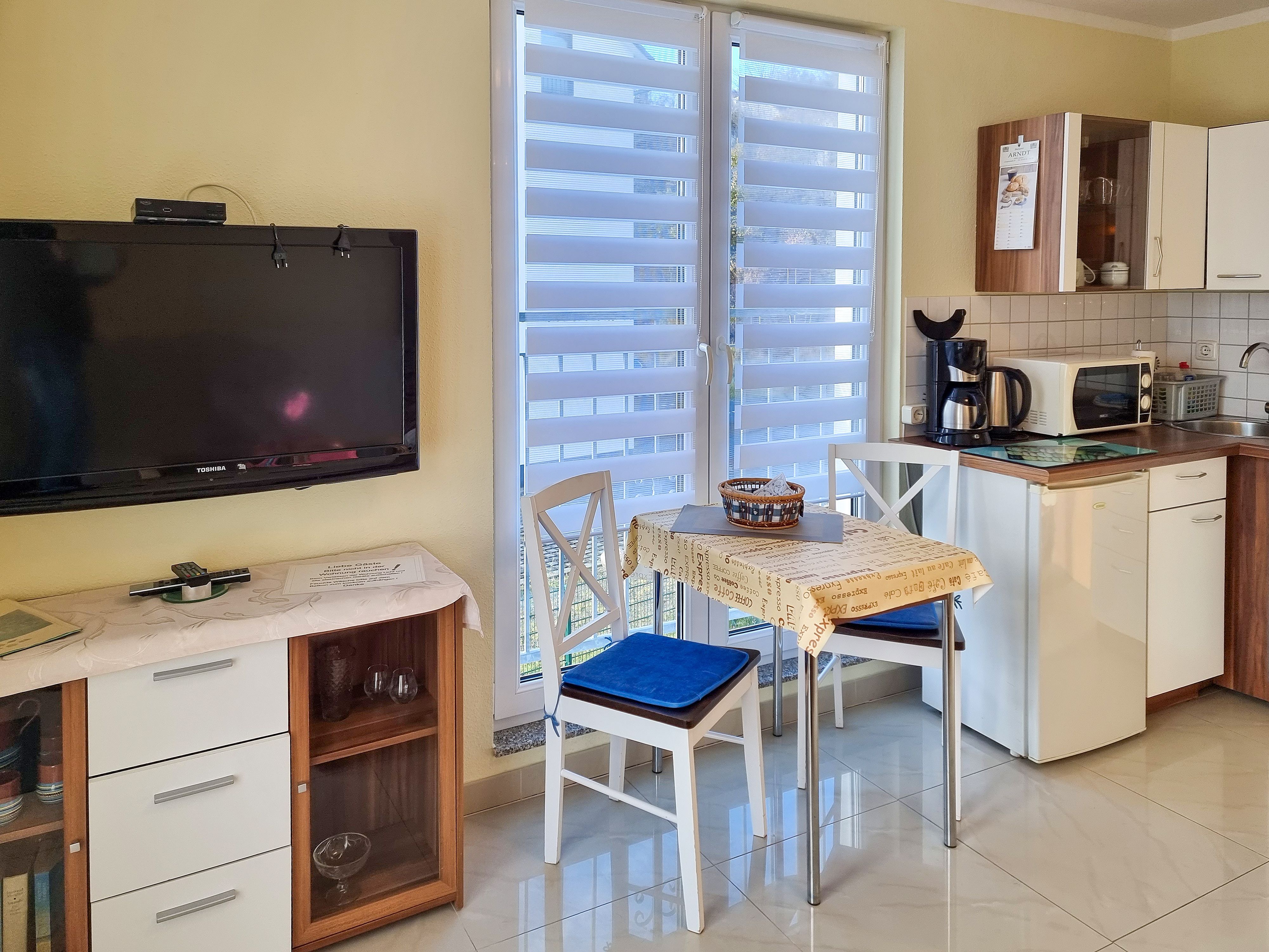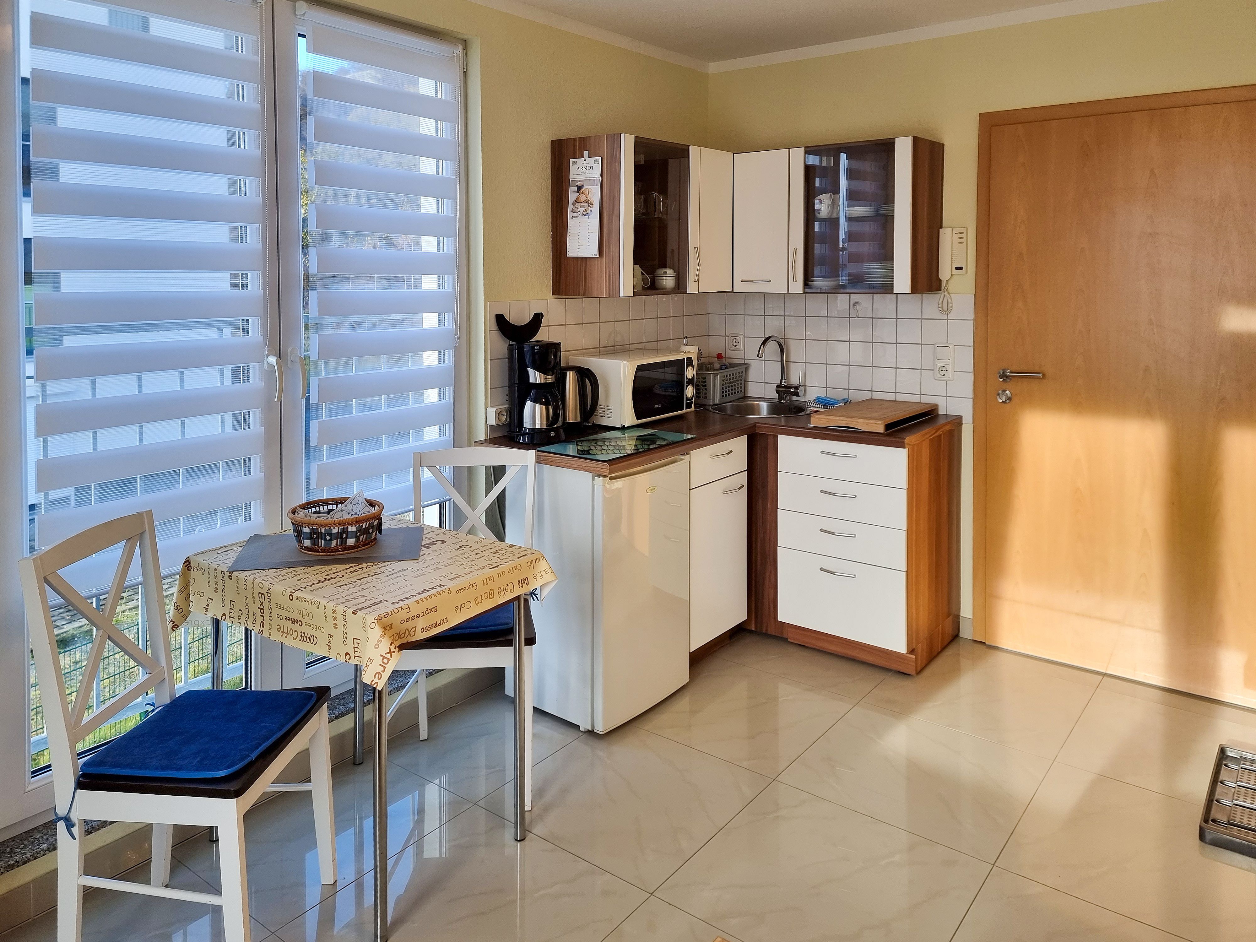 Die Küchenzeile ist offen zum Wohnraum und verfügt über ein 2-Platten-Ceranherd, Mikrowelle, Kaffeemaschine, Wasserkocher, Toaster und Eierkocher.