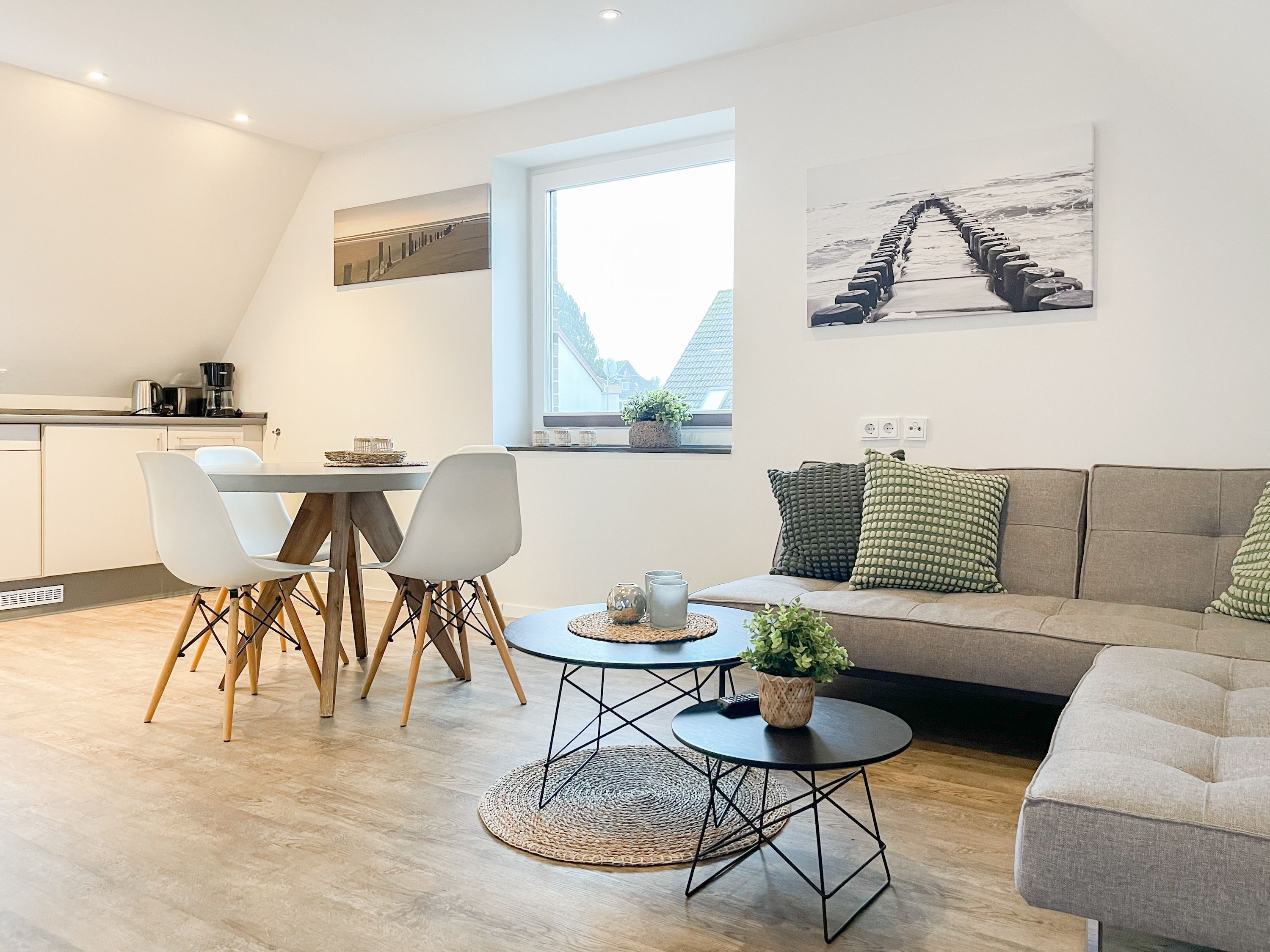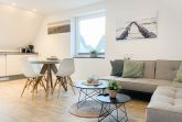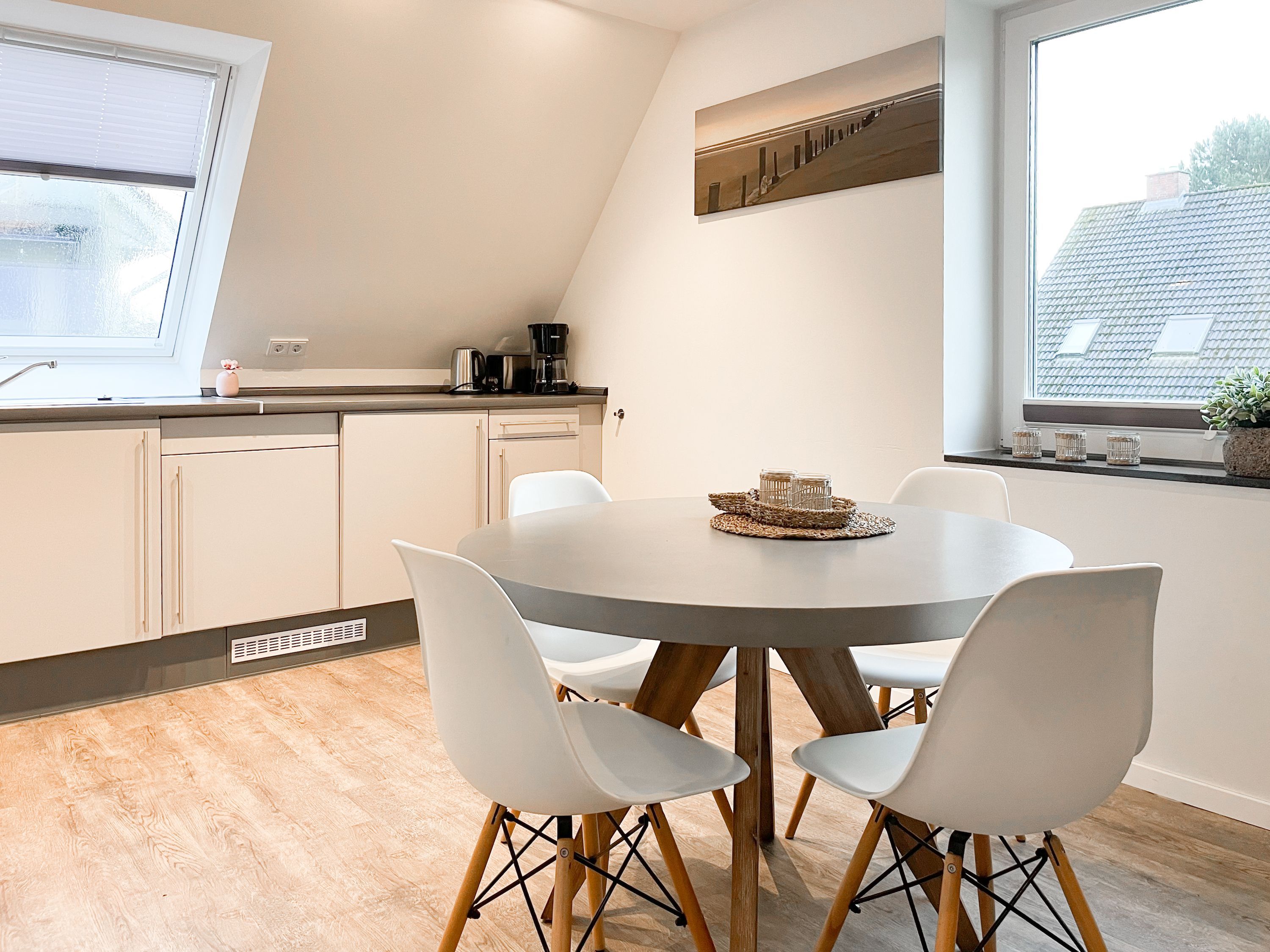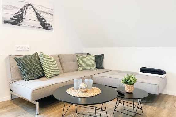 Die Maisonette Waterkant #2 befindet sich im Obergeschoss und bietet mit 2 Schlafzimmern auf 50 qm ausreichend Raum für 2-4 Personen, um einen entspannten Ostseeurlaub in Strandnähe zu verleben. Es erwartet Sie ein heller Wohnbereich mit Sofa, ein anschließender Essbereich und eine offene Einbauküche, gut ausgestattet mit Ceranfeld, Backofen, Geschirrspüler und Kühl- und Gefrierschrank. Das separate Schlafzimmer ist mit einem Doppelbett (140x200), einem Einbauschrank mit viel Staufläche, Verdunkelungsplissee und TV eingerichtet. Das Galerieschlafzimmer im Dachgeschoss (Deckenhöhe 1,80 und halboffen zum Flur) ist über eine Raumspartreppe zu erreichen verfügt über 2 Einzelbetten. Aufgrund der Schrägen und der geringen Deckenhöhe ist es gut für Kinder geeignet. Das Bad ist mit einer Dusche, Waschbecken, WC, Fenster und Handtuchwärmer ausgestattet. WLAN kann selbstverständlich kostenlos genutzt werden. Ein Außenstellplatz gehört zur Wohnung. Ein abschließbarer Fahrradraum kann gemeinschaftlich genutzt werden, ebenso Waschmaschine und Trockner, die im separaten Waschraum untergebracht sind.