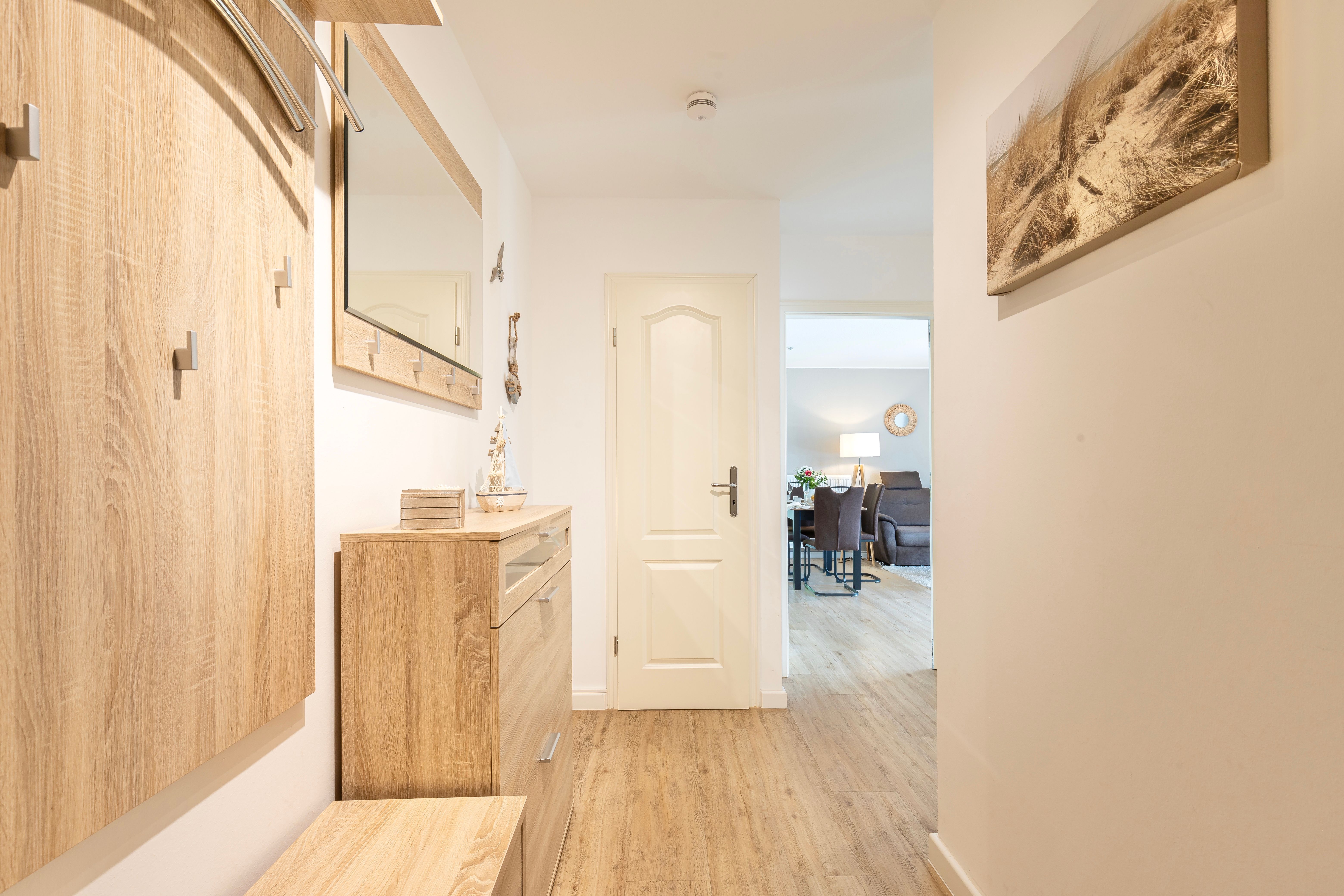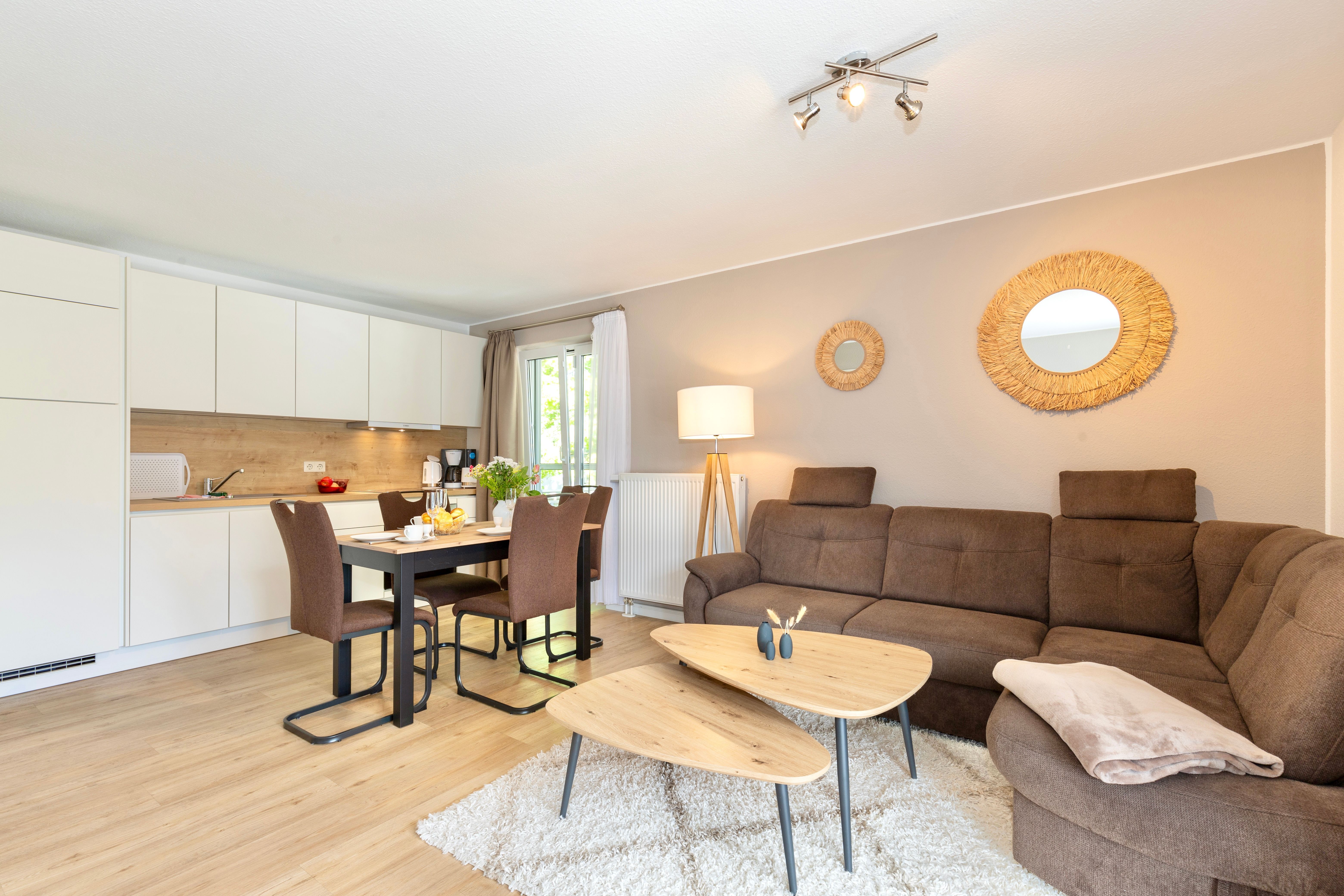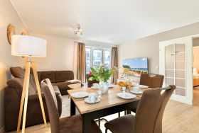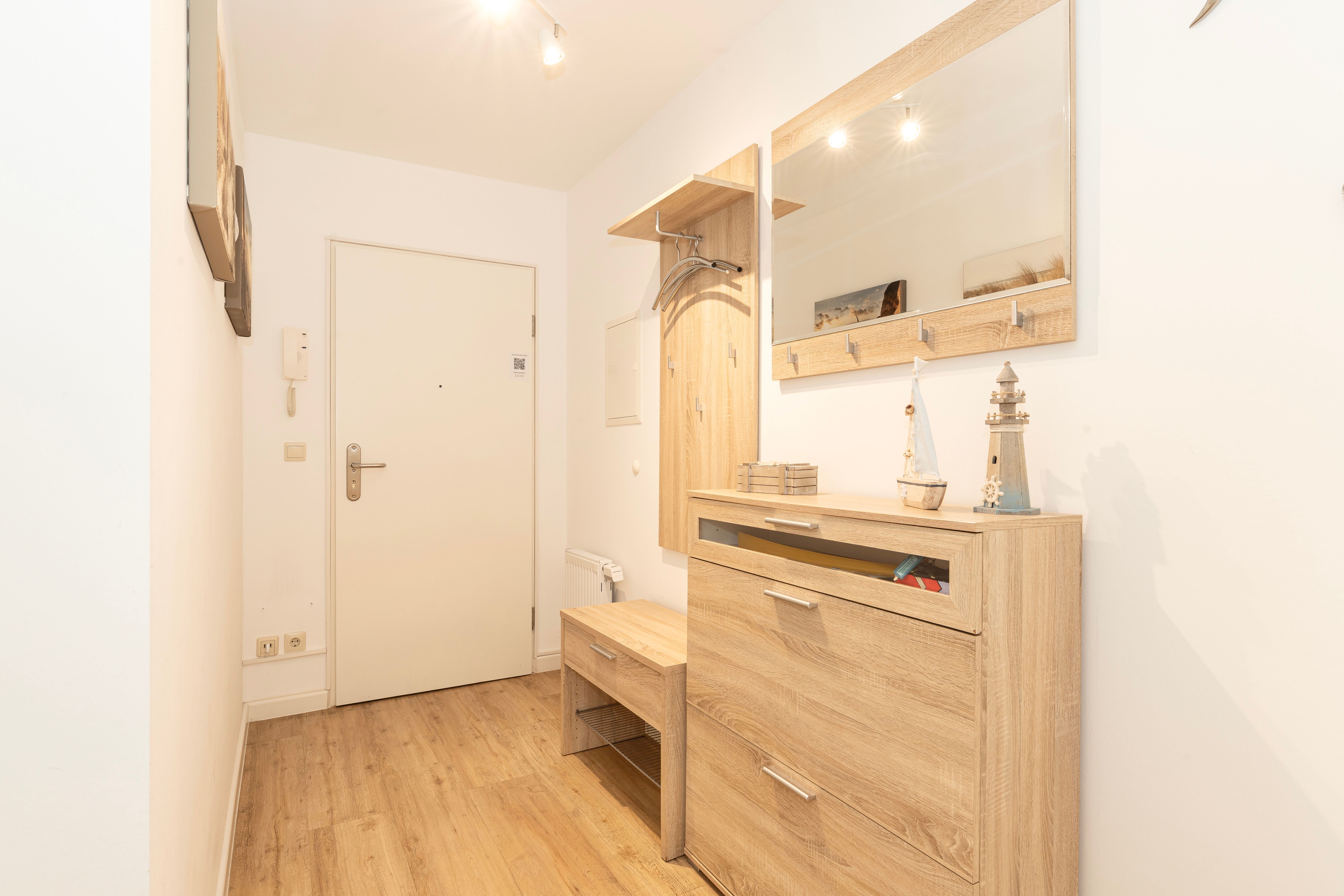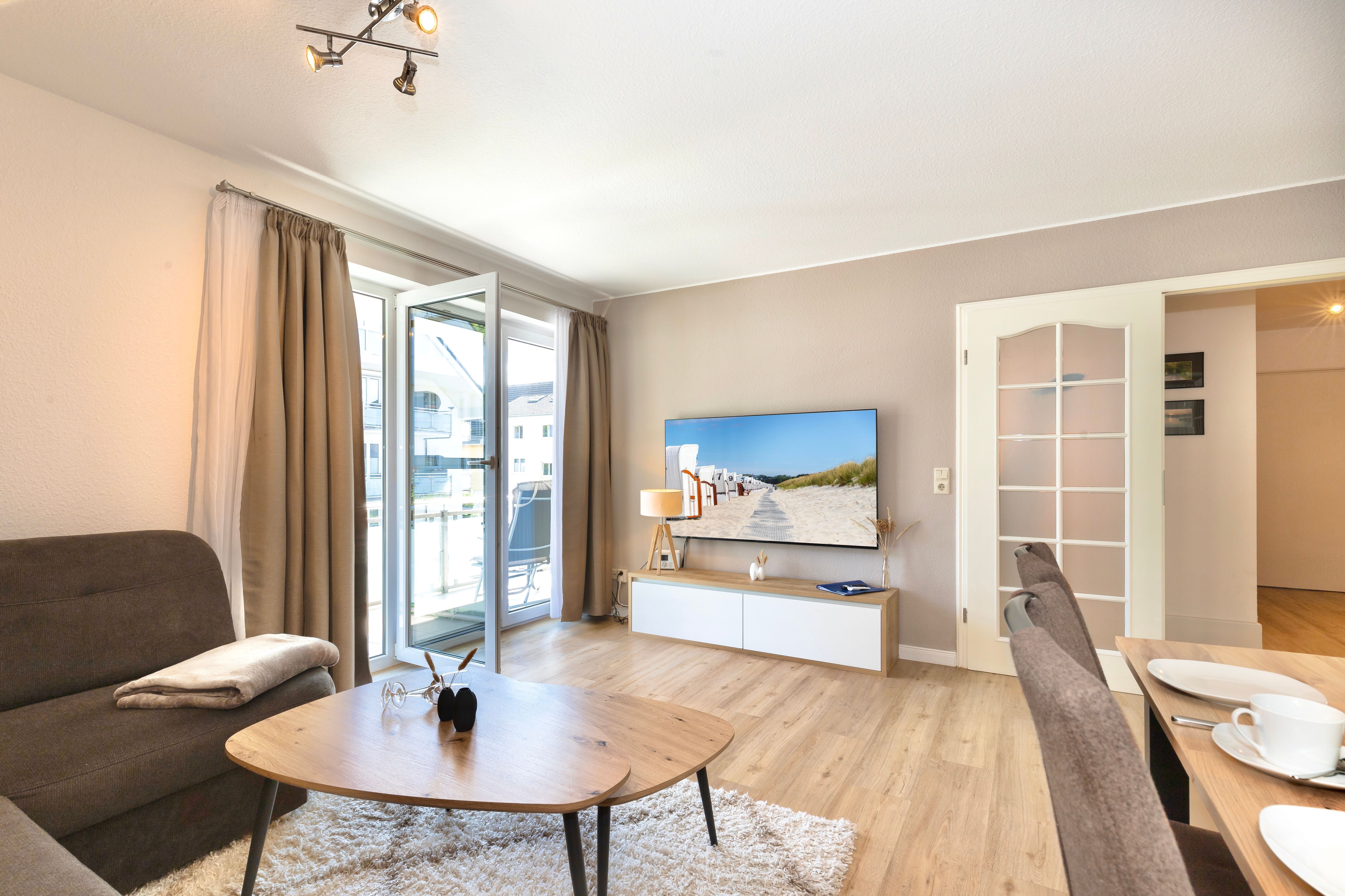Ihre Nichtraucherferienwohnung ist mit viel Liebe zum Detail ausgestattet und eingerichtet worden. Sie wohnen in einer ca. 47 m² 2-Zimmer Wohnung + 27 m² für beide Balkone, die ideal für 2 Personen bzw. eine 3. Person auf der Schlafcouch ausgelegt ist. Die Wohnung befindet sich in der 1. Etage und ist per Fahrstuhl bequem zu erreichen. In der Wohnung finden Sie einen kombinierten Wohn/Koch- und Essbereich. Die integrierte Küchenzeile lässt mit einer Mikrowelle, Backofen, Ceranfeld, Spülmaschine, Kühlschrank mit Gefrierfach, Wasserkocher, Toaster, Kaffeemaschine, Senseo Padmaschine und anderen praktischen Helfern keine kulinarischen Wünsche offen. Im Wohnbereich sind weiterhin ein Esstisch, eine gemütliche Couch (Schlafmöglichkeit 3. Person/ 1,20m x 1,90m) vorhanden. Abgerundet wird der Wohnbereich mit einem Smart-TV, DAB-Radio, DVD-Player und einer Musikanlage. Ein WLAN-Zugang steht Ihnen inklusive zur Verfügung. Der Ostbalkon ist vom Wohn/Essbereich, sowie der Südbalkon vom Wohnbereich und vom Schlafzimmer begehbar. Um Sie vor Mücken zu schützen, sind die Balkontüren des Ostbalkons, sowie des Südbalkons vom Schlafzimmer mit einer Insektenschutztür versehen. Das Schlafzimmer ist mit einem Doppelbett (1,80m x 2,00m), Nachttischkonsolen, Flachbild-TV, Radio und einem Kleiderschrank ausgestattet. Insektenschutzgitter sorgen für einen ruhigen Schlaf. Das Bad verfügt über eine Dusche mit flachem Einstieg, Waschbecken, Kosmetikspiegel, Fön und WC. Ein Bügelbrett, ein Bügeleisen sowie Reinigungsutensilien stehen Ihnen zusätzlich zur Verfügung. Ein eigener PKW-Stellplatz (Nr. 10, Einfahrtshöhe 1,90m) befindet sich in der Tiefgarage des Hauses. Ihre Fahrräder können Sie im eigenen abschließbaren Keller abstellen. 2 Fahrräder stehen Ihnen zur Nutzung zur Verfügung, sind aber nicht Bestandteil der Buchung, da durch höhere Gewalt nicht immer die Nutzung garantiert werden kann. Haustiere sind nicht erlaubt. Die Erstausstattung eines Wäschepaketes (komplette Bettwäsche, 1 Duschhandtuch, 1 kleines Handtuch) können Sie bis 14 Tage vor Anreise gegen einen Aufpreis dazu buchen oder durch eigene ergänzen. Ab 2 gebuchten Paketen erhalten Sie einmalig 1 Geschirrhandtuch und 1 Duschvorleger hinzu.