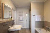 Das Bad besitzt eine ebenerdige breite Dusche mit einer ca. 1,20m breiten Tür sowie einer Badewanne. Eine Waschmaschine und ein Wäscheständer sind ebenfalls vorhanden.