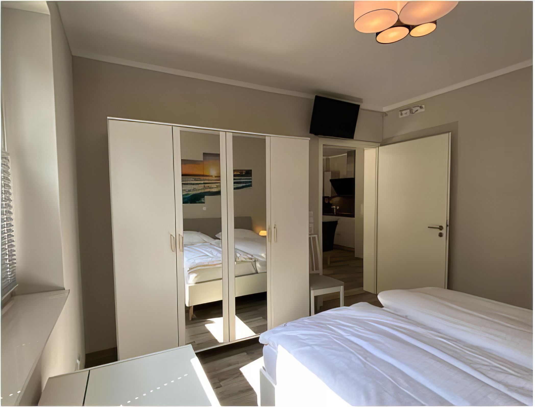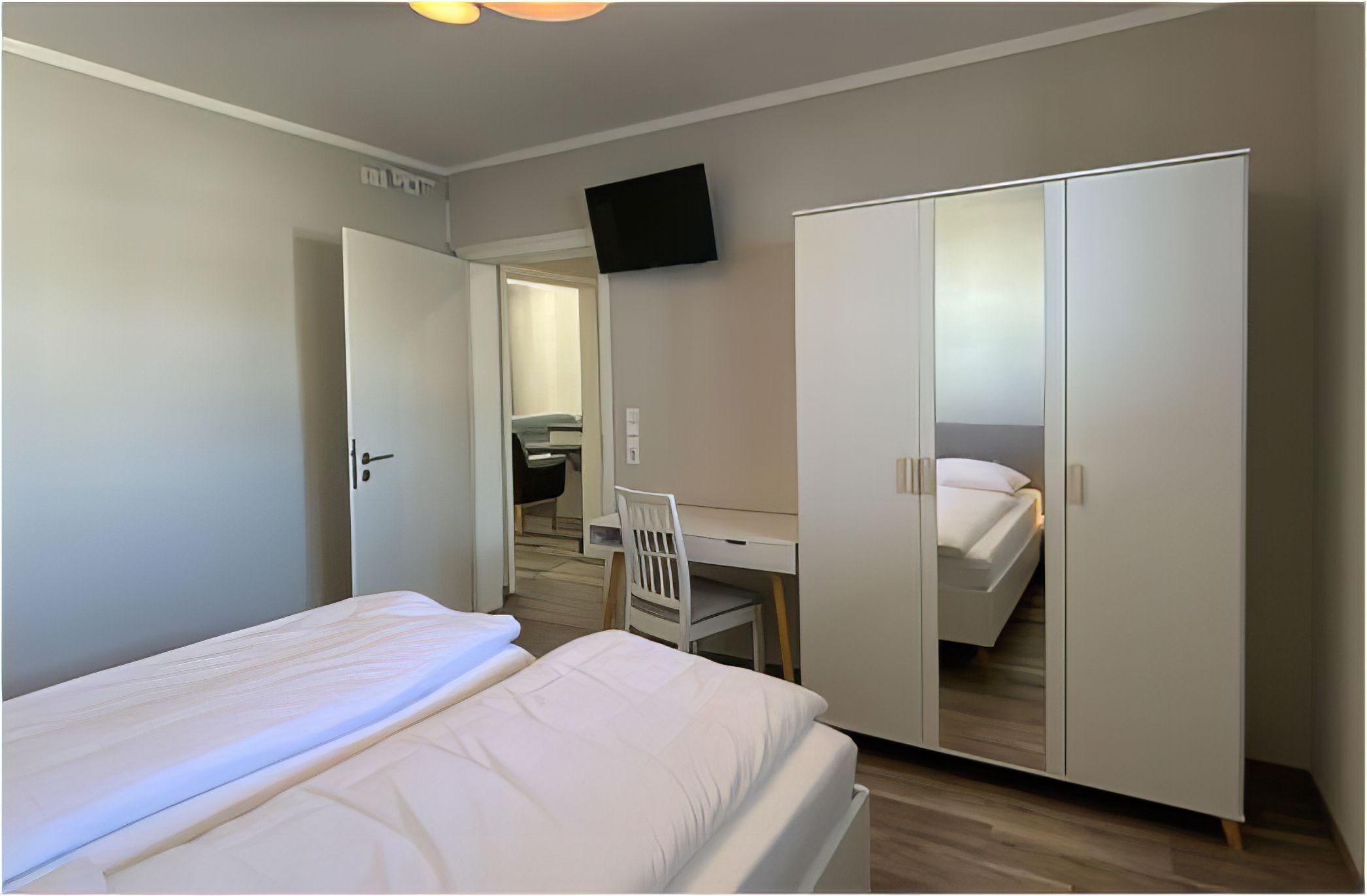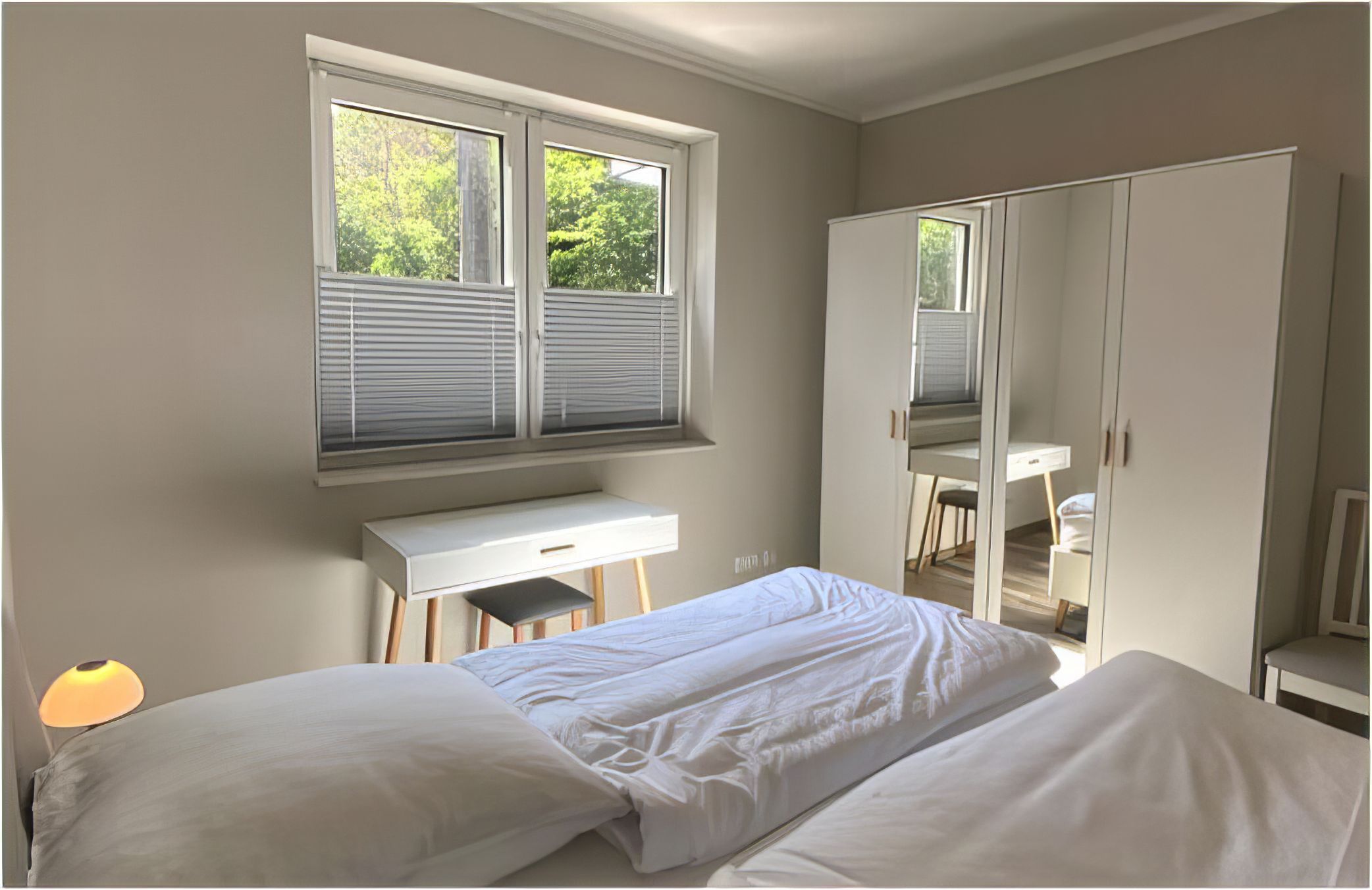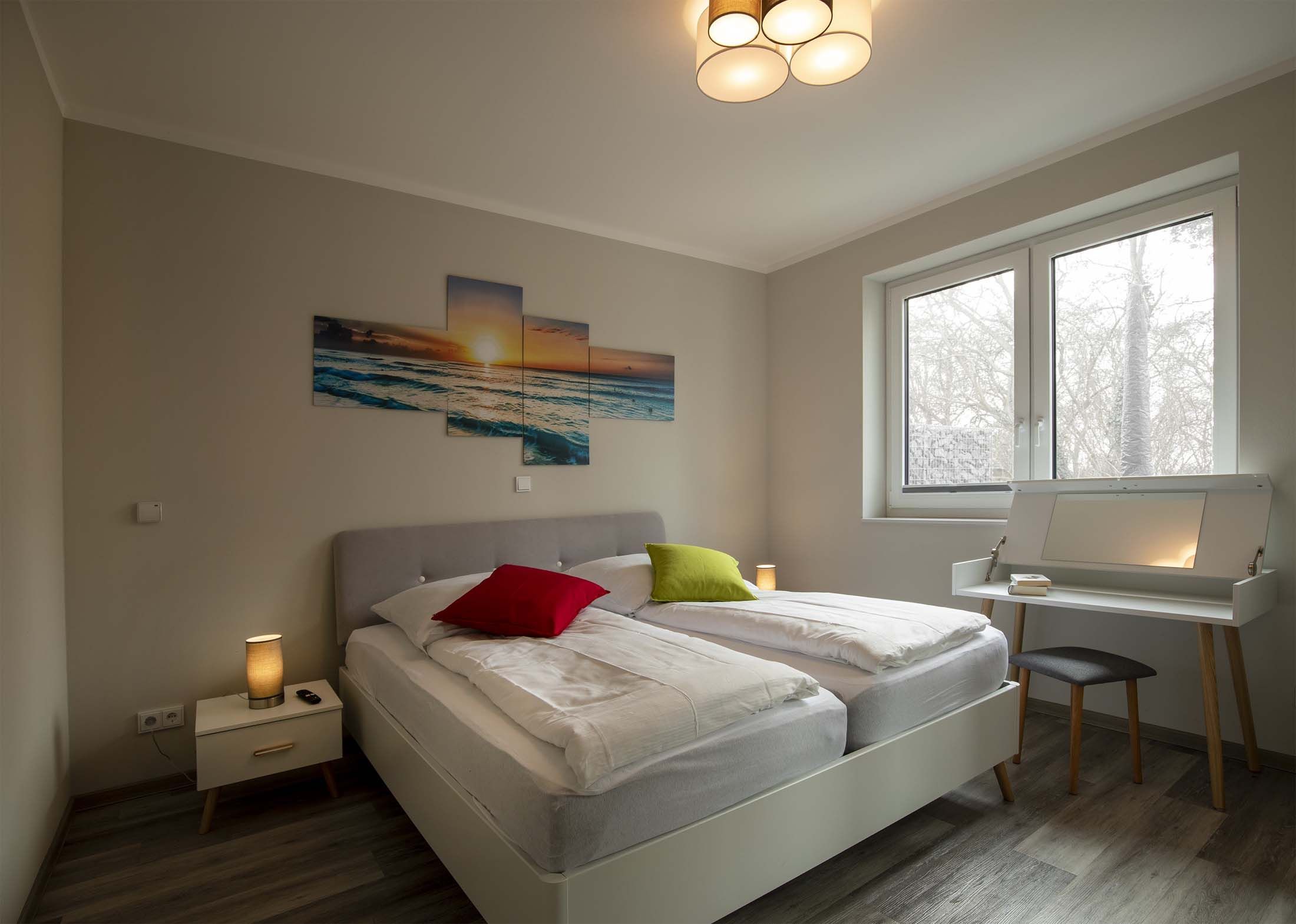Alle 4 Betten sind mit hochwertigen Matratzen ausgestattet, welche eine weiche und eine härtere Seite haben. Das Hauptschlafzimmer verfügt über ein Doppelbett, einen Frisiertisch und einen 32 Smart TV. Im zweiten Schlafzimmer befindet sich ebenfalls ein Smart TV, 2 Einzelbetten sowie ein Schreibtisch.