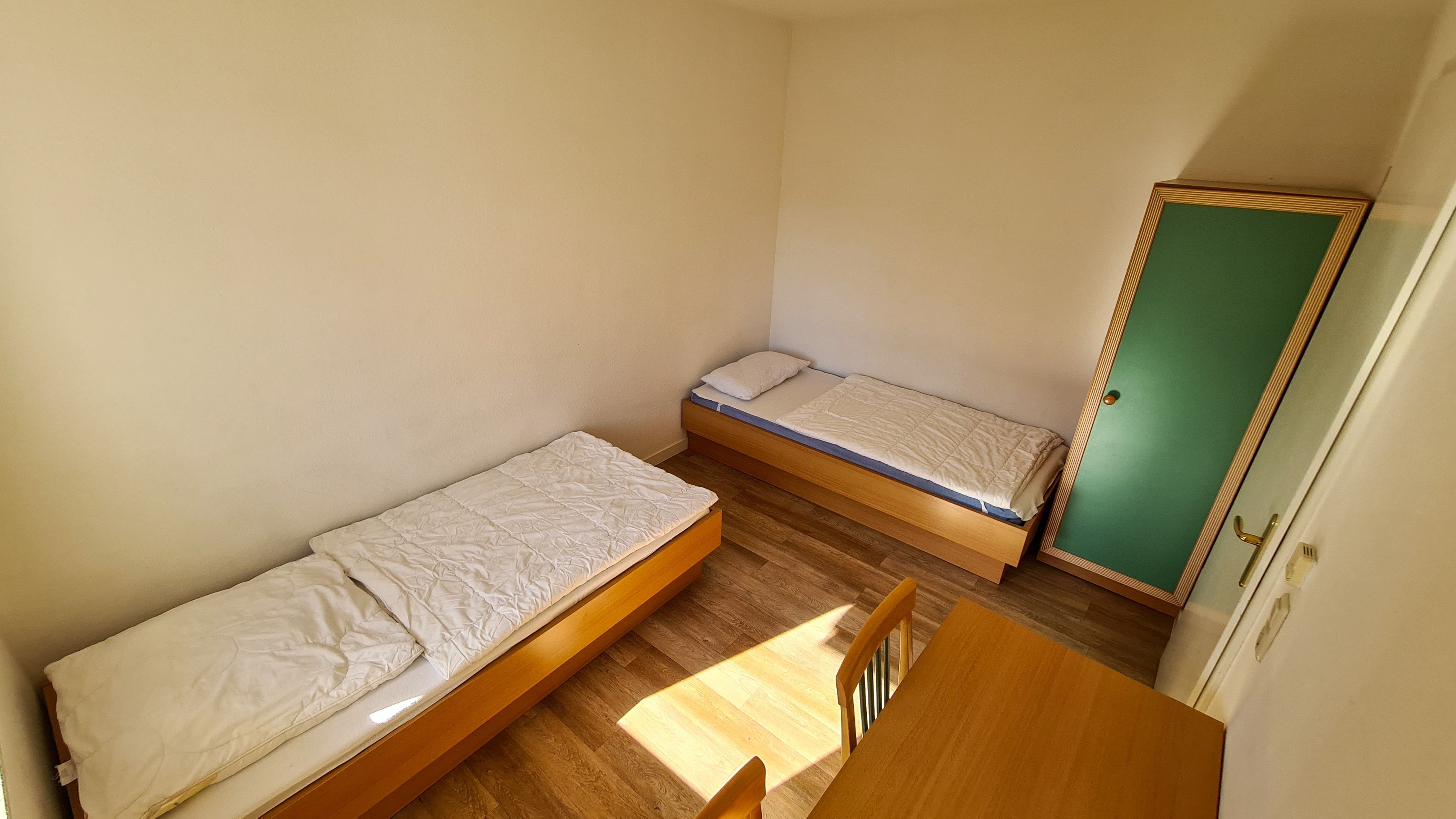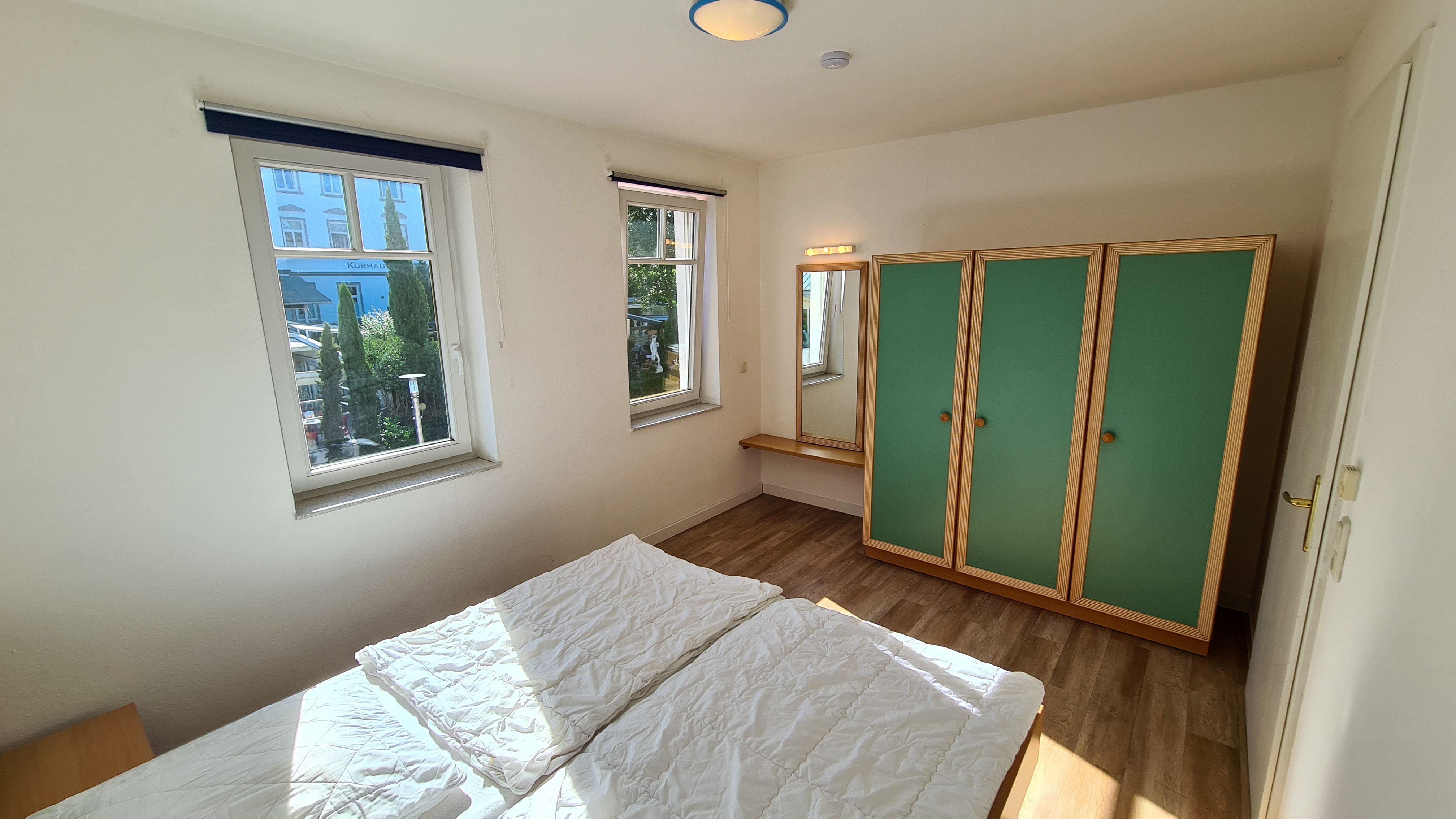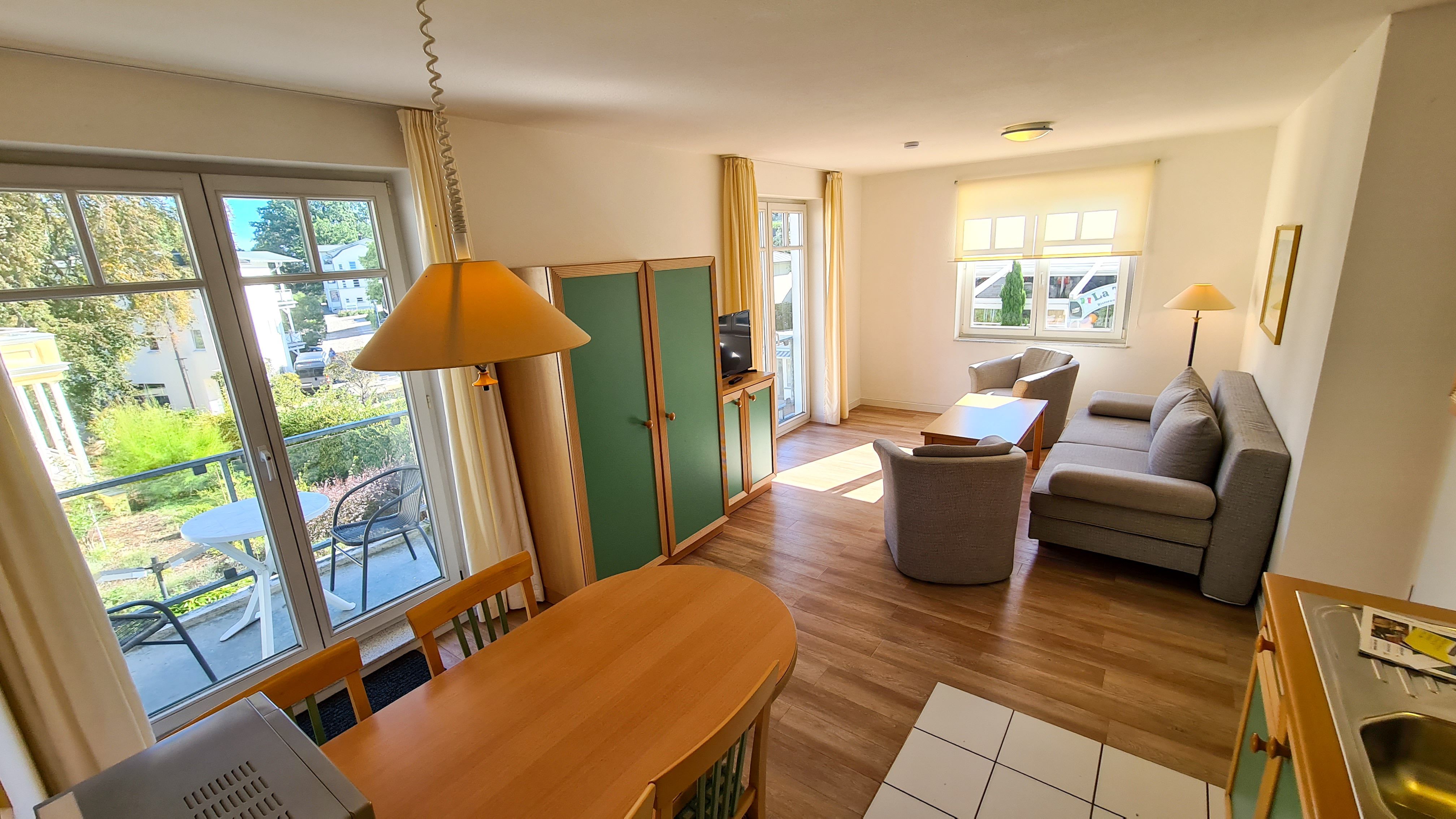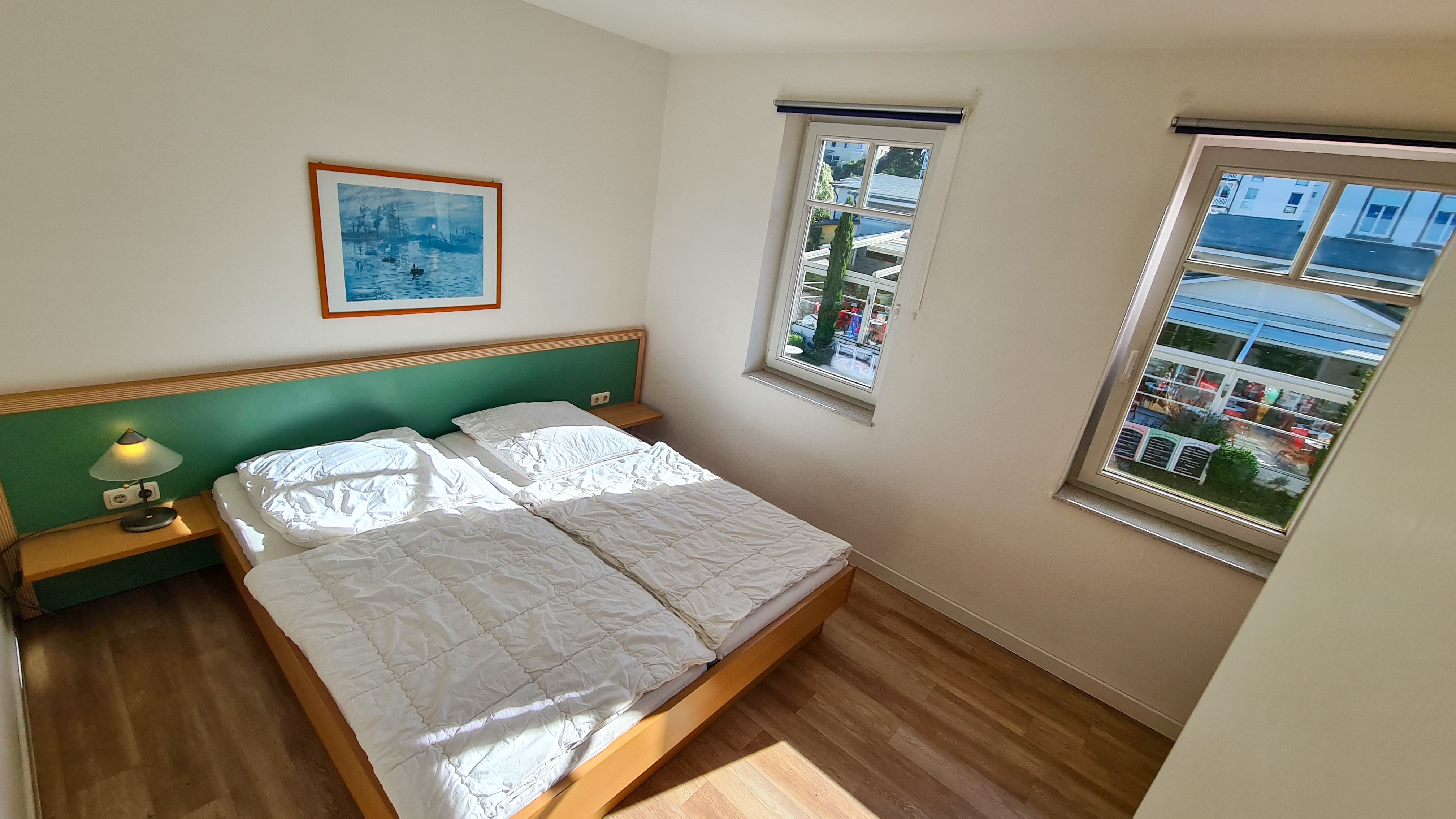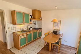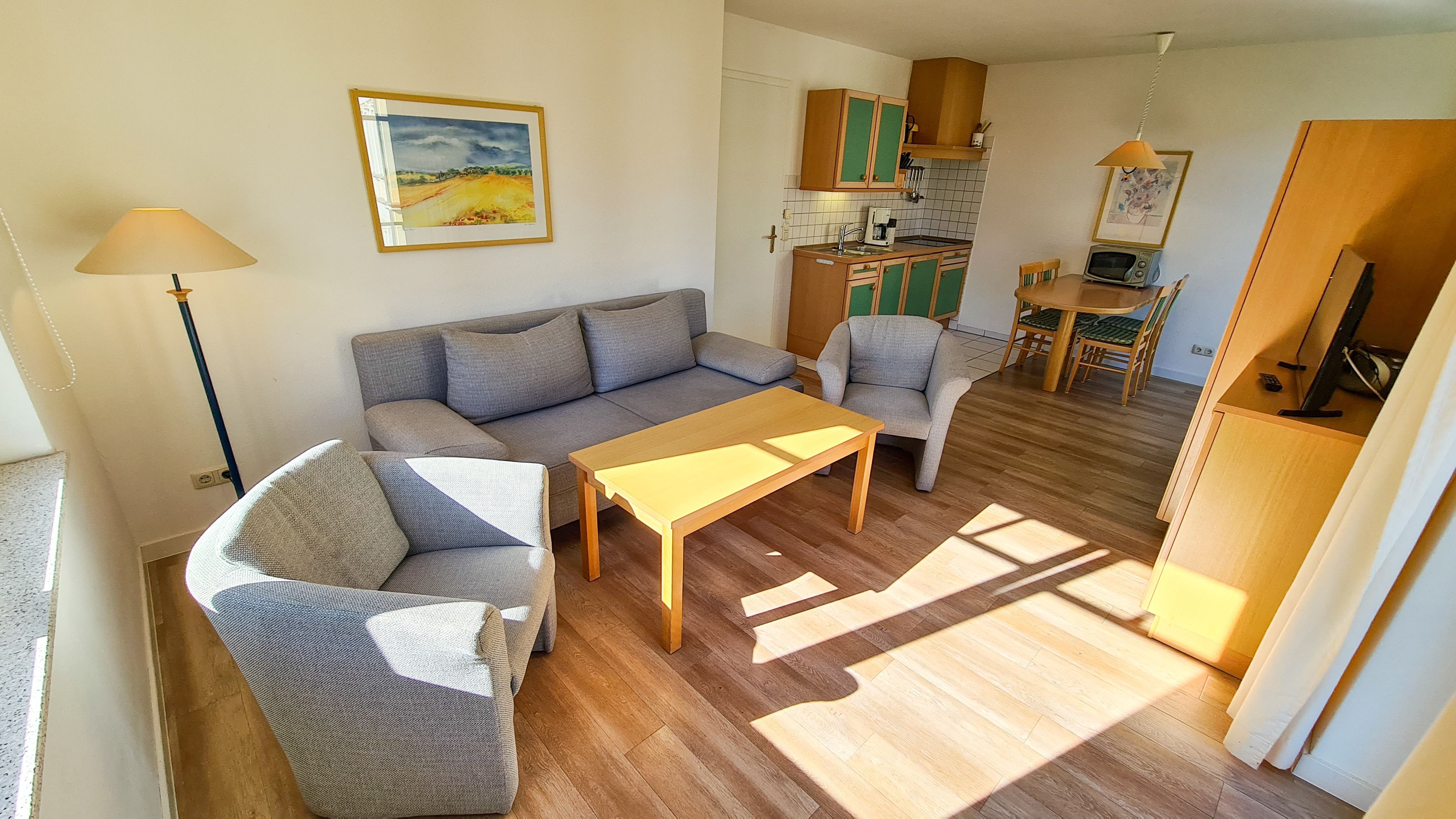 Sie besteht aus einem Wohnzimmer mit Sitzecke (Schlafsofa), TV, Balkon und komplett eingerichteter Küchenzeile (4 Kochplatten, Kühlschrank, Mikrowelle, Kaffeemaschine, Wasserkocher, Toaster), einem Schlafzimmer mit Doppelbett, einem Schlafzimmer mit zwei Einzelbetten und Bad mit Dusche und WC.