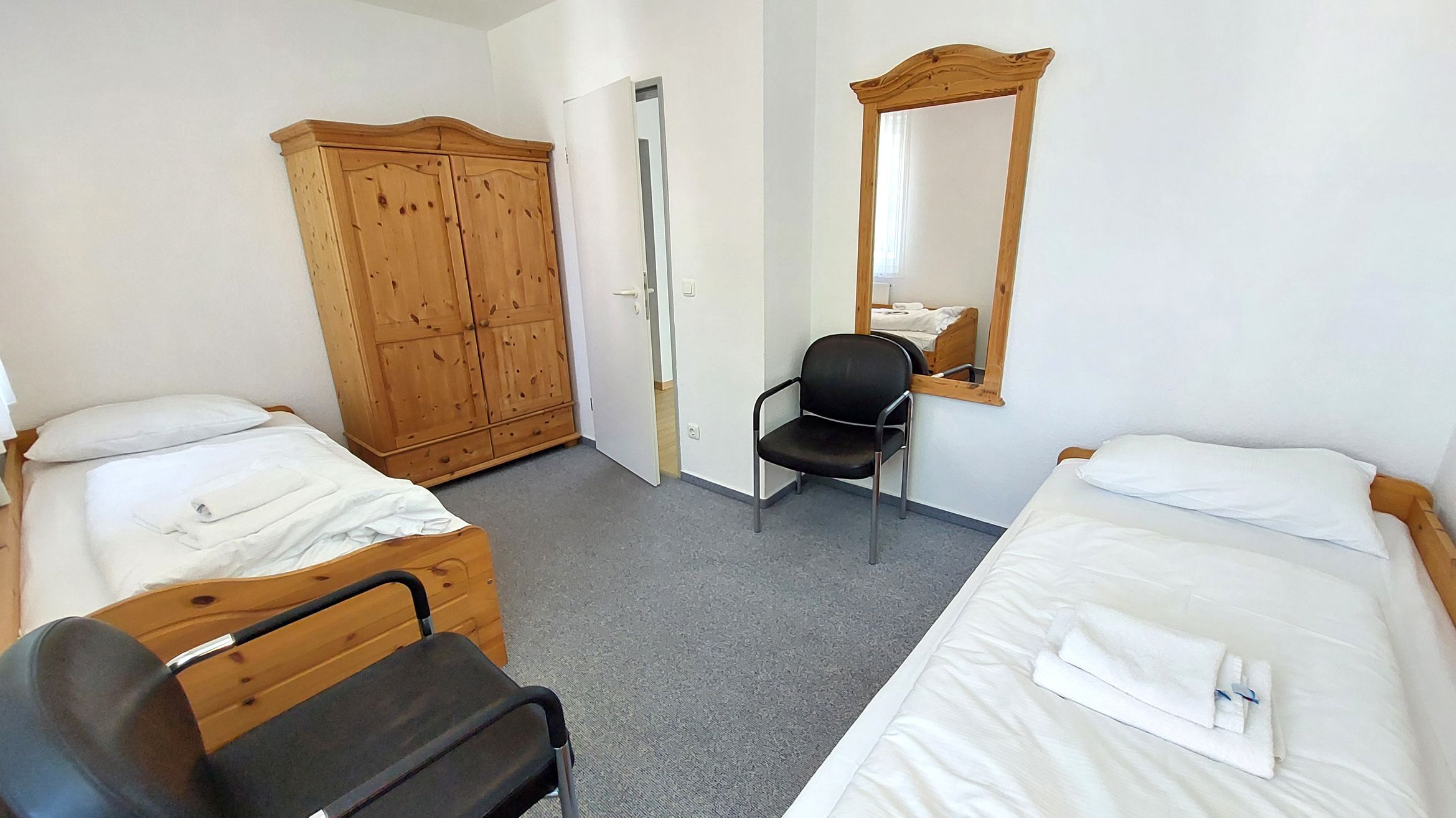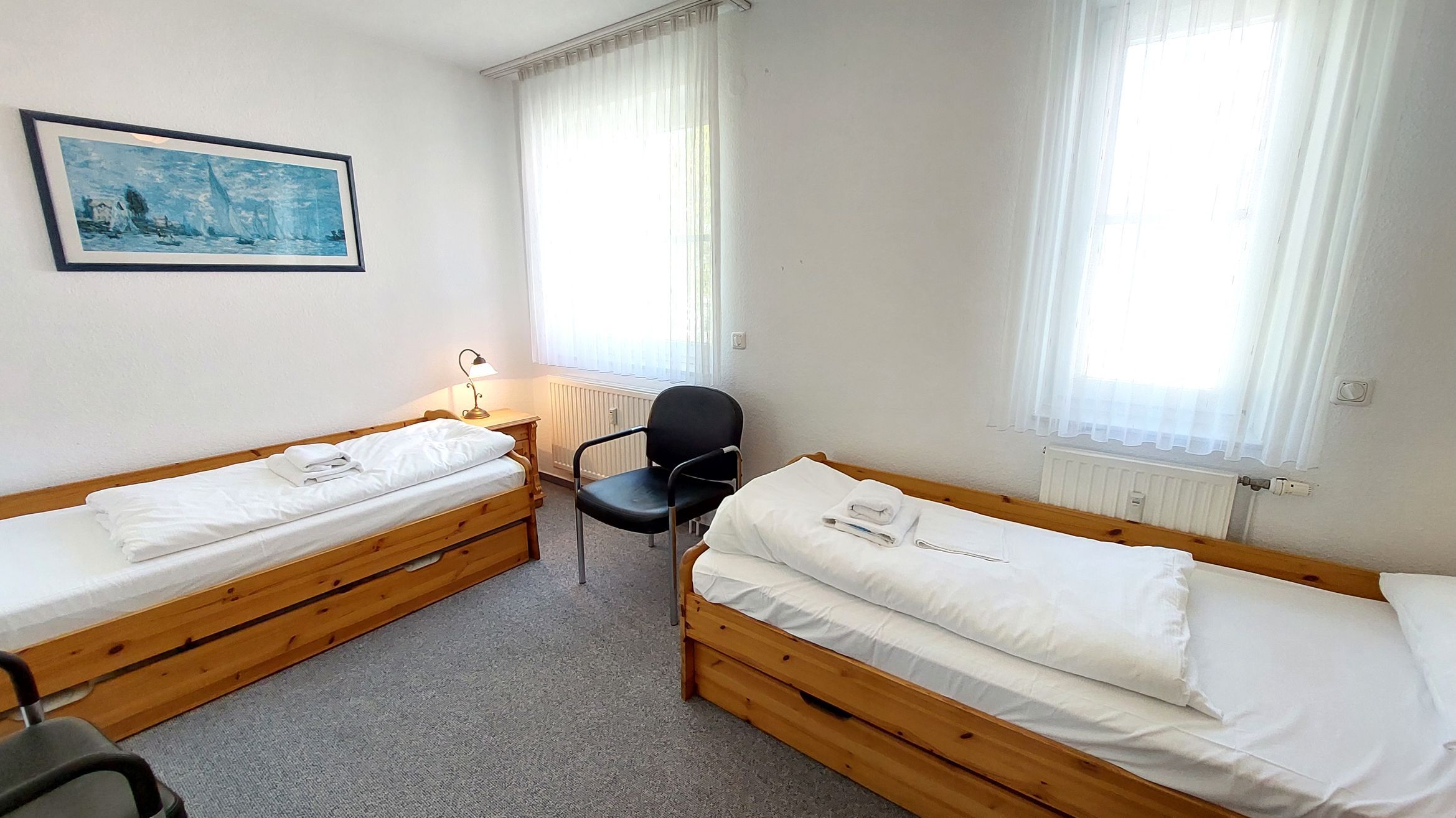 Im zweiten Schlafzimmer befinden sich 2 Einzelbetten, wovon eines ein zusätzliches Schubladenbett beinhalten.