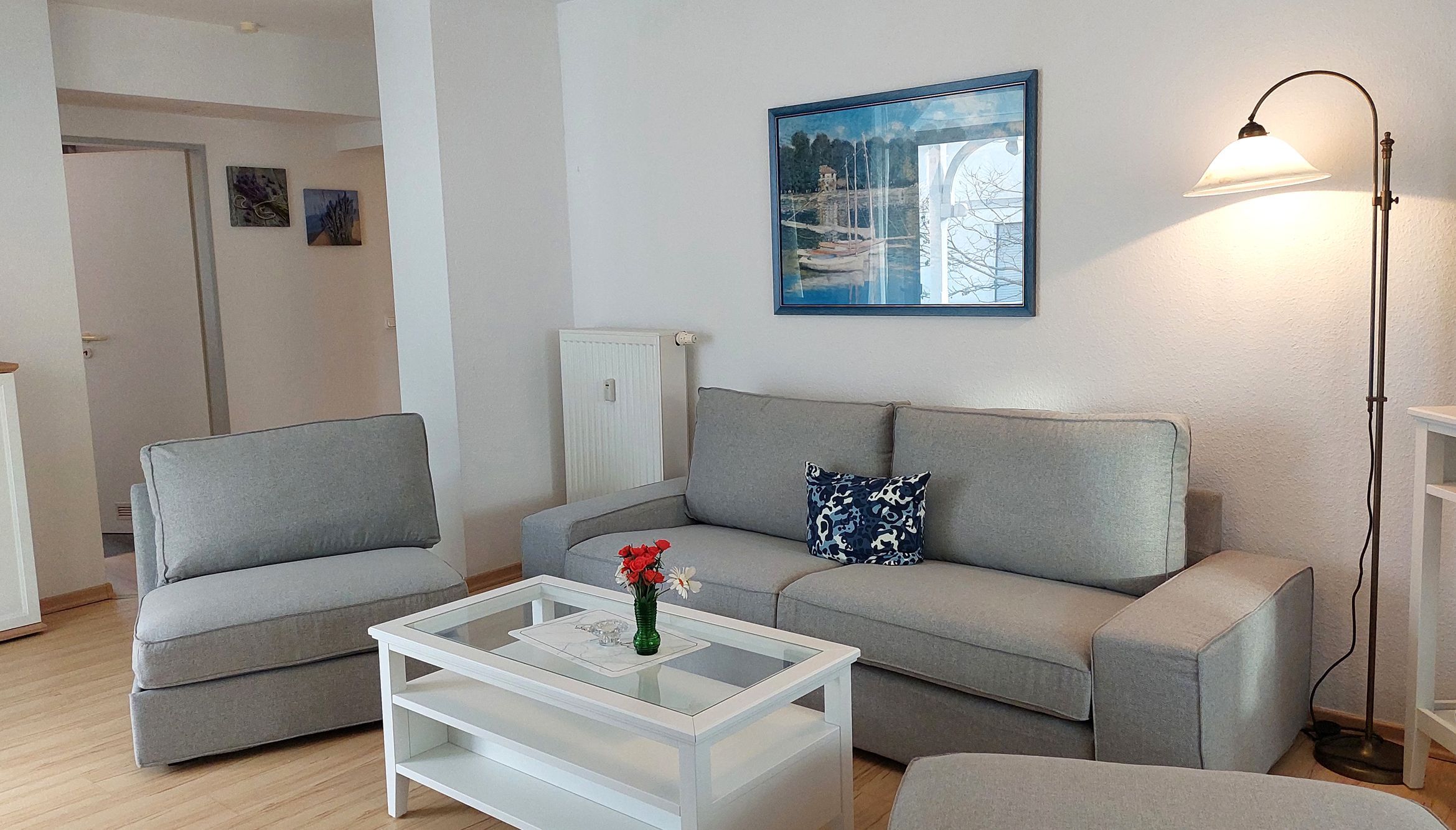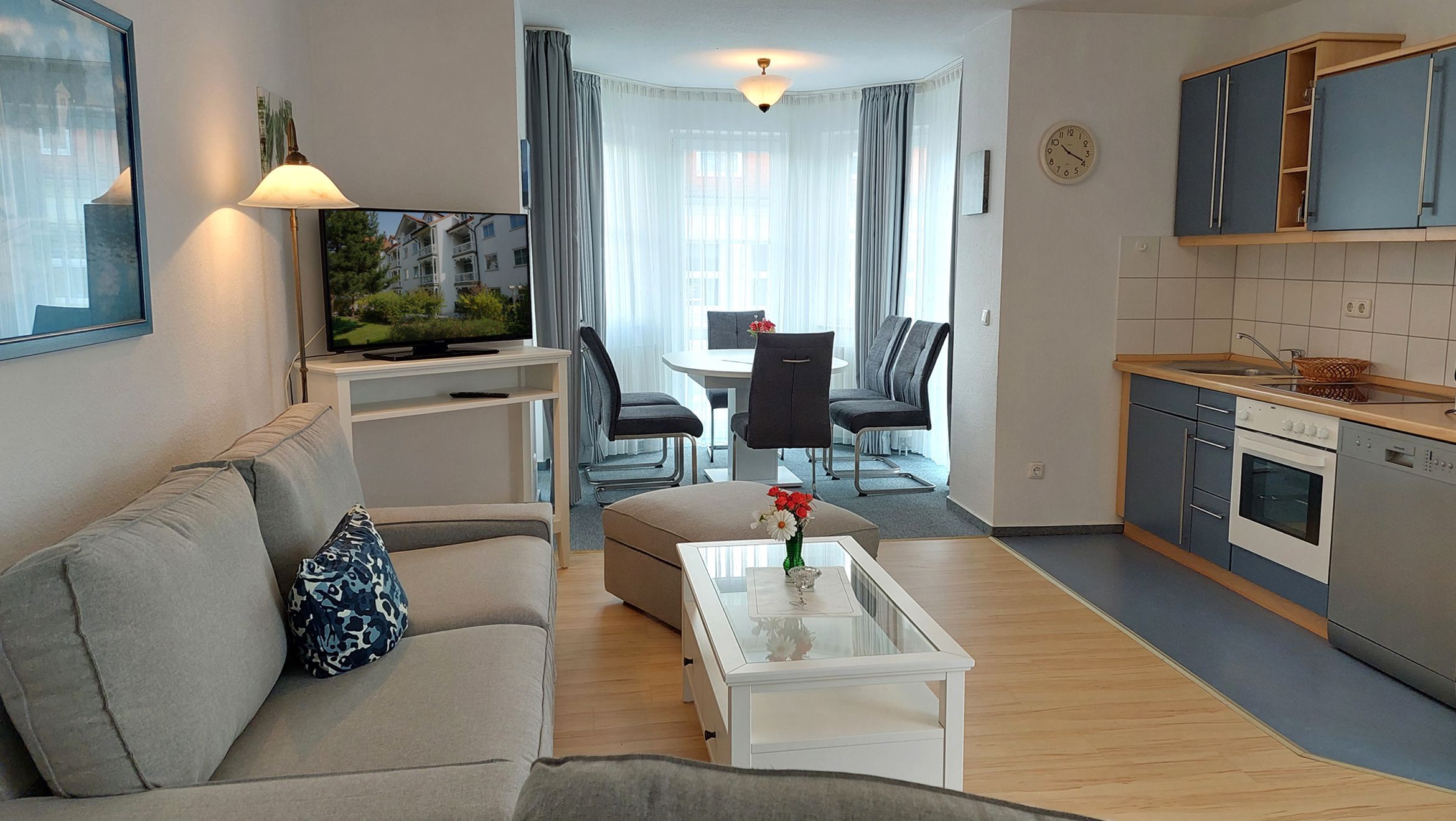 Der große und helle Wohnbereich bietet eine gemütliche Sitzlandschaft samt 50 Smart-TV, Radio und kostenfreien WLAN.