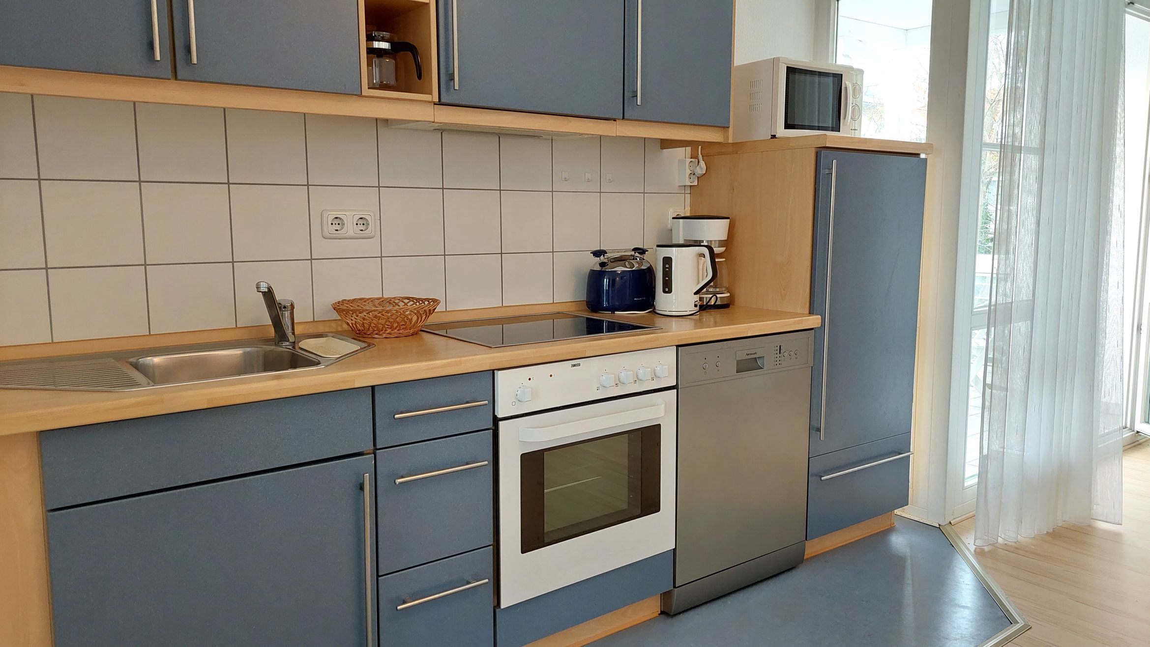 Der aufklappbare Sessel bietet bei Bedarf eine weitere Schlafgelegenheit. Es gibt einen großzügigen Essbereich mit Sitzplätzen für 6 Personen und eine voll ausgestattete Küchenzeile mit Geschirrspüler, Backofen,. Cerankochfeld, Mikrowelle und Kühlschrank samt Gefrierfach.