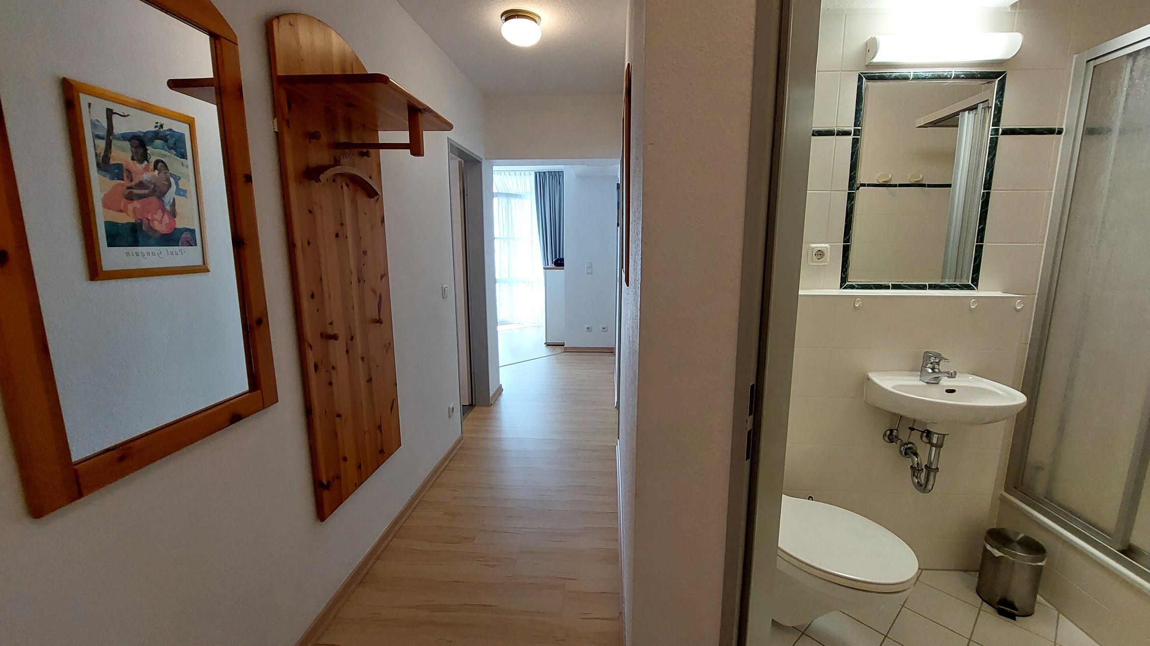 Vom Eingangsbereich, samt großem Spiegel und Garderobe, gelangen Sie in beide Schlafzimmer und Vollbäder, sowie in den nützlichen Abstellraum und in den großen Wohnbereich.