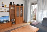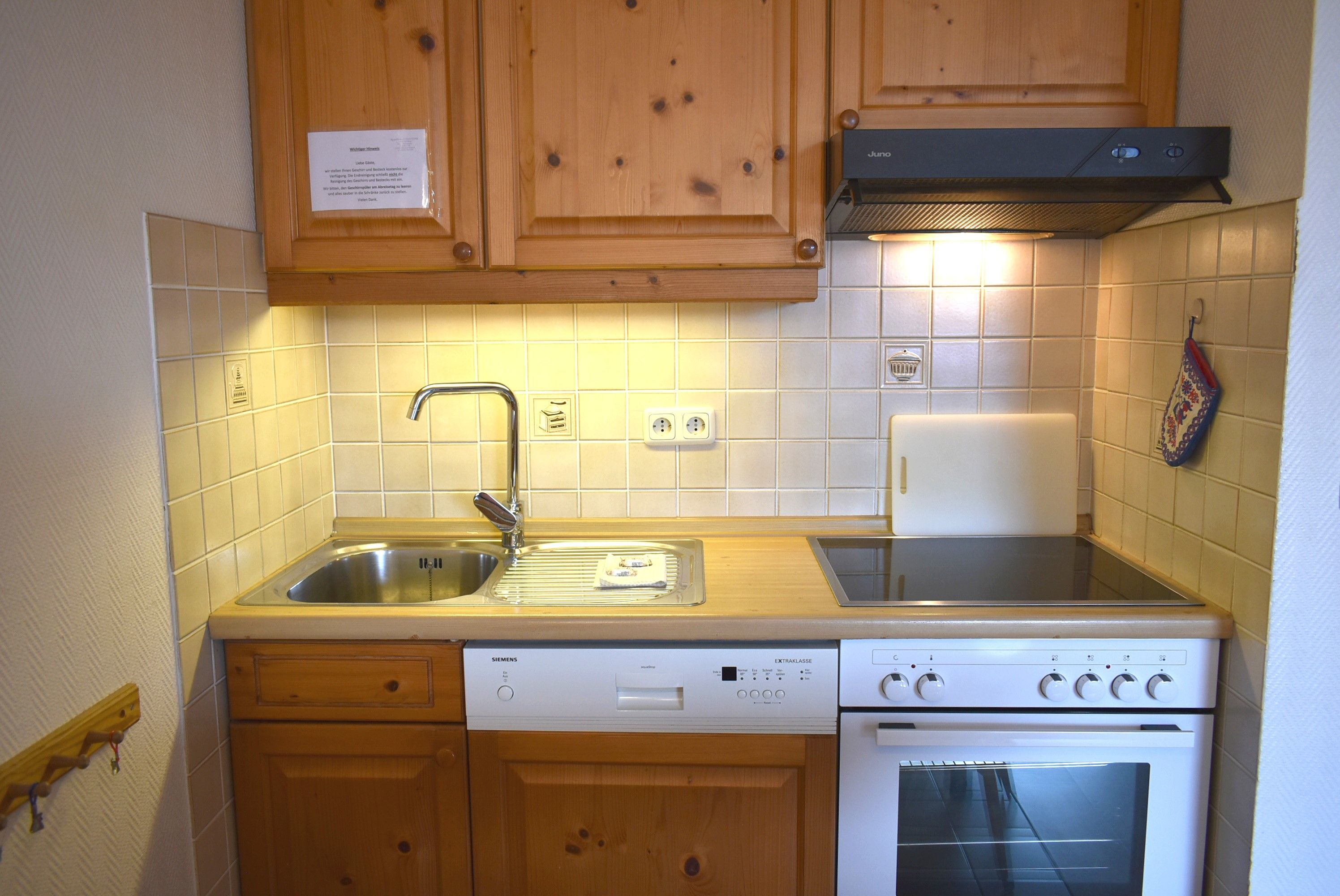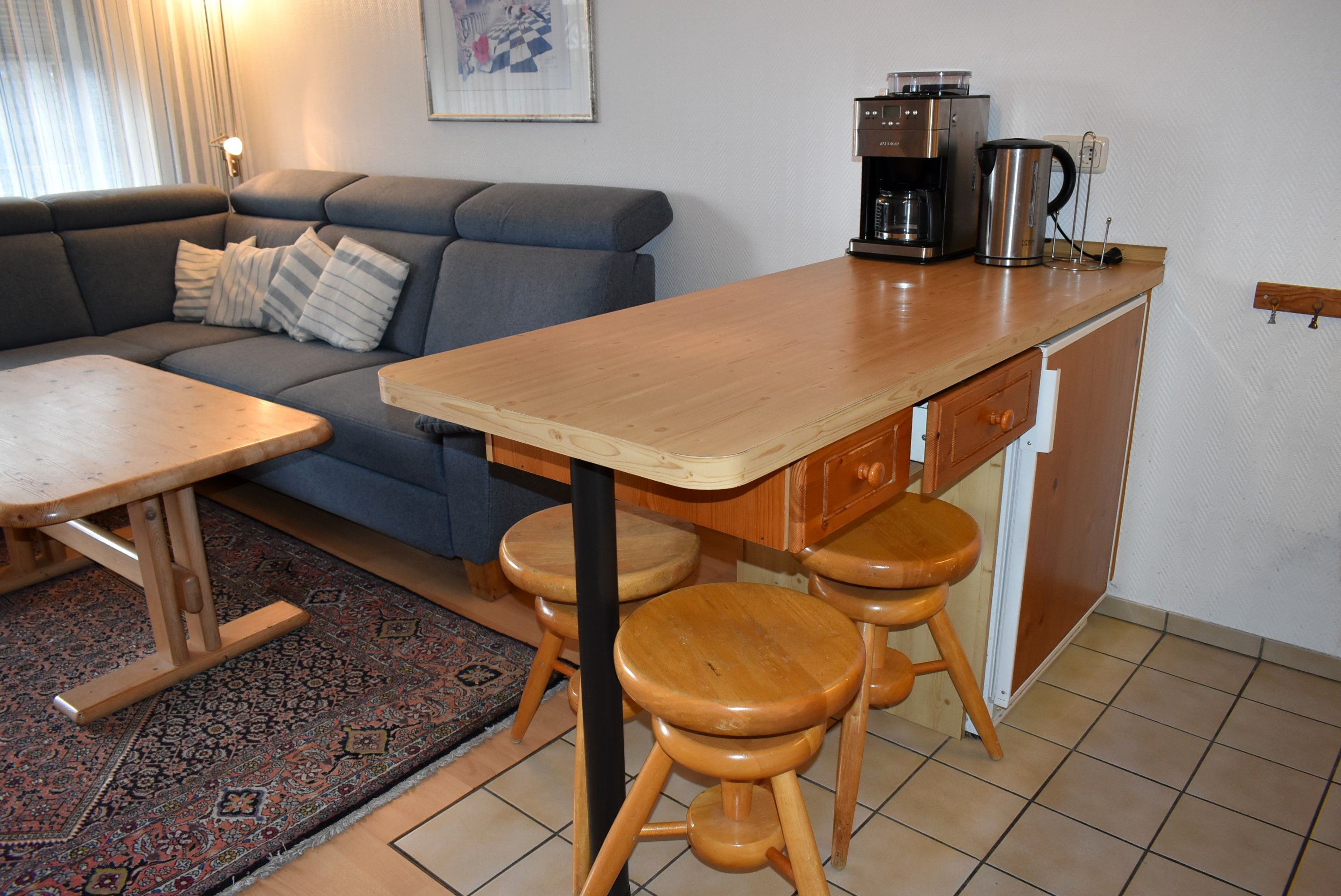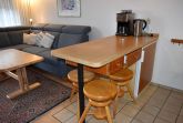 Wohnzimmer: 4 Plattenherd mit Ceranfeld und Backofen, Dunstabzugshaube, Eckschlafcouch, Flachbildschirm, Kabel-TV, Kaffeemaschine, Kochtöpfe, Kühlschrank mit 3* Gefrierfach, Mikrowelle, Plissees, Schrank, Spülmaschine, Stehlampe, Stereoanlage, Toaster, Wasserkocher